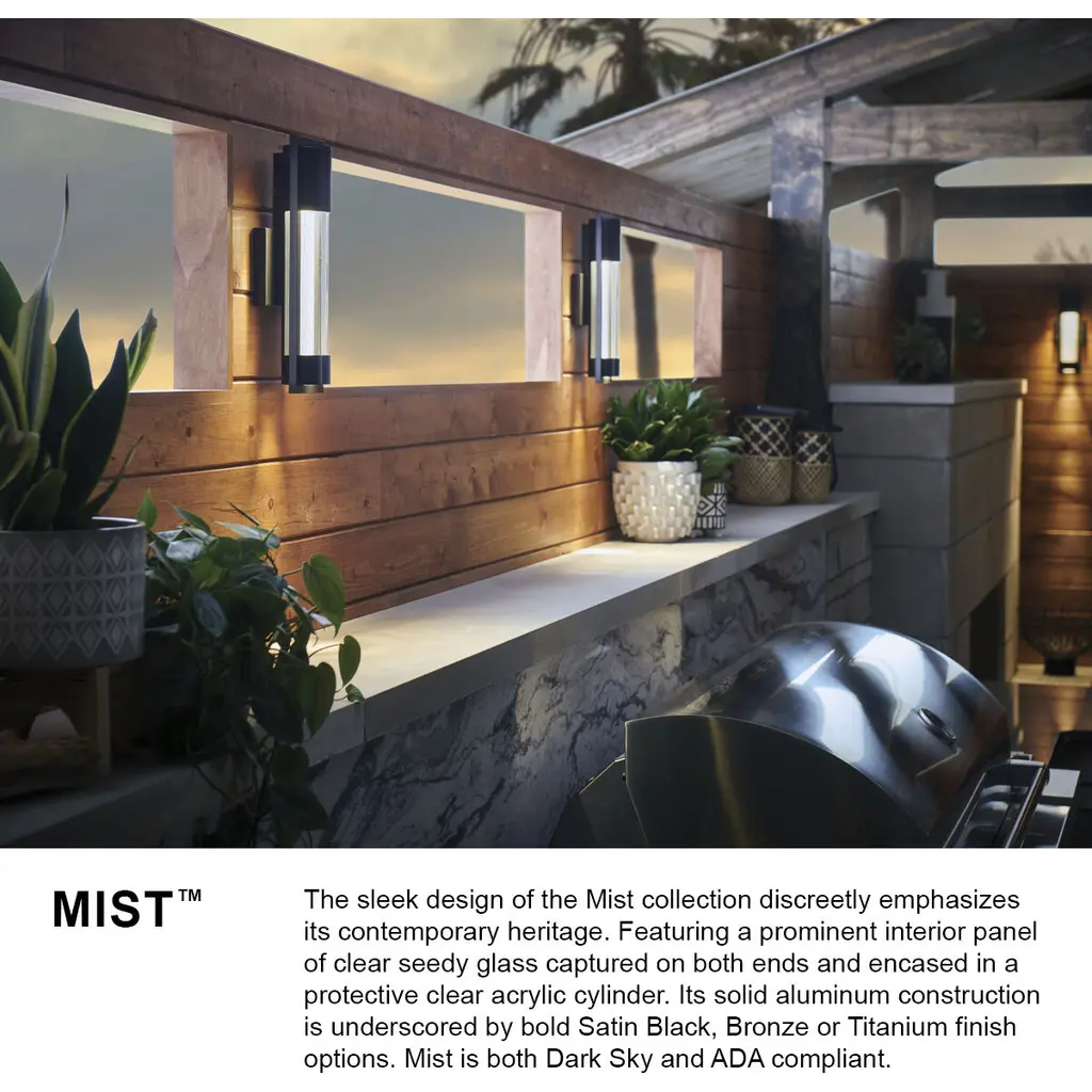 The sleek design of the Mist collection discreetly emphasizes its contemporary heritage. Featuring a prominent interior panel of clear seedy glass captured on both ends and encased in a protective clear acrylic cylinder. Its solid aluminum construction is underscored by the bold Bronze finish option. Mist is both Dark Sky and ADA compliant.