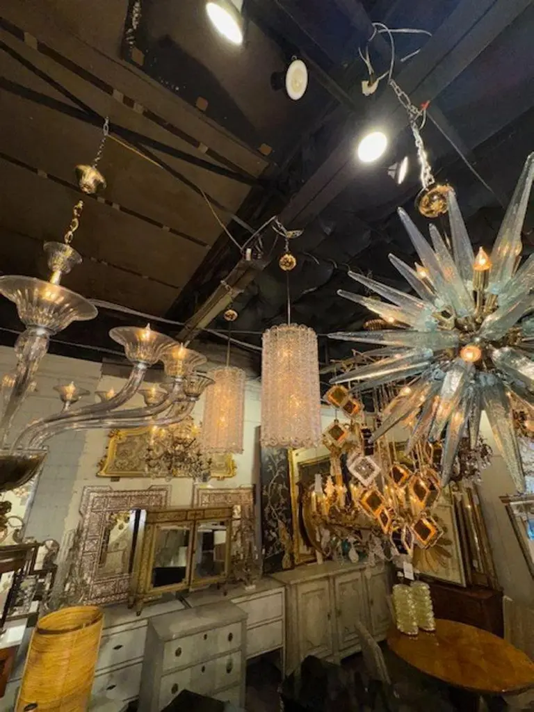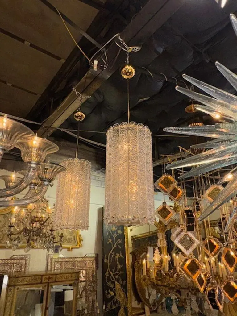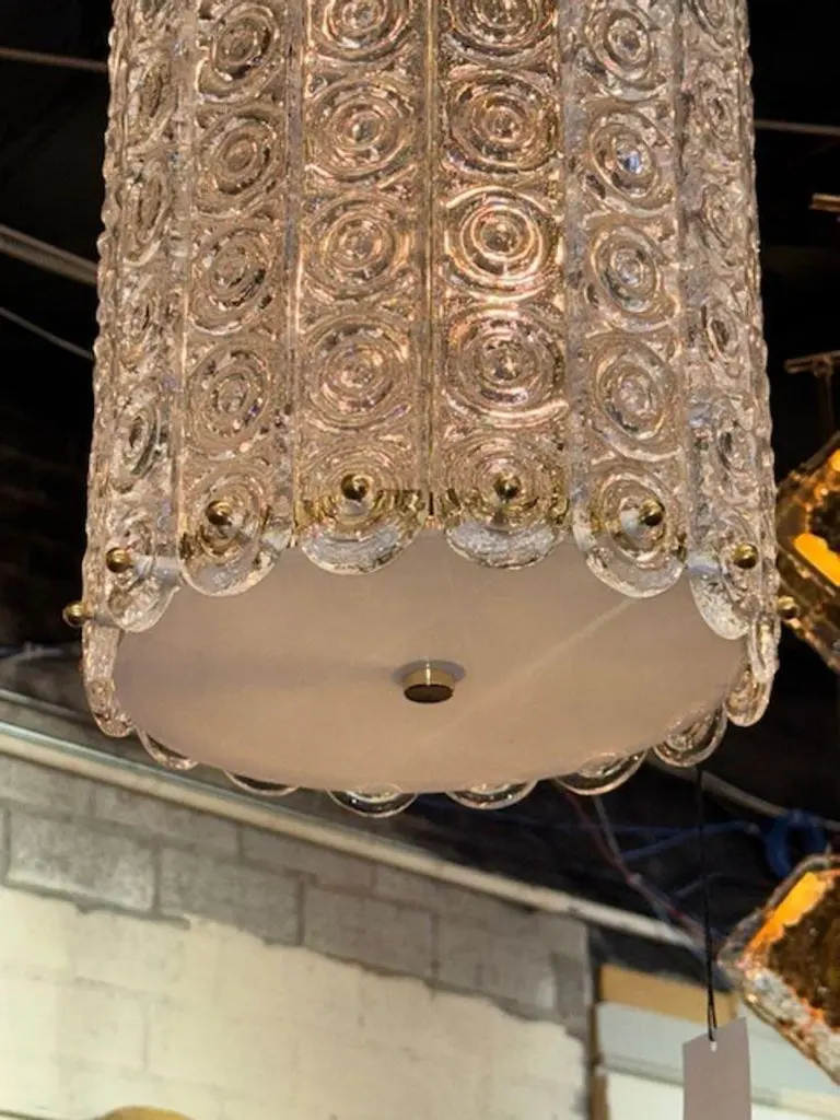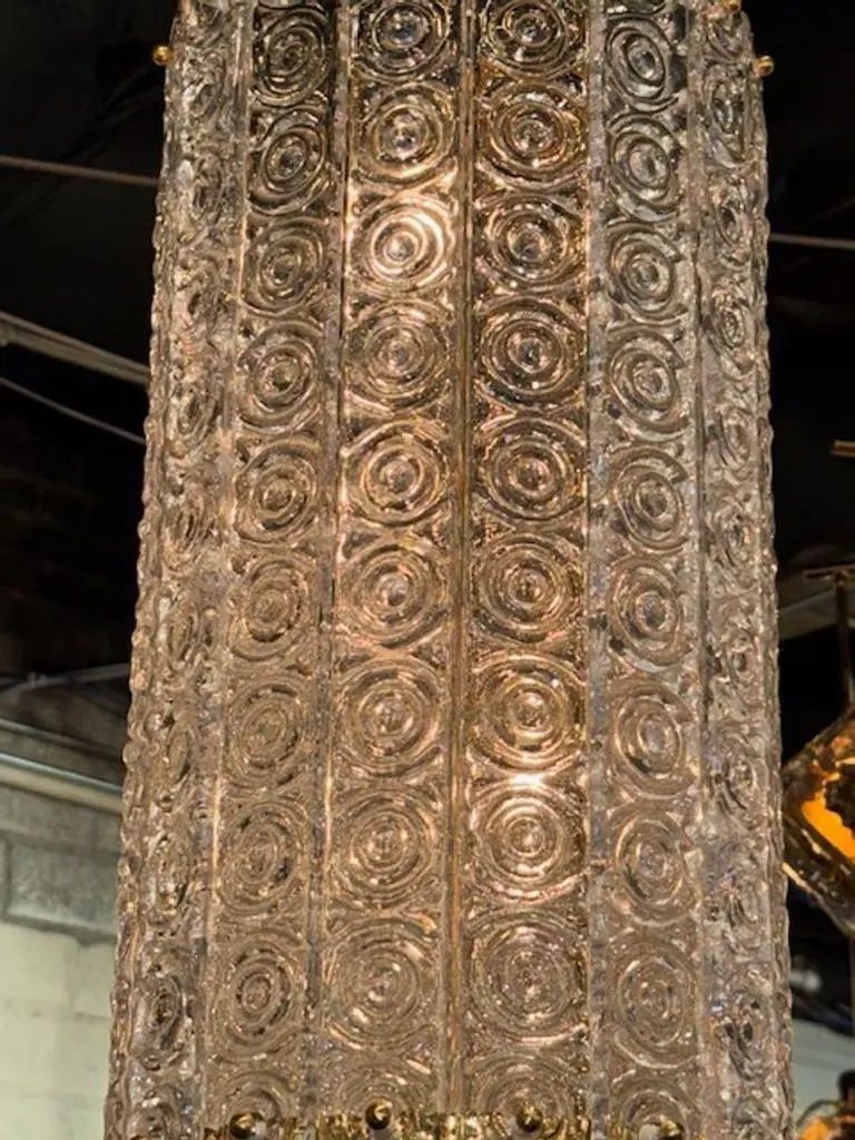 These modern lanterns feature a stylish design with a textured finish, crafted from Murano glass and brass materials. The combination of glass and brass creates a sleek and sophisticated look, suitable for contemporary decor. The lanterns are likely to bring a touch of elegance and luxury to any space, making them a standout collectible piece for those who appreciate fine craftsmanship and modern design. There are 2 available. Priced seperately.40h x 11w