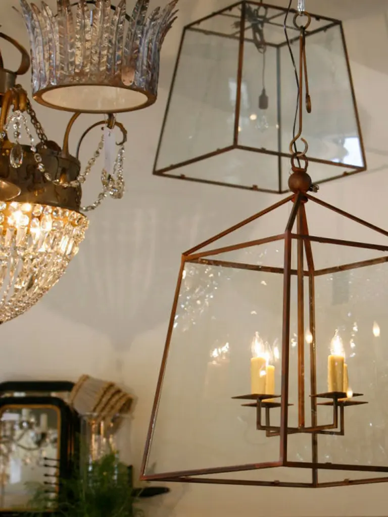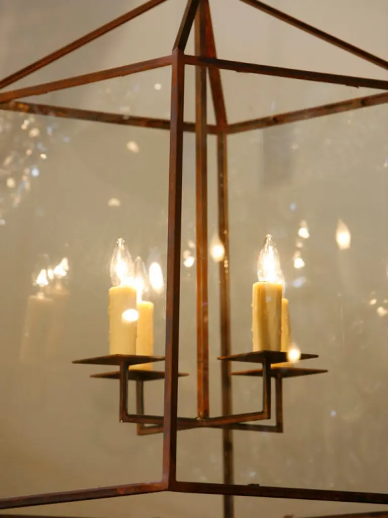 This timeless, large-scale, iron lantern is blacksmith made with tempered glass. It comes with a handmade iron canopy and three feet of iron interlocking shepherd hooks. Custom hand-forged iron bobeche and cluster with four Edison sockets. Newly wired in the US with all UL listed parts. Multiples and custom sizes and finishes available by special order. Price is for one. Additional hooks may be purchased if more than three feet is required. We have also included photos of our single bulb flat top version of this light. The flat top version is also available in four lights for the same price.