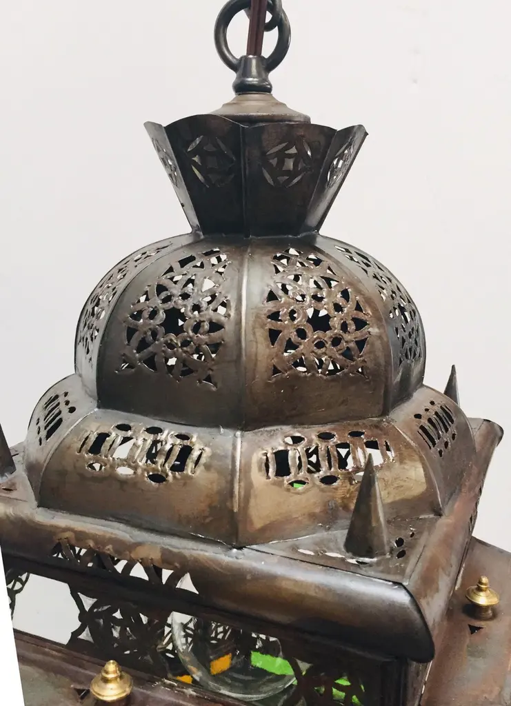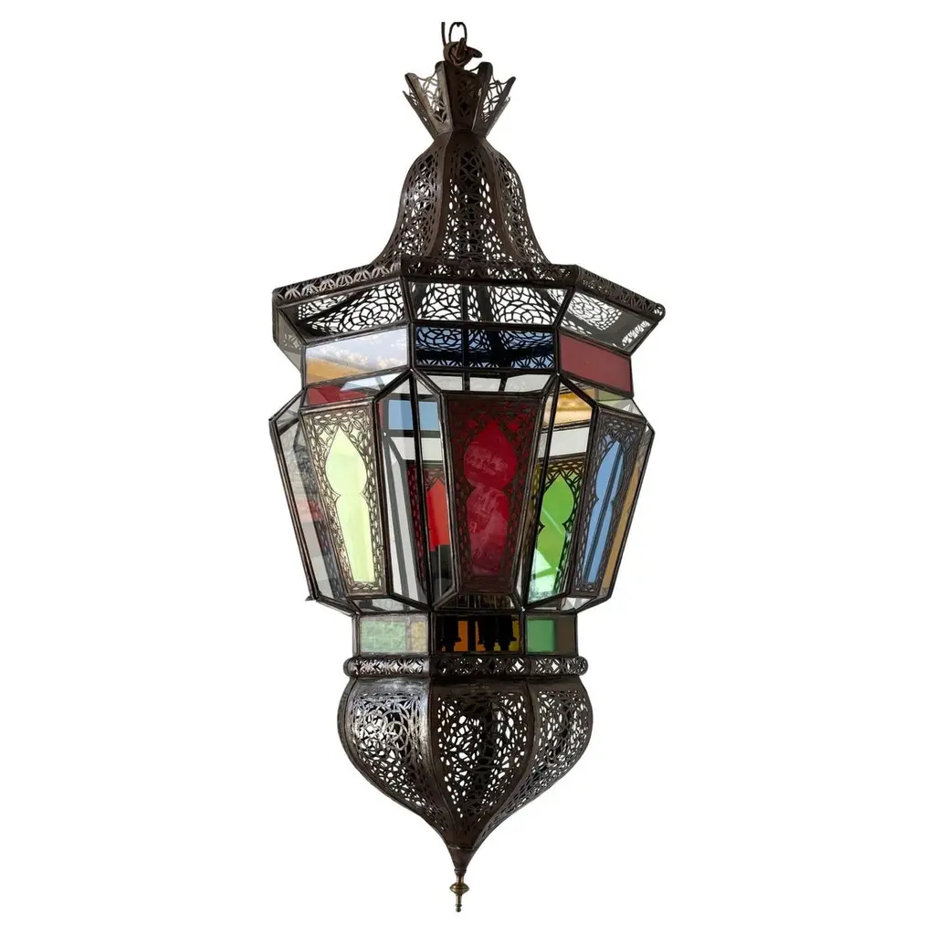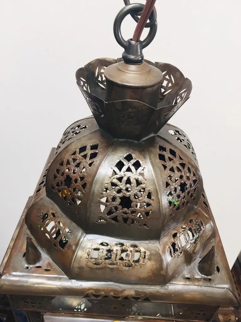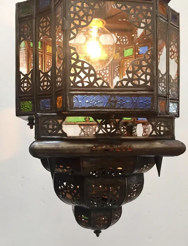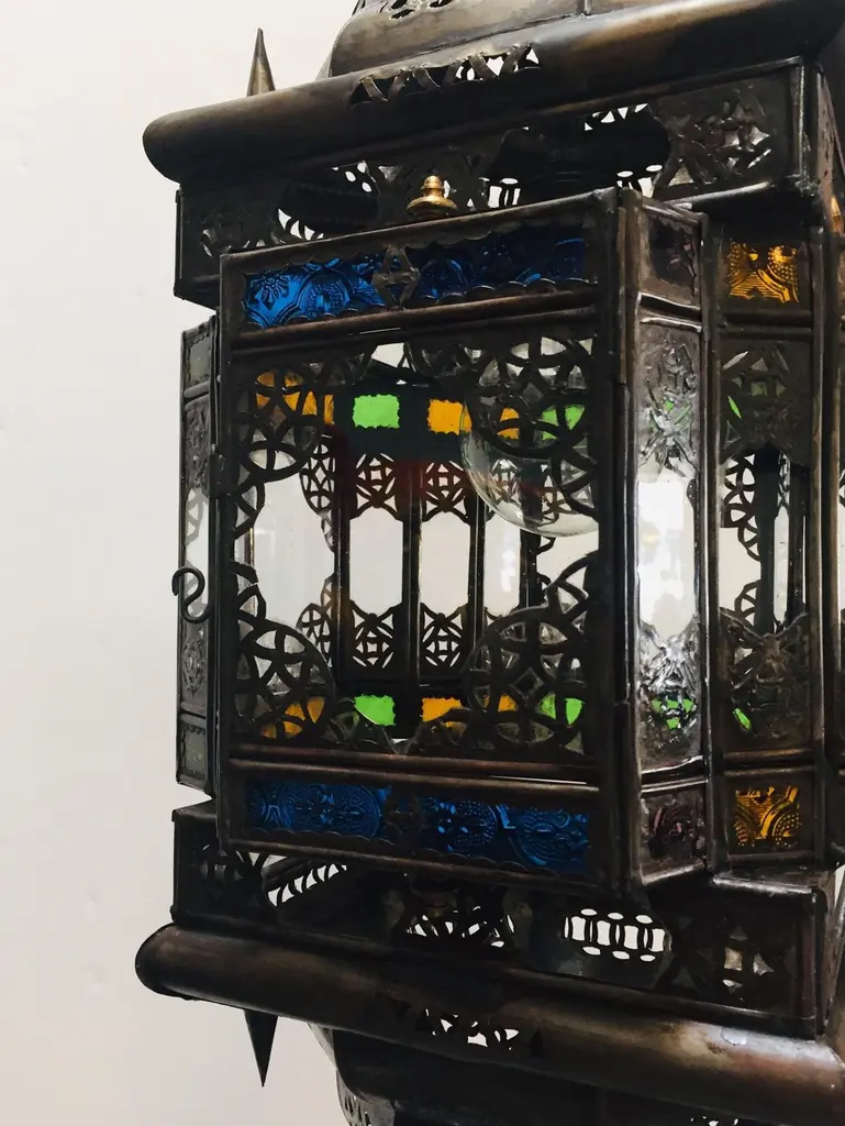 Stylish handcrafted Moroccan pendant with multi-color molded glass and metal with an antique bronze finish.Moorish style with small cut-glass with open metal filigree work Moorish design in diamond shape.Vintage Moroccan Hanging Lantern Clear and Multicolor Glass Made in MarrakechClear and multicolor glass in square shape lantern pendant handcrafted by Moroccan skilled artisans in Marrakech.The metal is hand-cut in floral and geometric Moorish Islamic designs.The lantern is rewired for electricity to use with one light bulb 60 watts max,Moroccan ceiling light fixture, hall lantern, ready to install, comes with matching chains and ceiling canopy.Dark bronze patina metal finish.For indoor use or covered area use only.Dimensions of the body lantern only:Dimensions: 25 inches H x 11 inches square.Chains could be added to your needs.Handmade in Marrakech Morocco.Circa 1999.Chains could be added to your needs.The metal and glass handcrafted lantern from Morocco is a captivating pieces of artistry that combines the rich cultural heritage and exquisite craftsmanship of the region. Its design reflects the traditional Moroccan style, which is renowned for its intricate detailing and vibrant aesthetic.This lantern is meticulously handcrafted using a combination of metal and glass, resulting in a stunning blend of materials that enhances its overall beauty. The framework of the lantern is skillfully constructed from metal which provides a sturdy foundation and intricate patterns.The metalwork adorning the lantern features intricate filigree patterns, geometric motifs, and delicate scrollwork, all meticulously hand-cut by skilled artisans. These ornate designs create mesmerizing shadows when the lantern is illuminated, casting enchanting patterns that dance across the surroundings.The glass components of the lantern add a touch of elegance and brilliance to its appearance. Clear and multicolor glass panels are carefully inserted into the metal framework. These panels may showcase traditional Moroccan geometric designs.When the lantern is lit from within, the glow emanating through the colorful glass panels transforms the surrounding space into a warm and inviting atmosphere. The interplay of light and shadow created by the intricate metalwork and the translucent glass adds depth and allure to the lantern's overall charm.The craftsmanship of this Moroccan lantern is a testament to the dedication and skill of the artisans who meticulously handcraft each piece. The attention to detail, the artistic flair, and the fusion of metal and glass make this lantern a true work of art, capturing the essence of Moroccan culture and heritage.Whether displayed as a centerpiece or hung from a hook, this metal and glass handcrafted lantern from Morocco effortlessly evokes a sense of enchantment, transporting you to the vibrant streets and magical ambiance of Moroccan nights.