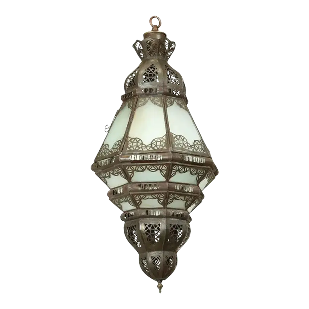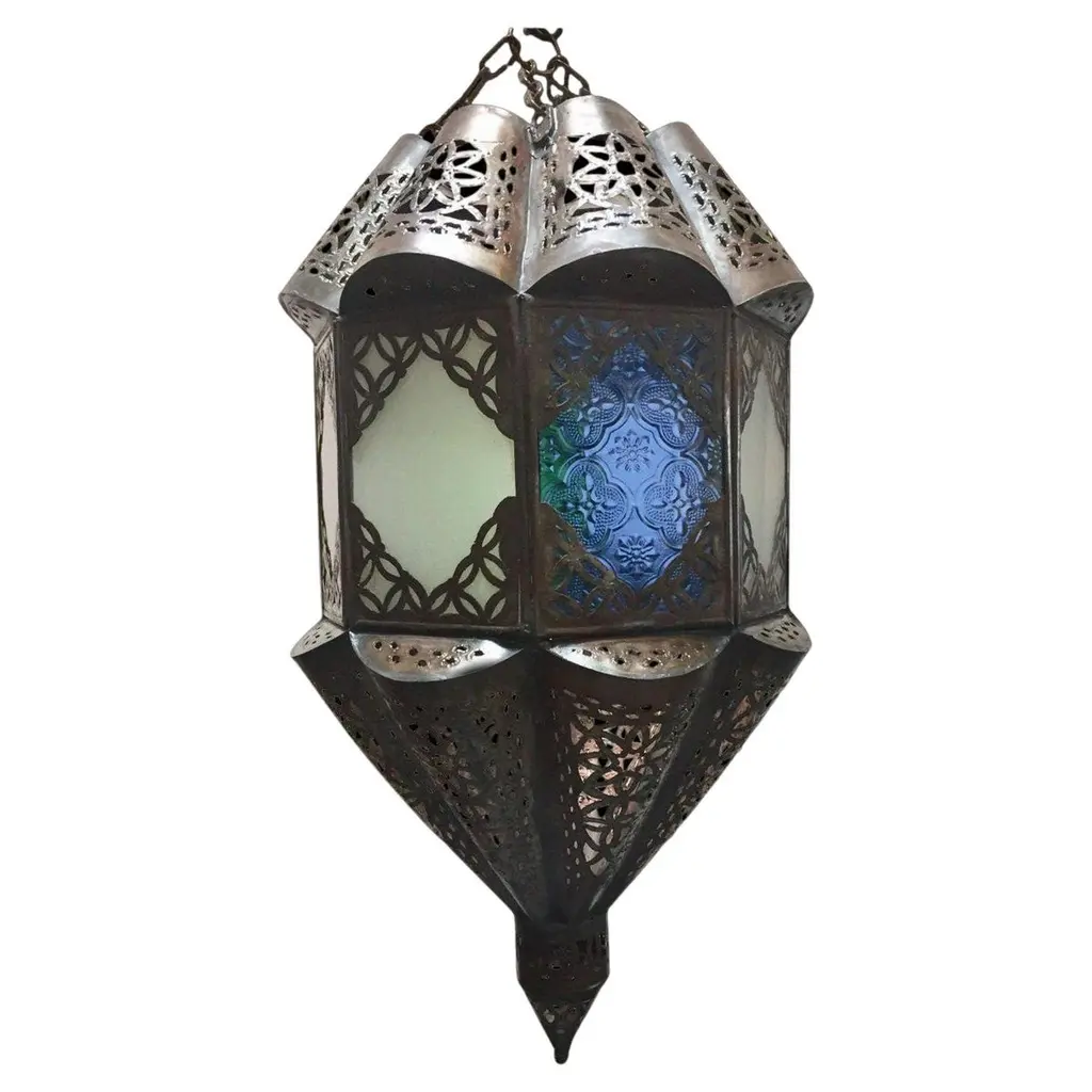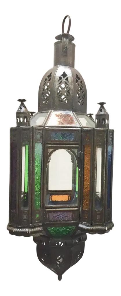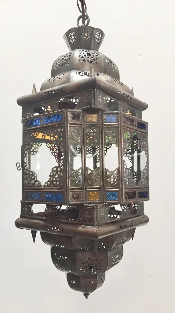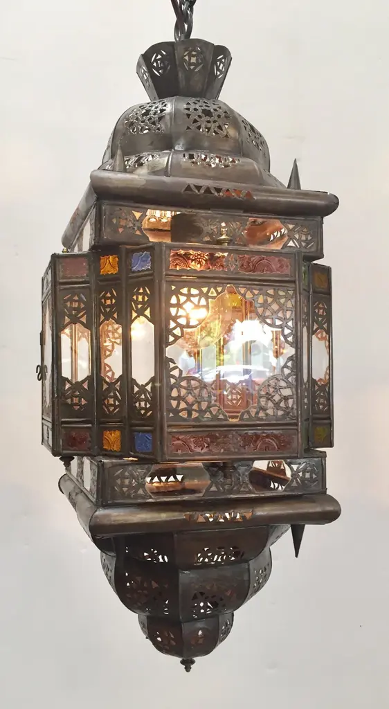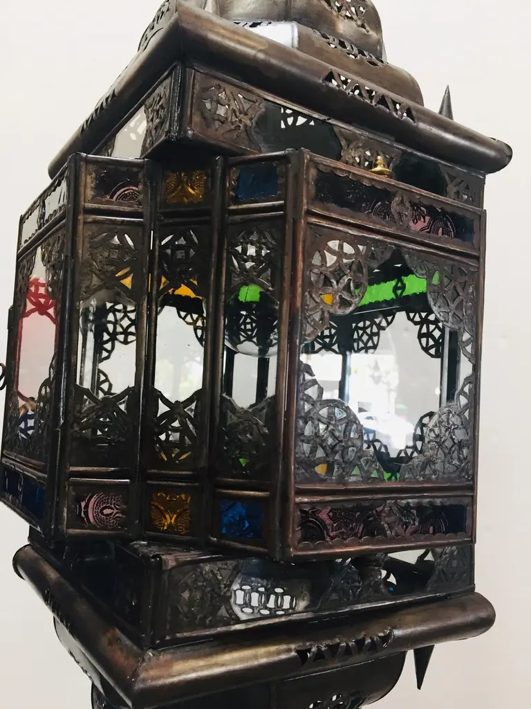 Stylish handcrafted Moroccan pendant with multi-color molded glass and metal with an antique bronze finish.Moorish style with small cut-glass with open metal filigree work Moorish design in diamond shape.Vintage Moroccan Hanging Lantern Clear and Multicolor Glass Made in MarrakechClear and multicolor glass in square shape lantern pendant handcrafted by Moroccan skilled artisans in Marrakech.The metal is hand-cut in floral and geometric Moorish Islamic designs.The lantern is rewired for electricity to use with one light bulb 60 watts max,Moroccan ceiling light fixture, hall lantern, ready to install, comes with matching chains and ceiling canopy.Dark bronze patina metal finish.For indoor use or covered area use only.Dimensions of the body lantern only:Dimensions: 25 inches H x 11 inches square.Chains could be added to your needs.Handmade in Marrakech Morocco.Circa 1999.Chains could be added to your needs.The metal and glass handcrafted lantern from Morocco is a captivating pieces of artistry that combines the rich cultural heritage and exquisite craftsmanship of the region. Its design reflects the traditional Moroccan style, which is renowned for its intricate detailing and vibrant aesthetic.This lantern is meticulously handcrafted using a combination of metal and glass, resulting in a stunning blend of materials that enhances its overall beauty. The framework of the lantern is skillfully constructed from metal which provides a sturdy foundation and intricate patterns.The metalwork adorning the lantern features intricate filigree patterns, geometric motifs, and delicate scrollwork, all meticulously hand-cut by skilled artisans. These ornate designs create mesmerizing shadows when the lantern is illuminated, casting enchanting patterns that dance across the surroundings.The glass components of the lantern add a touch of elegance and brilliance to its appearance. Clear and multicolor glass panels are carefully inserted into the metal framework. These panels may showcase traditional Moroccan geometric designs.When the lantern is lit from within, the glow emanating through the colorful glass panels transforms the surrounding space into a warm and inviting atmosphere. The interplay of light and shadow created by the intricate metalwork and the translucent glass adds depth and allure to the lantern's overall charm.The craftsmanship of this Moroccan lantern is a testament to the dedication and skill of the artisans who meticulously handcraft each piece. The attention to detail, the artistic flair, and the fusion of metal and glass make this lantern a true work of art, capturing the essence of Moroccan culture and heritage.Whether displayed as a centerpiece or hung from a hook, this metal and glass handcrafted lantern from Morocco effortlessly evokes a sense of enchantment, transporting you to the vibrant streets and magical ambiance of Moroccan nights.