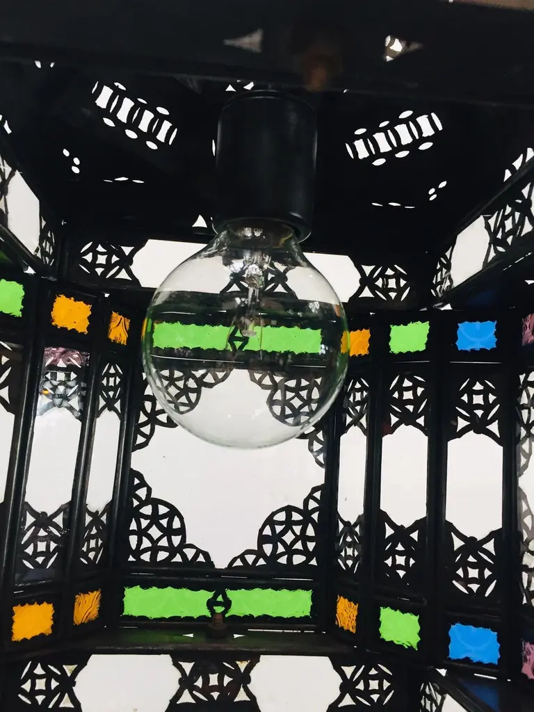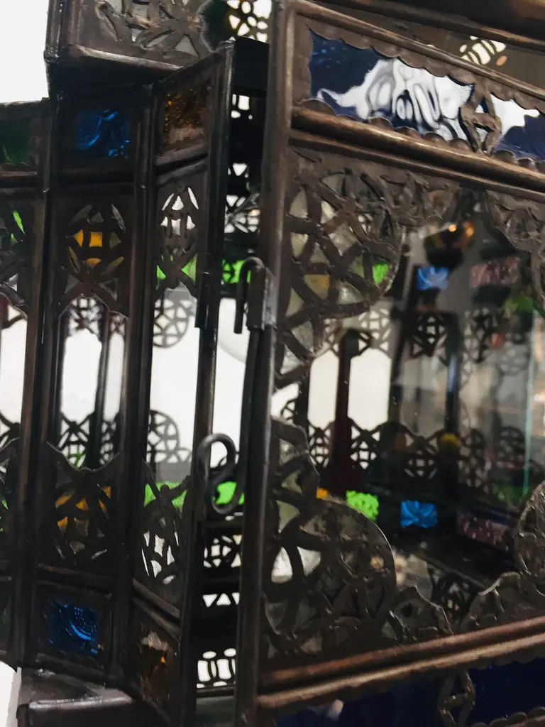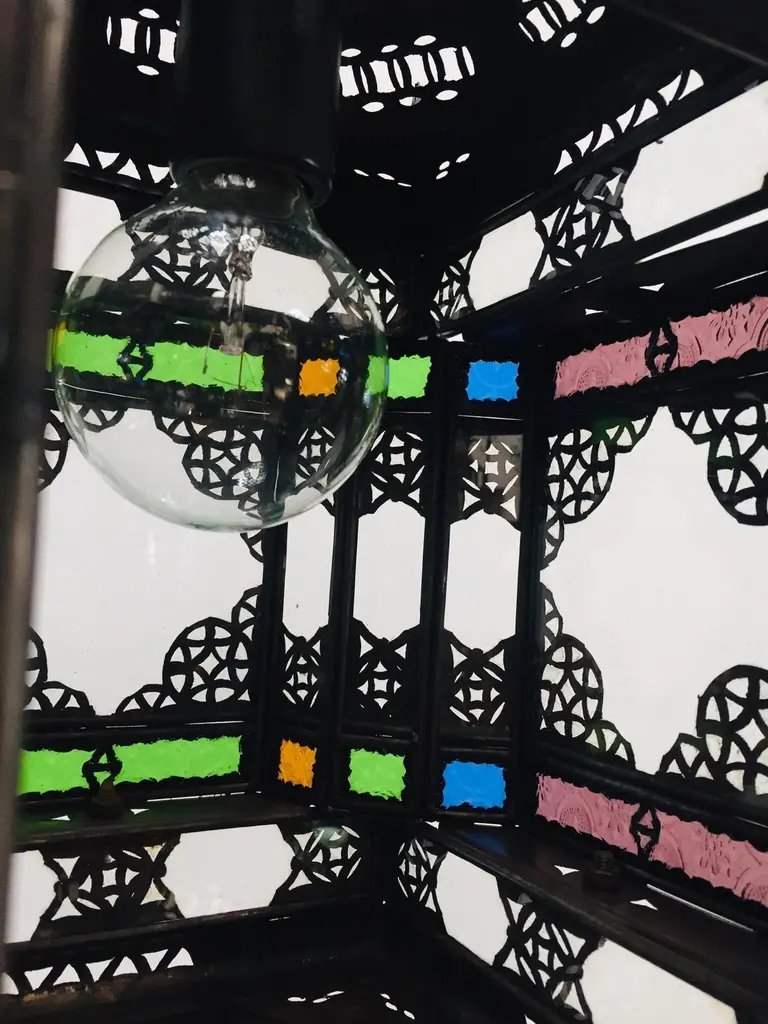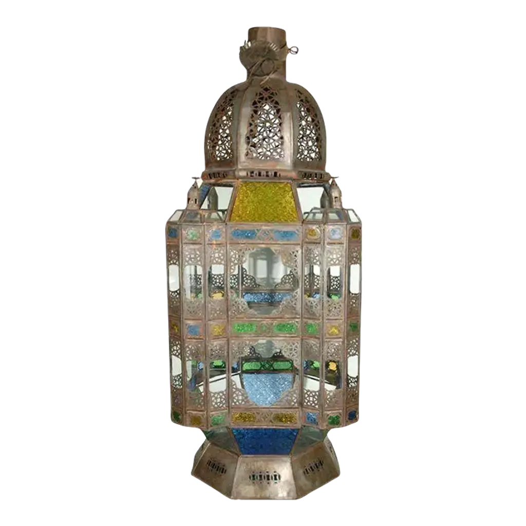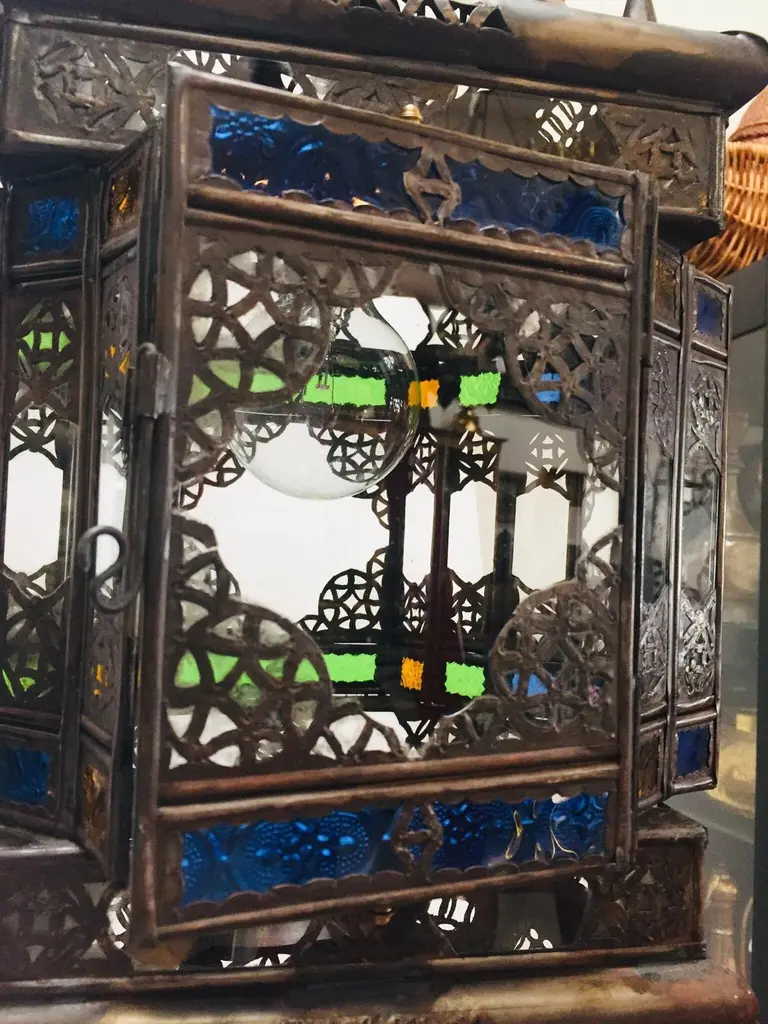 Stylish handcrafted Moroccan pendant with multi-color molded glass and metal with an antique bronze finish.Moorish style with small cut-glass with open metal filigree work Moorish design in diamond shape.Vintage Moroccan Hanging Lantern Clear and Multicolor Glass Made in MarrakechClear and multicolor glass in square shape lantern pendant handcrafted by Moroccan skilled artisans in Marrakech.The metal is hand-cut in floral and geometric Moorish Islamic designs.The lantern is rewired for electricity to use with one light bulb 60 watts max,Moroccan ceiling light fixture, hall lantern, ready to install, comes with matching chains and ceiling canopy.Dark bronze patina metal finish.For indoor use or covered area use only.Dimensions of the body lantern only:Dimensions: 25 inches H x 11 inches square.Chains could be added to your needs.Handmade in Marrakech Morocco.Circa 1999.Chains could be added to your needs.The metal and glass handcrafted lantern from Morocco is a captivating pieces of artistry that combines the rich cultural heritage and exquisite craftsmanship of the region. Its design reflects the traditional Moroccan style, which is renowned for its intricate detailing and vibrant aesthetic.This lantern is meticulously handcrafted using a combination of metal and glass, resulting in a stunning blend of materials that enhances its overall beauty. The framework of the lantern is skillfully constructed from metal which provides a sturdy foundation and intricate patterns.The metalwork adorning the lantern features intricate filigree patterns, geometric motifs, and delicate scrollwork, all meticulously hand-cut by skilled artisans. These ornate designs create mesmerizing shadows when the lantern is illuminated, casting enchanting patterns that dance across the surroundings.The glass components of the lantern add a touch of elegance and brilliance to its appearance. Clear and multicolor glass panels are carefully inserted into the metal framework. These panels may showcase traditional Moroccan geometric designs.When the lantern is lit from within, the glow emanating through the colorful glass panels transforms the surrounding space into a warm and inviting atmosphere. The interplay of light and shadow created by the intricate metalwork and the translucent glass adds depth and allure to the lantern's overall charm.The craftsmanship of this Moroccan lantern is a testament to the dedication and skill of the artisans who meticulously handcraft each piece. The attention to detail, the artistic flair, and the fusion of metal and glass make this lantern a true work of art, capturing the essence of Moroccan culture and heritage.Whether displayed as a centerpiece or hung from a hook, this metal and glass handcrafted lantern from Morocco effortlessly evokes a sense of enchantment, transporting you to the vibrant streets and magical ambiance of Moroccan nights.