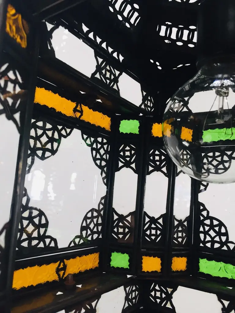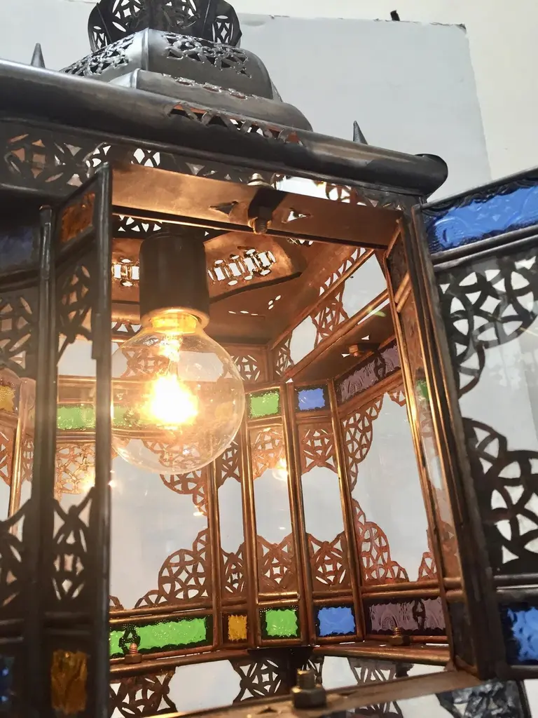 Moroccan Hall Lantern Light Fixture With Multi-Color Glass Moorish Style