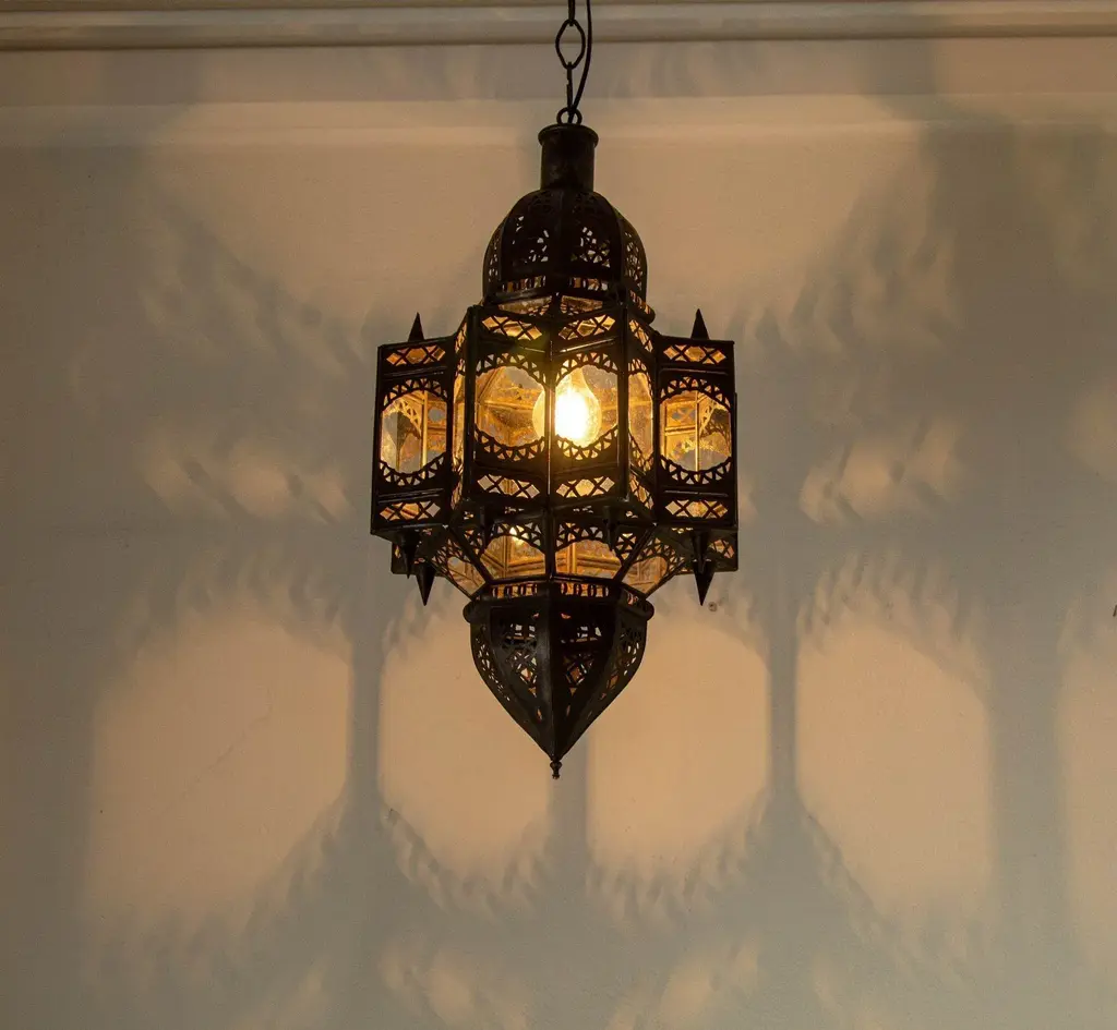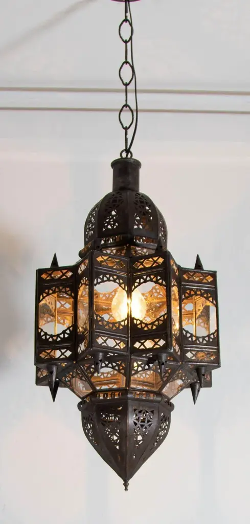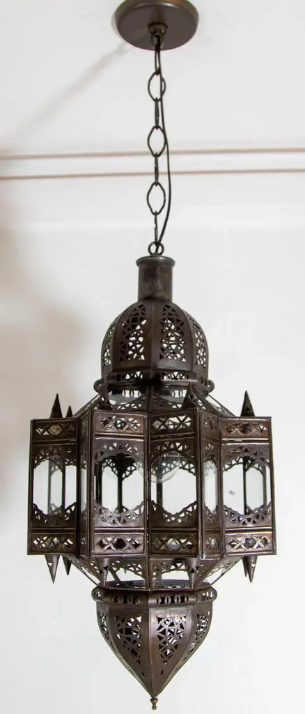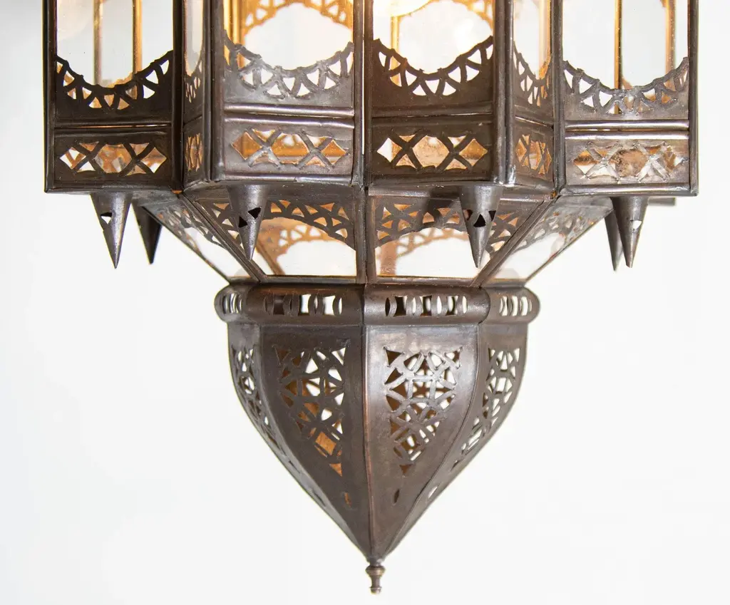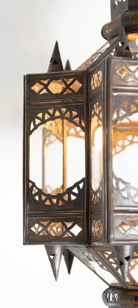 Vintage Moroccan Moorish star shape in clear glass and metal lantern. Clear Glass star shape lantern pendant handcrafted by Moroccan skilled artisans in Marrakech. The metal is hand-cut in floral and geometric Moorish Islamic designs. The lantern is rewired for electricity to use with one light bulb 60 watts max, Ready to install, comes with chains and ceiling canopy. Dark bronze patina metal finish. For indoor use or covered area use only. Dimensions of the body lantern only: Dimensions: 24 inches H x 12 inches diameter. Dimensions are without chains and ceiling canopy. Chains could be added to your needs. Handmade in Marrakech Morocco. Circa 1999. The metal and glass handcrafted lantern from Morocco is a captivating pieces of artistry that combines the rich cultural heritage and exquisite craftsmanship of the region. Its design reflects the traditional Moroccan style, which is renowned for its intricate detailing and vibrant aesthetic. This lantern is meticulously handcrafted using a combination of metal and glass, resulting in a stunning blend of materials that enhances its overall beauty. The framework of the lantern is skillfully constructed from metal which provides a sturdy foundation and intricate patterns. The metalwork adorning the lantern features intricate filigree patterns, geometric motifs, and delicate scrollwork, all meticulously hand-cut by skilled artisans. These ornate designs create mesmerizing shadows when the lantern is illuminated, casting enchanting patterns that dance across the surroundings. The glass components of the lantern add a touch of elegance and brilliance to its appearance. Clear glass panels are carefully inserted into the metal framework. These panels may showcase traditional Moroccan geometric designs. When the lantern is lit from within, the glow emanating through the colorful glass panels transforms the surrounding space into a warm and inviting atmosphere. The interplay of light and shadow created by the intricate metalwork and the translucent glass adds depth and allure to the lantern's overall charm. The craftsmanship of this Moroccan lantern is a testament to the dedication and skill of the artisans who meticulously handcraft each piece. The attention to detail, the artistic flair, and the fusion of metal and glass make this lantern a true work of art, capturing the essence of Moroccan culture and heritage. Whether displayed as a centerpiece or hung from a hook, this metal and glass handcrafted lantern from Morocco effortlessly evokes a sense of enchantment, transporting you to the vibrant streets and magical ambiance of Moroccan nights.