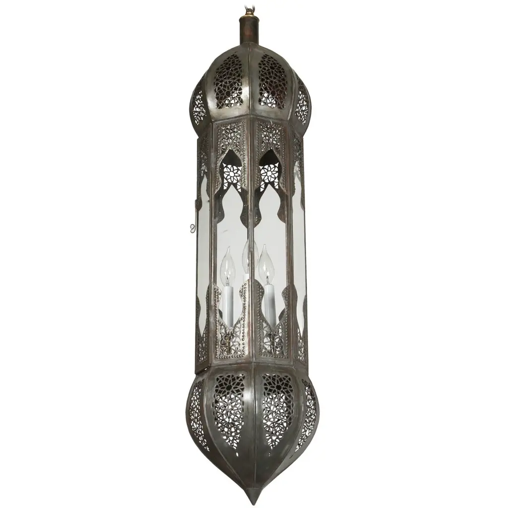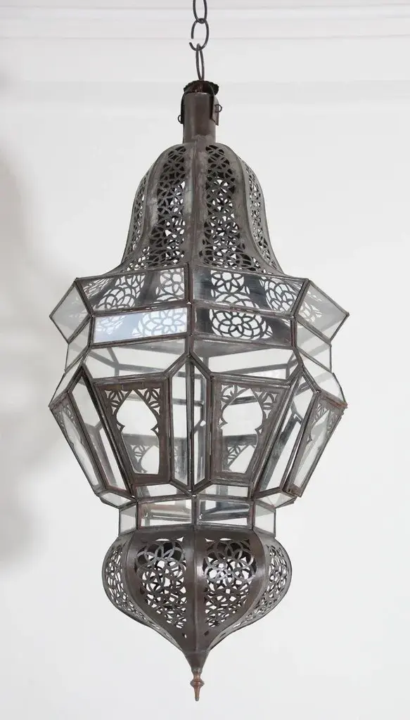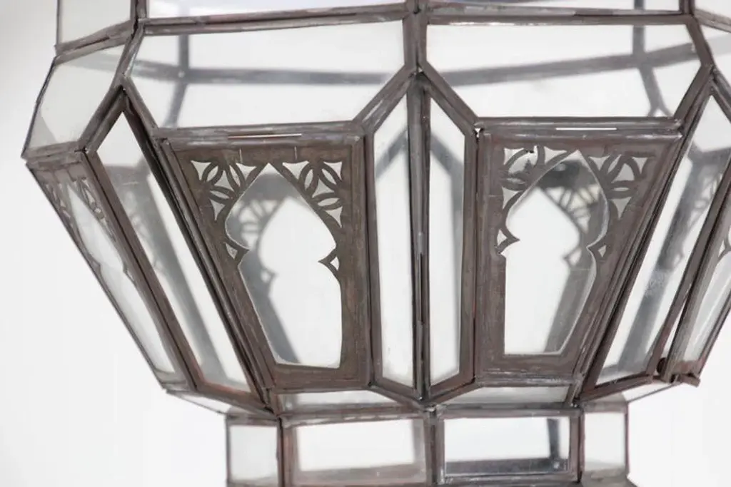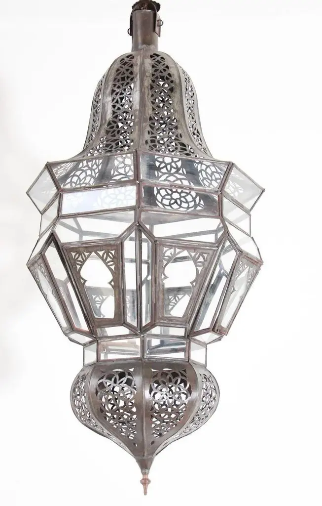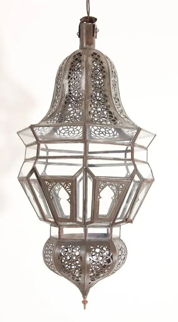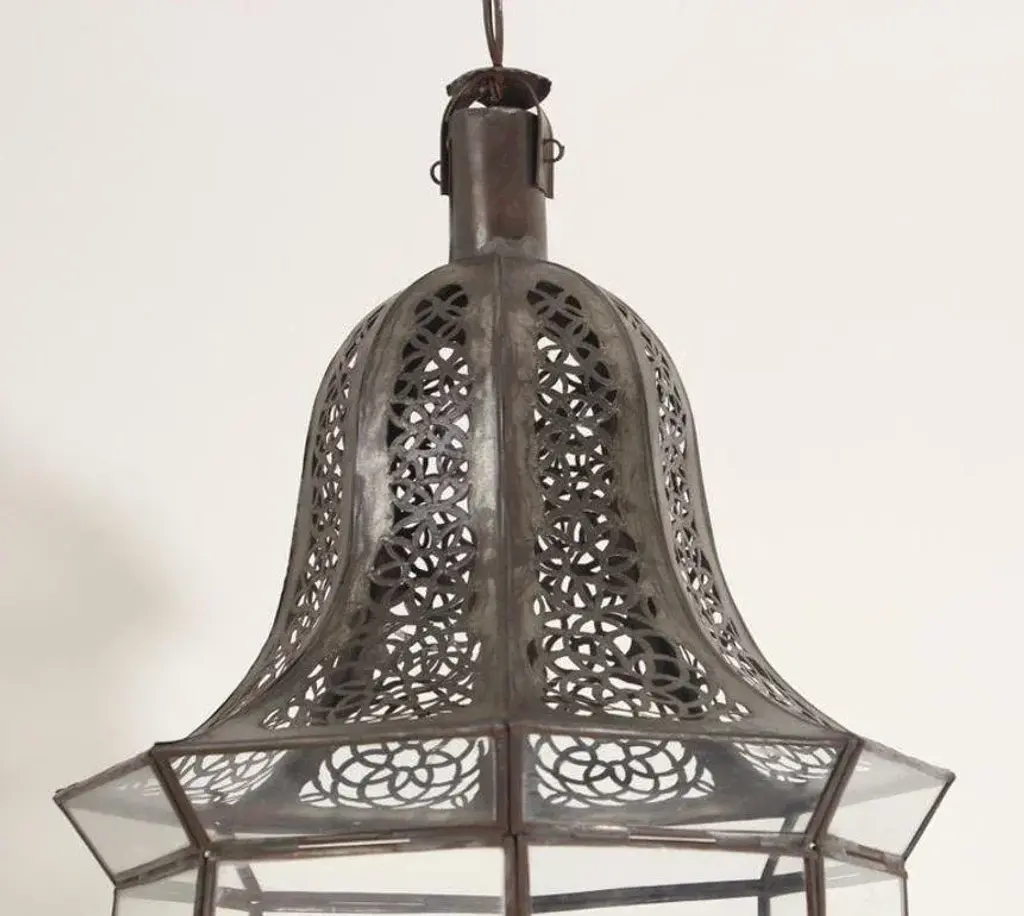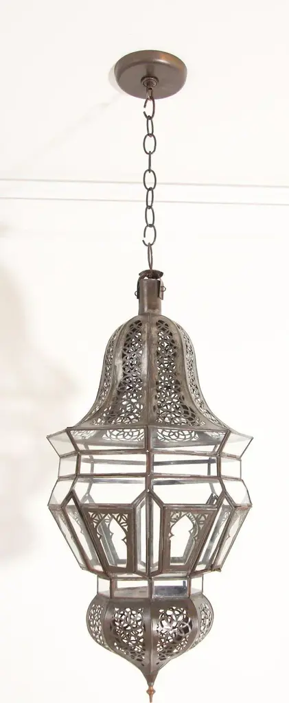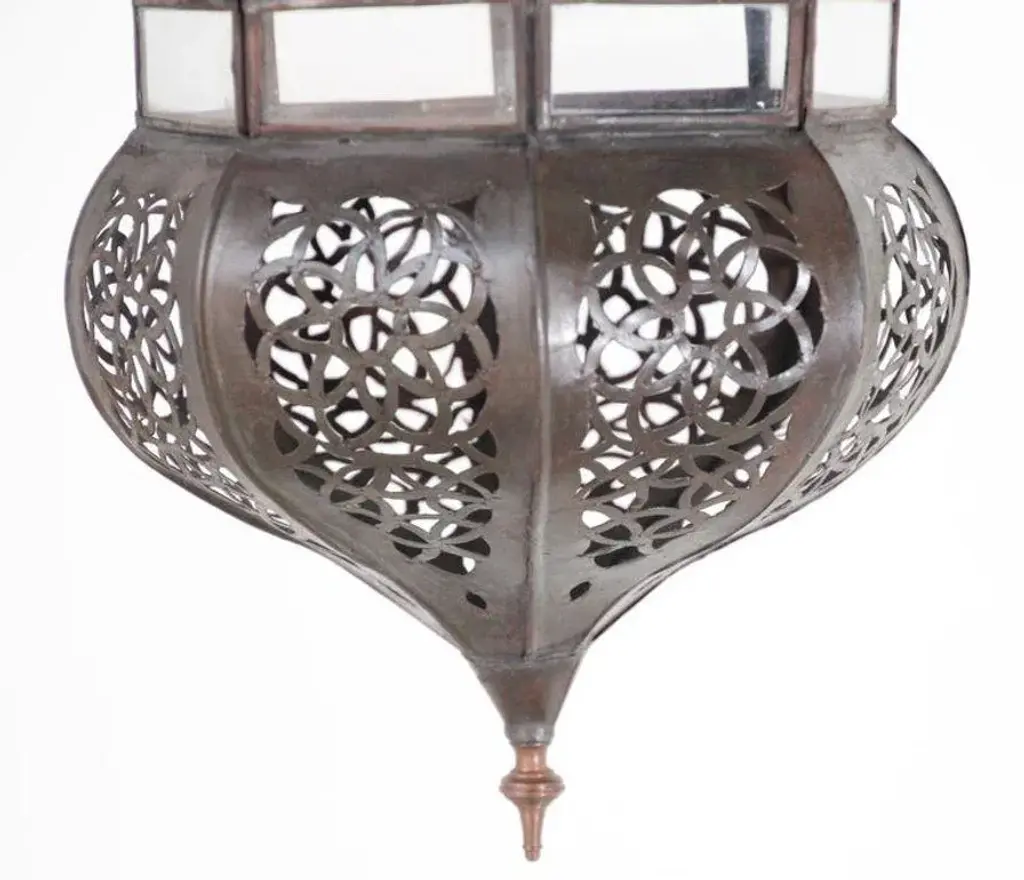 Moroccan Moorish clear glass with intricate metal filigree hanging Harem lantern. Moroccan Hanging Glass Lantern delicately handcrafted by artisans in Morocco. Bronze metal color finish. This is just a lantern shade. Does not come with any electrical wiring, no chains, no ceiling canopy. Not wire for electricity but easy to have it rewired. Arts & Crafts, handmade by skilled Moroccan artisans in Marrakech. 27" H x 13" widest part. For indoor or covered area use only. About the Moroccan lanterns: The metal and glass hand-crafted lantern from Morocco is a captivating pieces of artistry that combines the rich cultural heritage and exquisite craftsmanship of the region. Its design reflects the traditional Moroccan style, which is renowned for its intricate detailing and vibrant aesthetic. This vintage Moroccan lantern is meticulously handcrafted using a combination of metal and glass, resulting in a stunning blend of materials that enhances its overall beauty. The framework of the Moorish lantern is skillfully constructed from metal which provides a sturdy foundation and intricate patterns. The metalwork adorning the Moroccan light fixture features intricate filigree patterns, geometric motifs, and delicate scrollwork, all meticulously hand-cut by skilled Moroccan artisans in Marrakech. These ornate Moorish designs create mesmerizing shadows when the Moroccan hanging lantern is illuminated, casting enchanting patterns that dance across the surroundings. The glass components of the Moroccan lantern add a touch of elegance and brilliance to its appearance. Clear and multicolor glass panels are carefully inserted into the metal framework. These panels may showcase traditional Moroccan geometric Islamic designs. When the Moroccan lantern is lit from within, the glow emanating through the colorful glass panels transforms the surrounding space into a warm and inviting atmosphere. The interplay of light and shadow created by the intricate metalwork and the translucent glass adds depth and allure to the lantern's overall charm. The craftsmanship of this Moroccan light fixture is a testament to the dedication and skill of the artisans who meticulously handcraft each piece. The attention to detail, the artistic flair, and the fusion of metal and glass make this Moroccan lantern a true work of art, capturing the essence of Moroccan culture and heritage. Whether displayed as a centerpiece or hung from a hook, this metal and glass handcrafted lantern from Morocco effortlessly evokes a sense of enchantment, transporting you to the vibrant streets and magical ambiance of Moroccan nights.