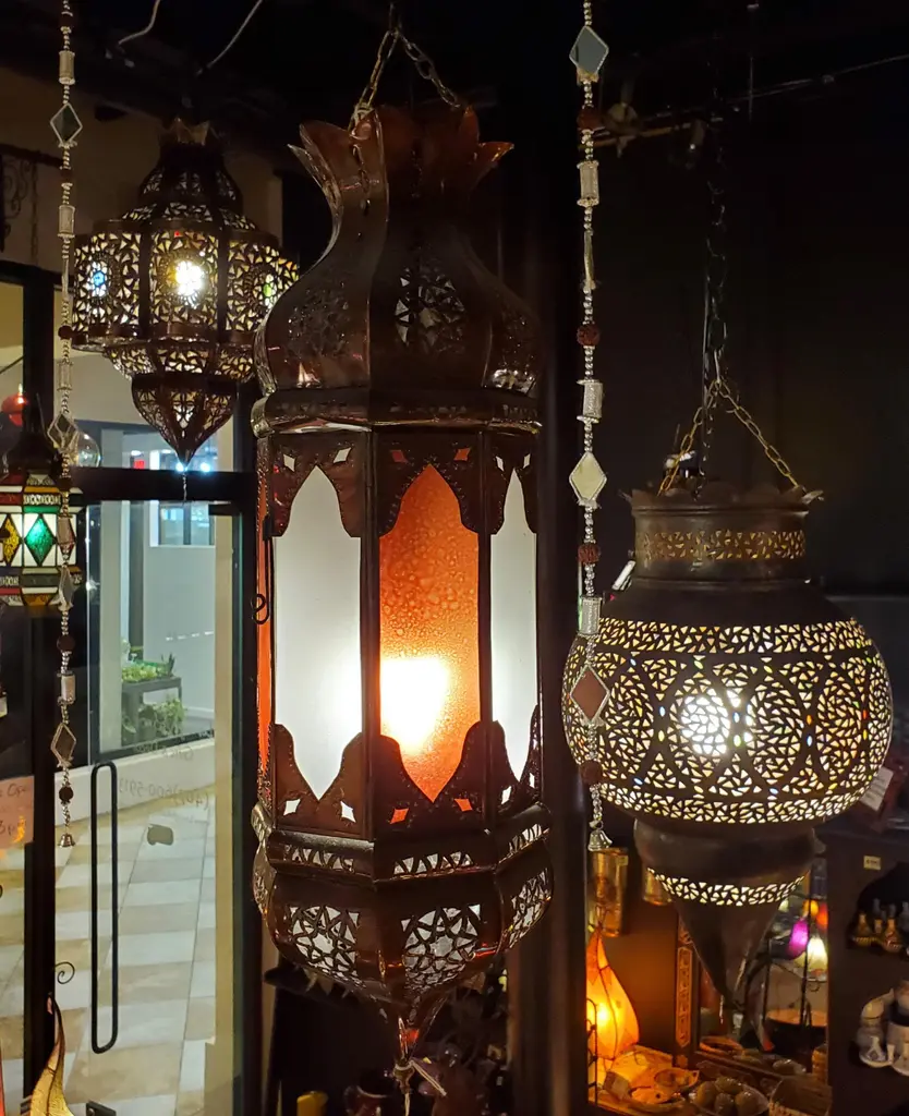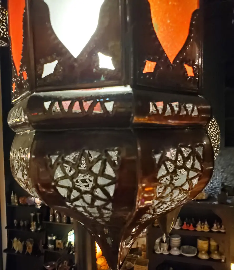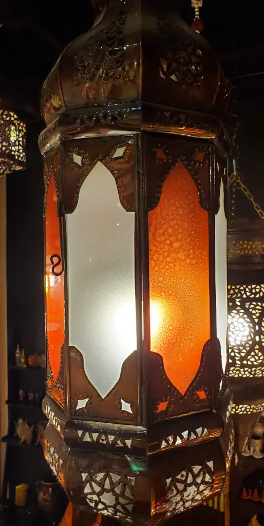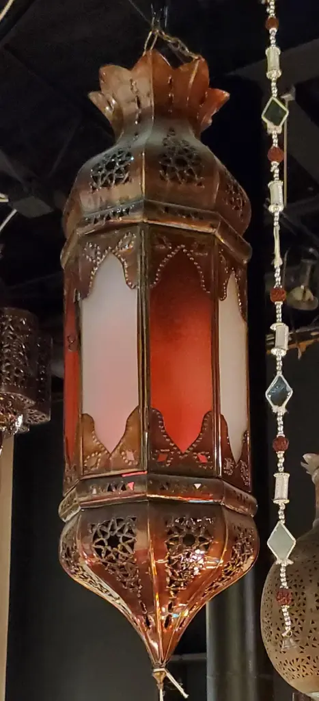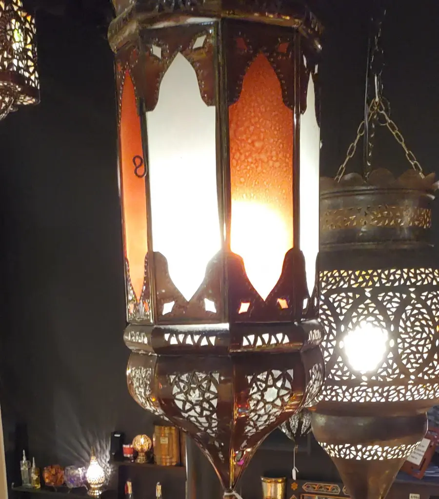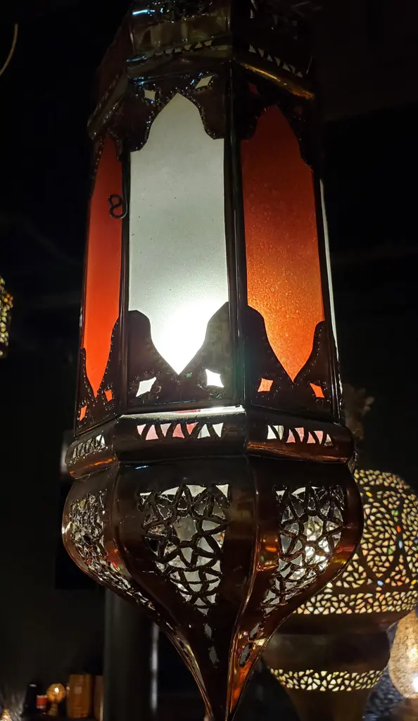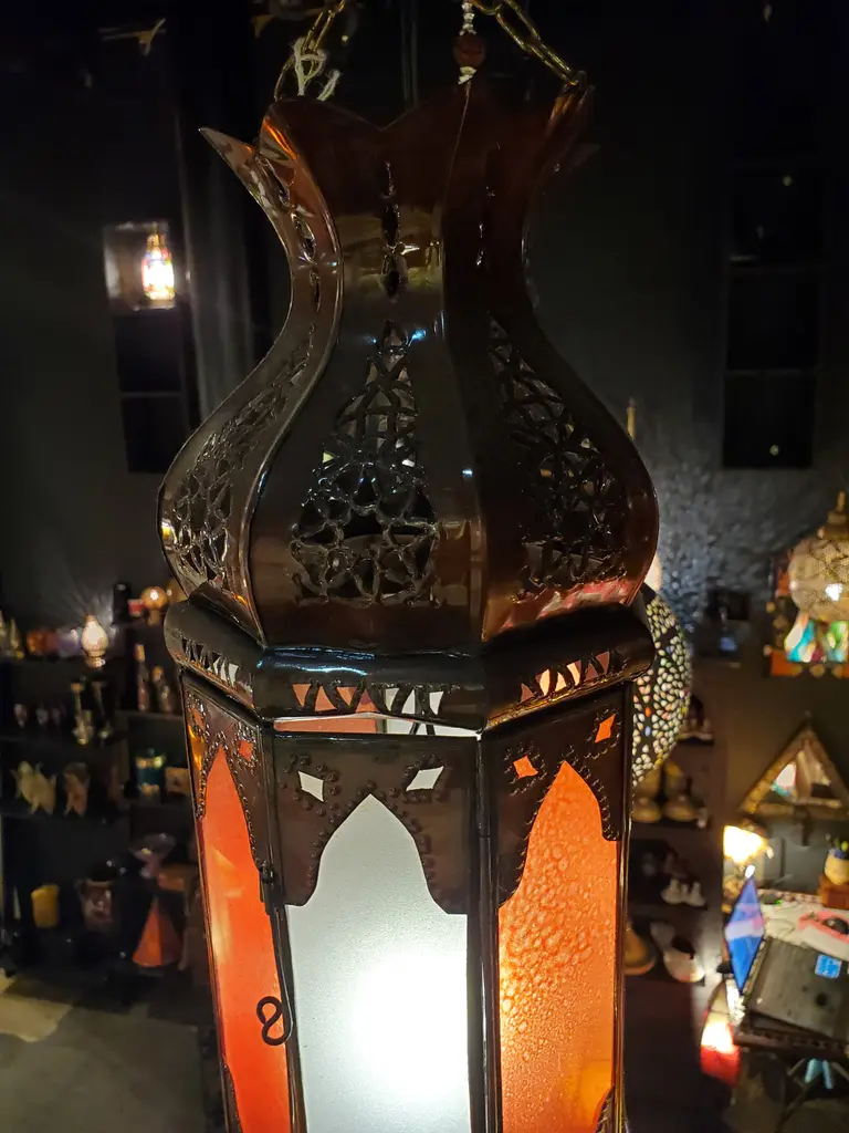 Beautiful handmade Moroccan lantern with burnt and frosty white color glass, made of sturdy metal, rustic copper finish, and measuring around 20" in height and 7" in width. Excellent addition to your décor. Please use the "Ask the Seller" feature if you have any questions.