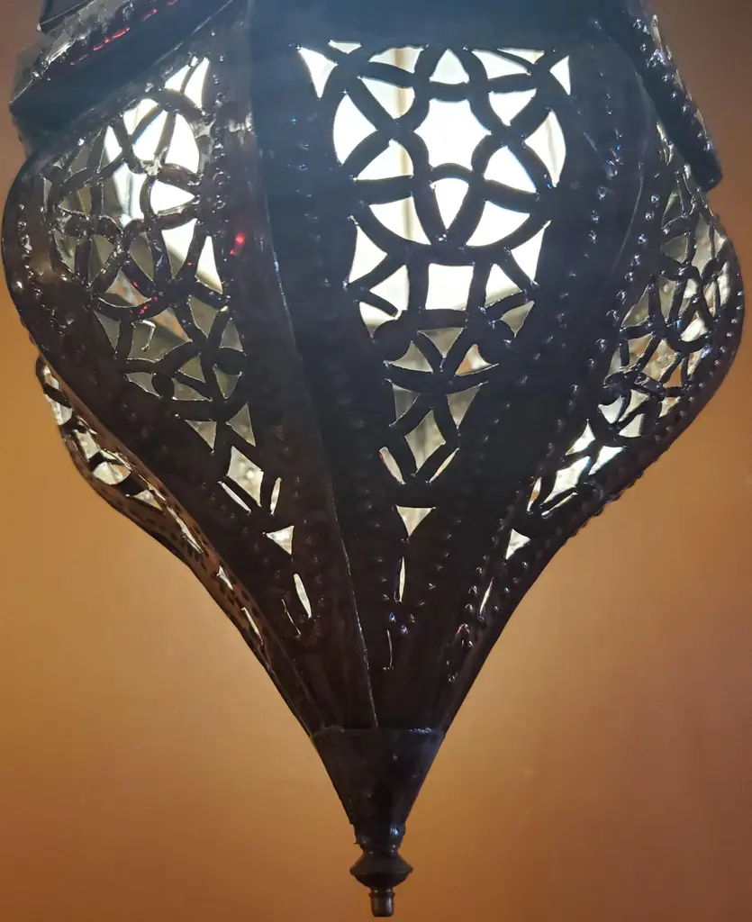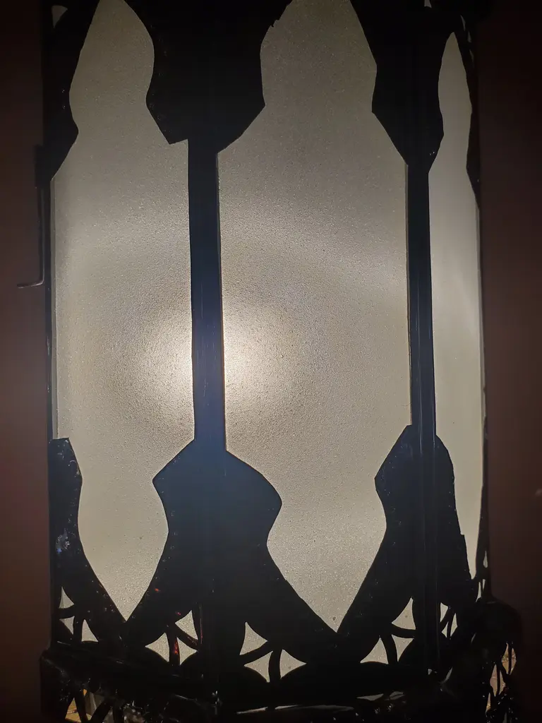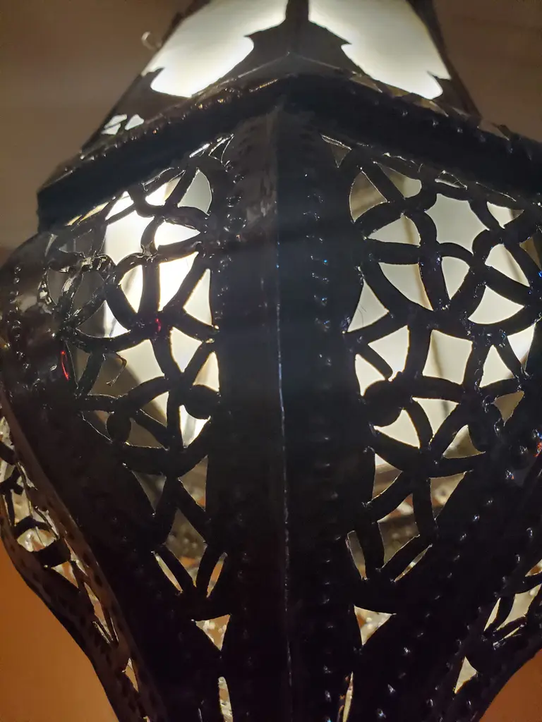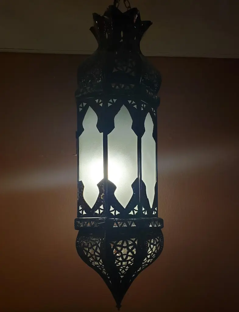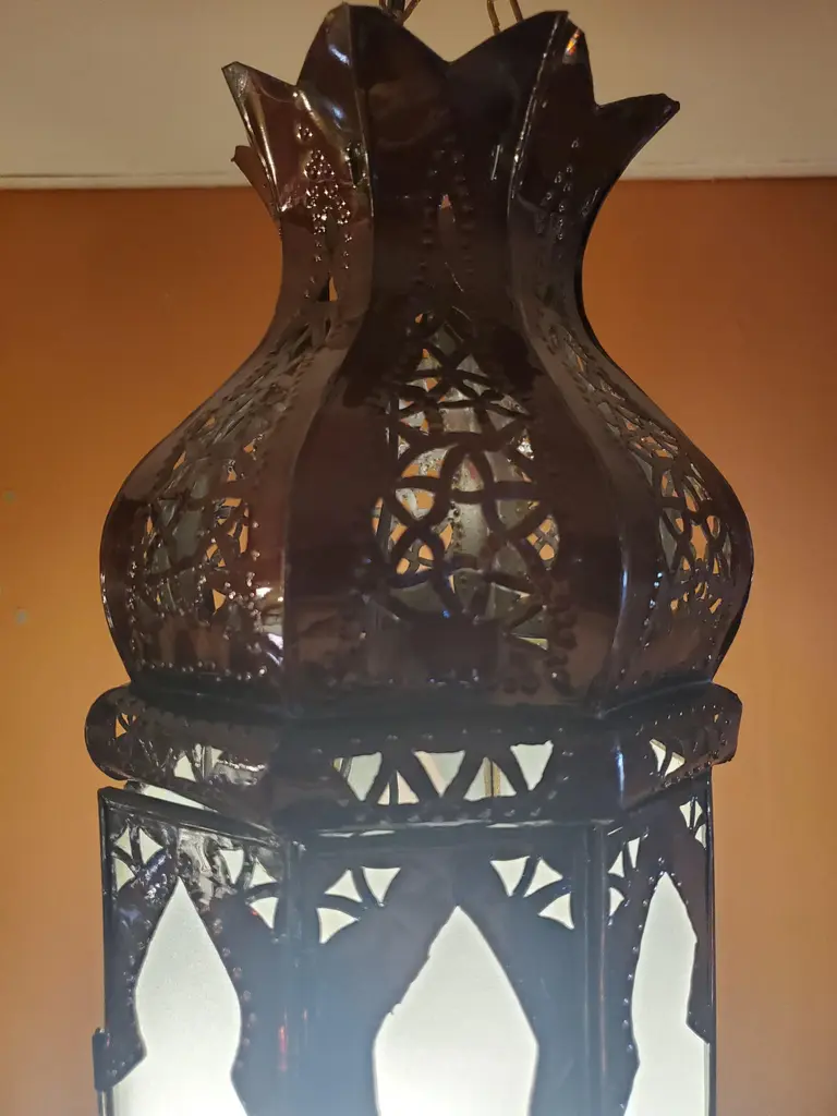 Beautiful handmade Moroccan lantern with frosty white color glass, made of sturdy metal, rustic copper finish, and measuring around 20" in height and 7" in width. Excellent addition to your décor.