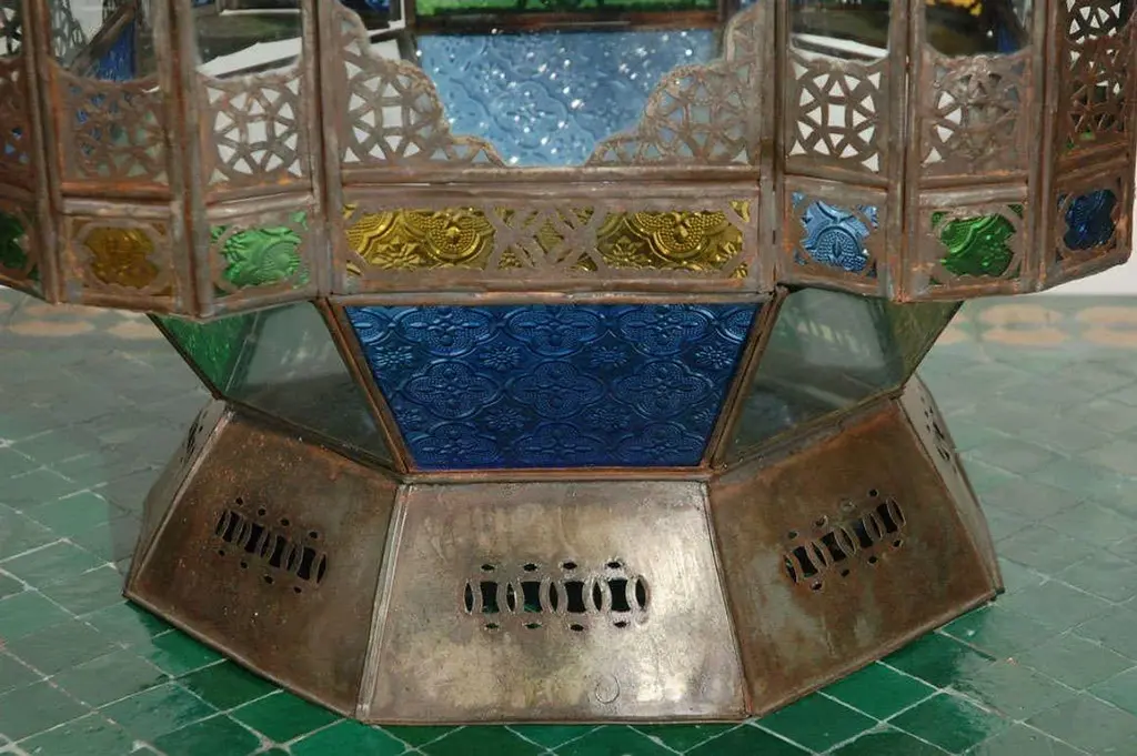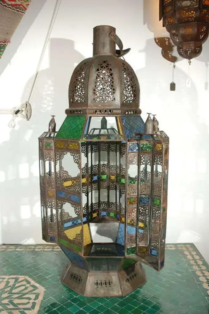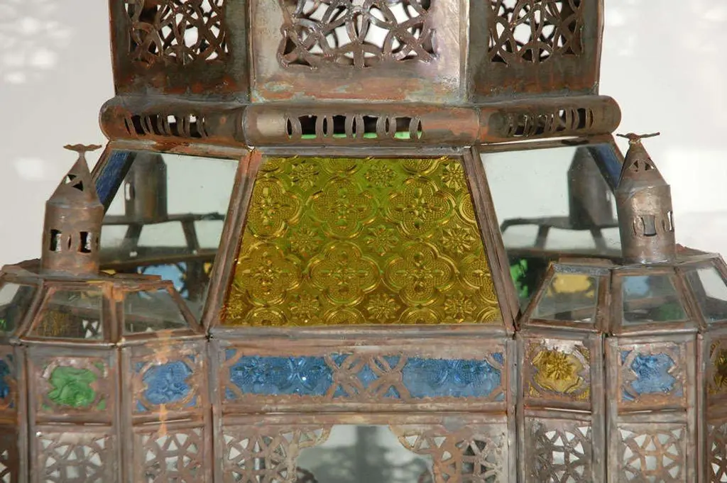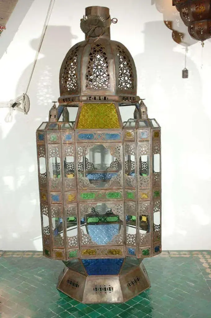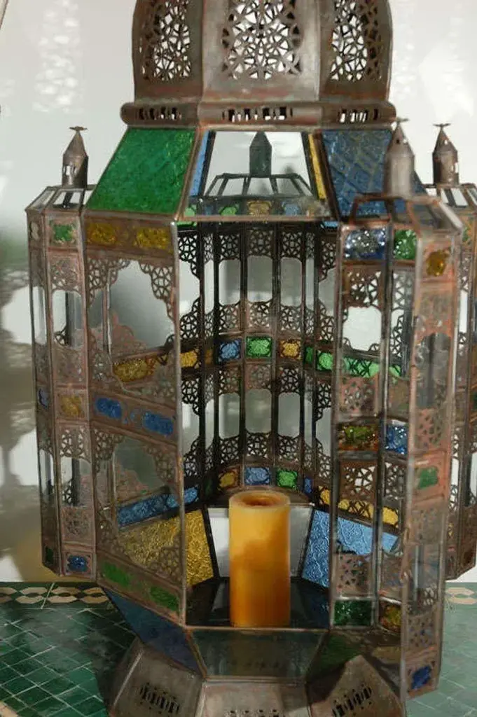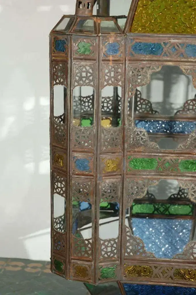 Oversized Moroccan candle glass lantern from Marrakesh, clear and multicolored glass adorned with filigree Moorish designs. High end traditional Moroccan hurricane candle lantern handcrafted in Morocco by skilled artisans. Clear glass bottom, one door on the side, indoor or outdoor use. Size: 40 inches High x 17" square. Multiple available, could be rewired to use as a pendant lantern. Hand made in Marrakech, Morocco. For indoor use or covered area use only. About the Moroccan lanterns: The metal and glass hand-crafted lantern from Morocco is a captivating pieces of artistry that combines the rich cultural heritage and exquisite craftsmanship of the region. Its design reflects the traditional Moroccan style, which is renowned for its intricate detailing and vibrant aesthetic. This vintage Moroccan lantern is meticulously handcrafted using a combination of metal and glass, resulting in a stunning blend of materials that enhances its overall beauty. The framework of the Moorish lantern is skillfully constructed from metal which provides a sturdy foundation and intricate patterns. The metalwork adorning the Moroccan light fixture features intricate filigree patterns, geometric motifs, and delicate scrollwork, all meticulously hand-cut by skilled Moroccan artisans in Marrakech. These ornate Moorish designs create mesmerizing shadows when the Moroccan hanging lantern is illuminated, casting enchanting patterns that dance across the surroundings. The glass components of the Moroccan lantern add a touch of elegance and brilliance to its appearance. Clear and multicolor glass panels are carefully inserted into the metal framework. These panels may showcase traditional Moroccan geometric Islamic designs. When the Moroccan lantern is lit from within, the glow emanating through the colorful glass panels transforms the surrounding space into a warm and inviting atmosphere. The interplay of light and shadow created by the intricate metalwork and the translucent glass adds depth and allure to the lantern's overall charm. The craftsmanship of this Moroccan light fixture is a testament to the dedication and skill of the artisans who meticulously handcraft each piece. The attention to detail, the artistic flair, and the fusion of metal and glass make this Moroccan lantern a true work of art, capturing the essence of Moroccan culture and heritage. Whether displayed as a centerpiece or hung from a hook, this metal and glass handcrafted lantern from Morocco effortlessly evokes a sense of enchantment, transporting you to the vibrant streets and magical ambiance of Moroccan nights.