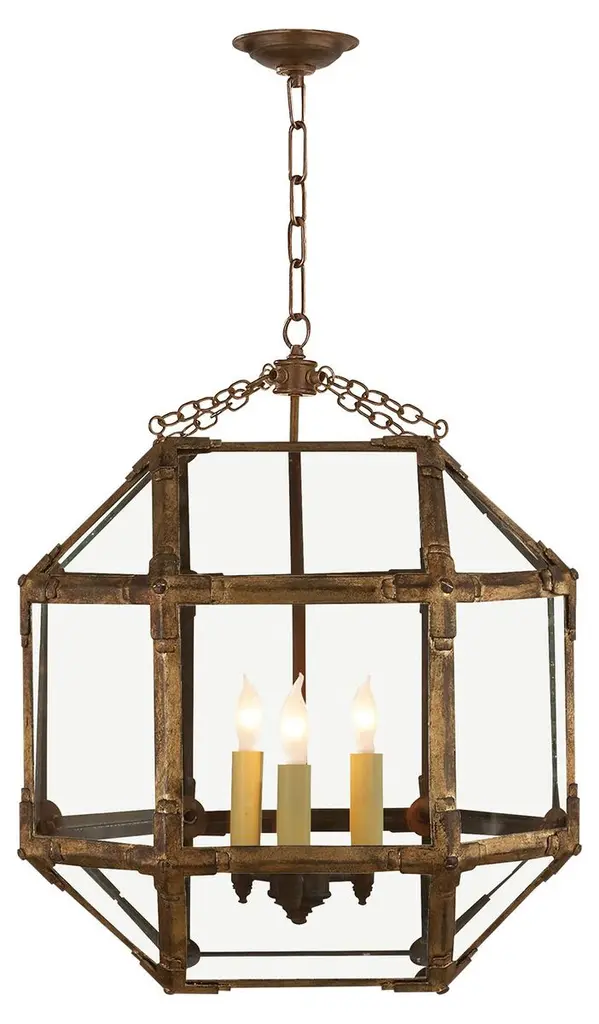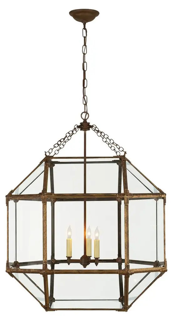 Available online exclusively at One Kings Lane: This fixture from designer Suzanne Kasler is crafted of brass with a strong geometric form, antiqued gold finish, and clear glass panes. Hardwired.