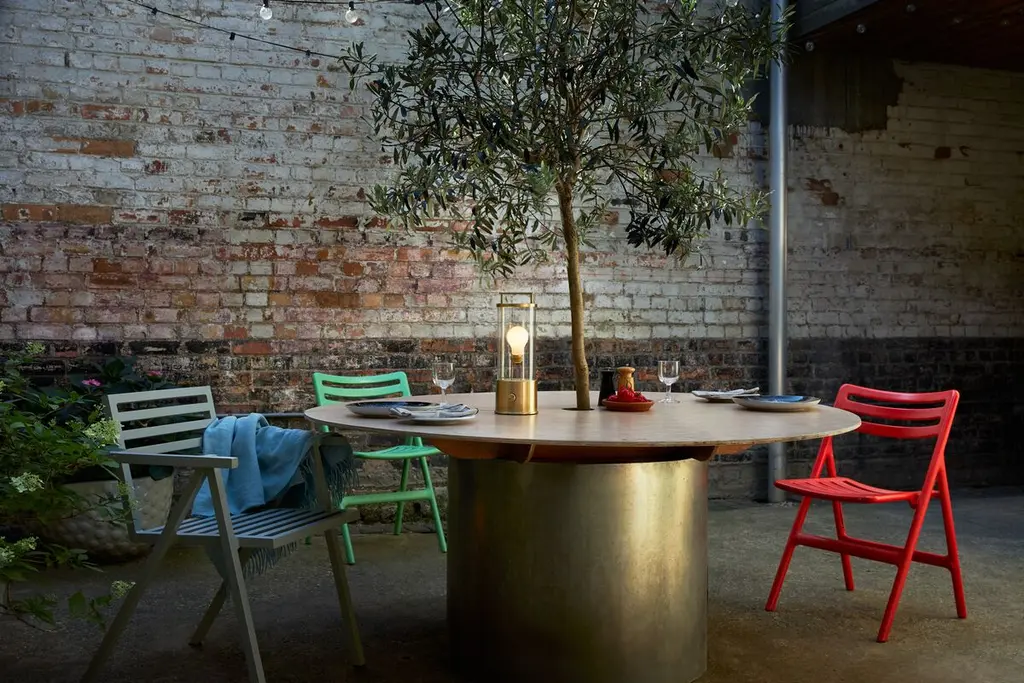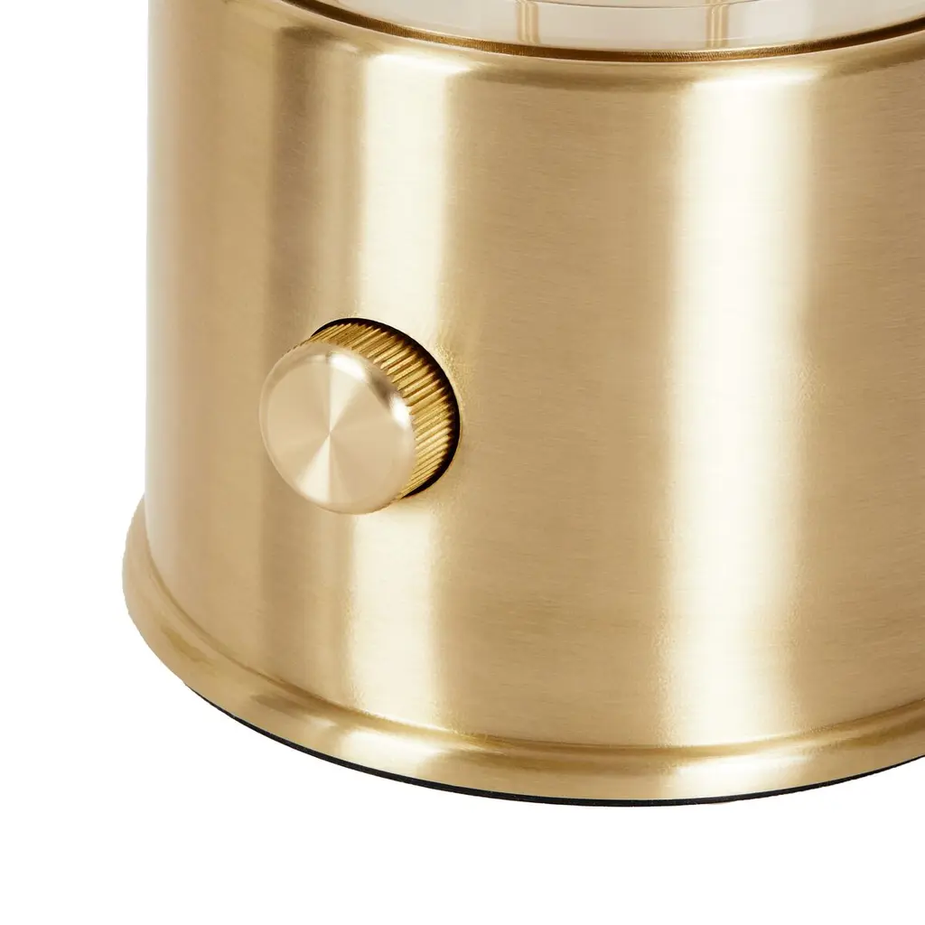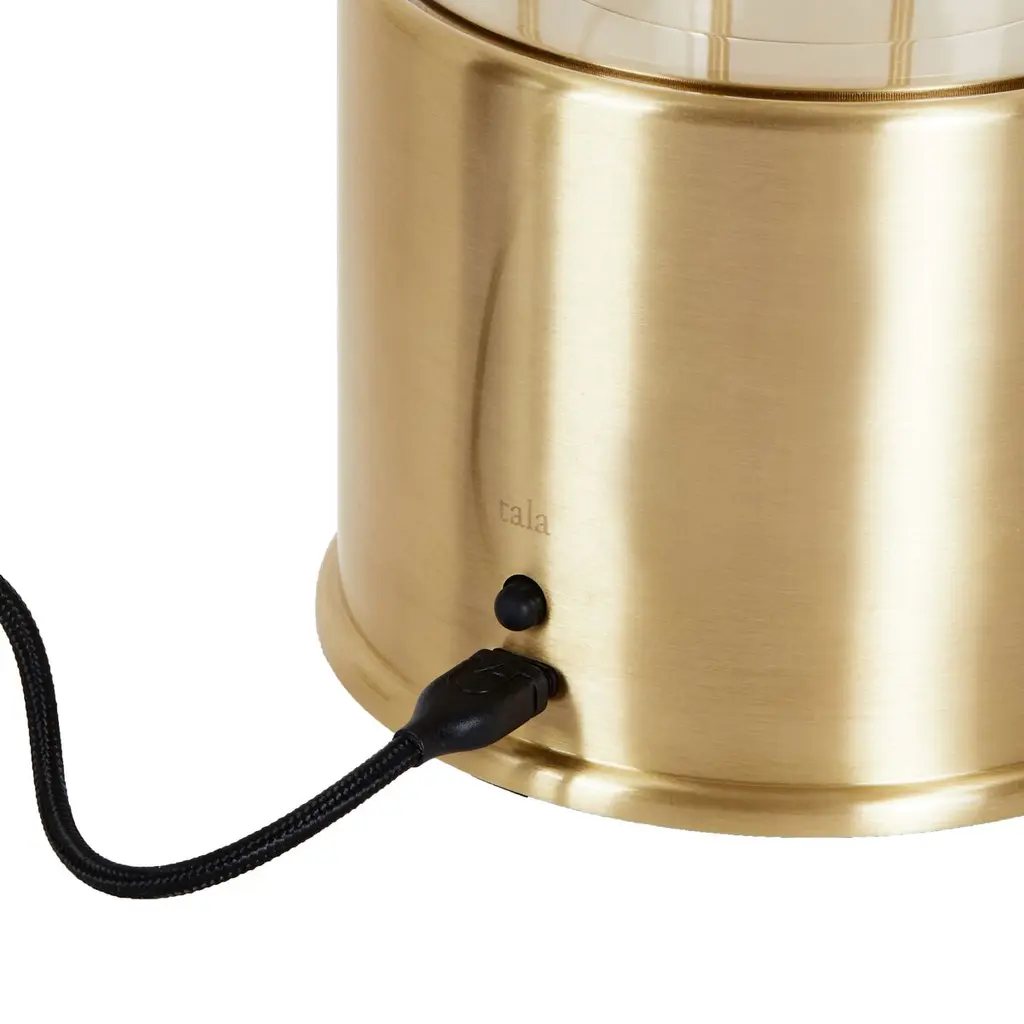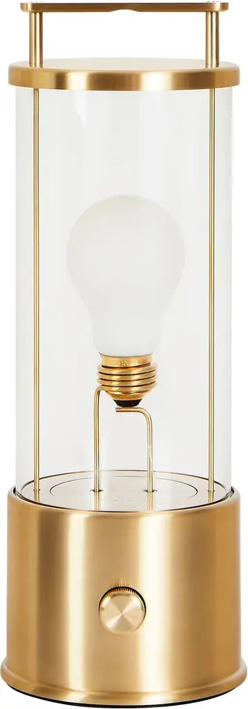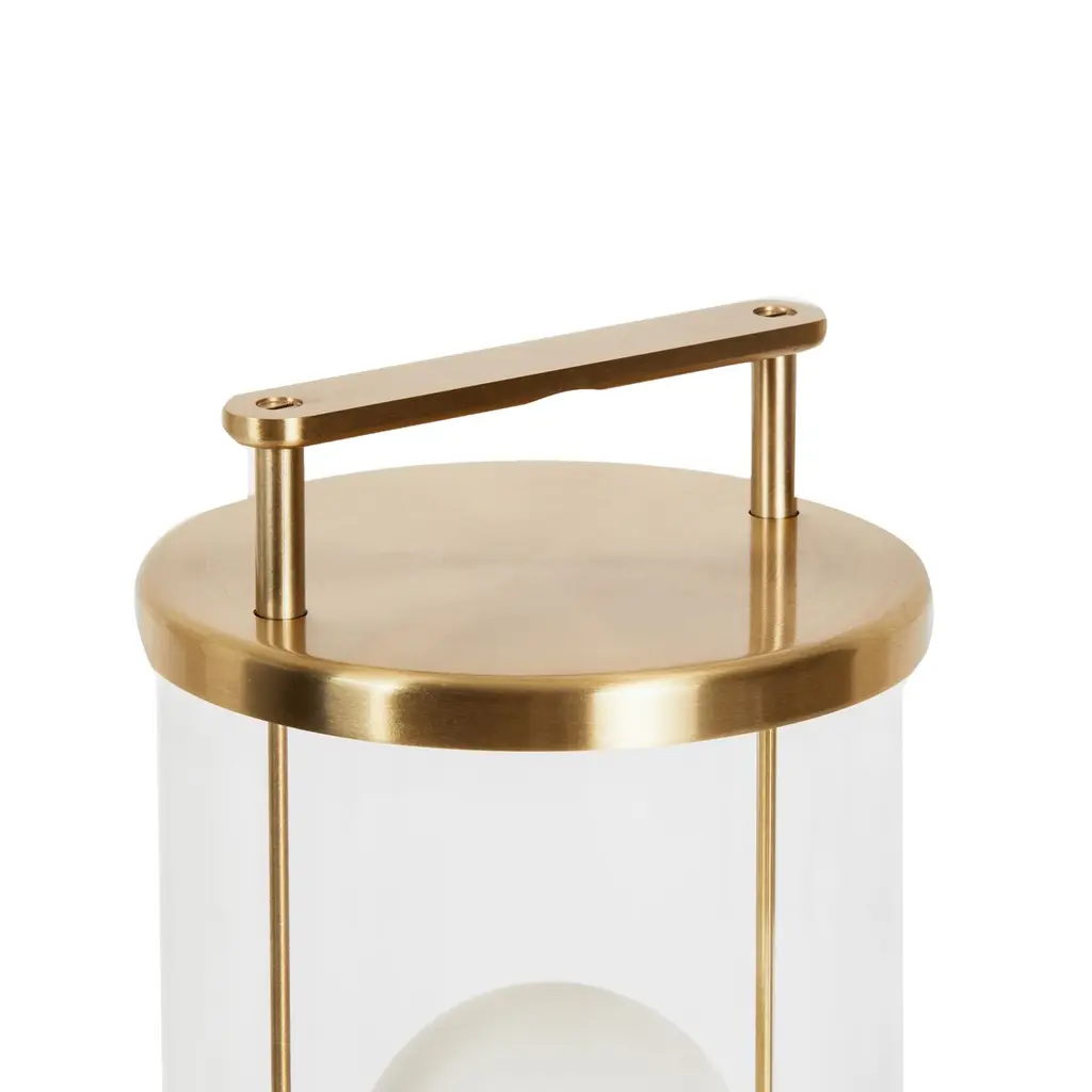 This gleaming brass lantern brings time-honored panache to any space, indoors or out. Made from durable recycled materials and boasting a satin finish, the weatherproof lantern has a 24-hour battery life and an integrated dimmer.