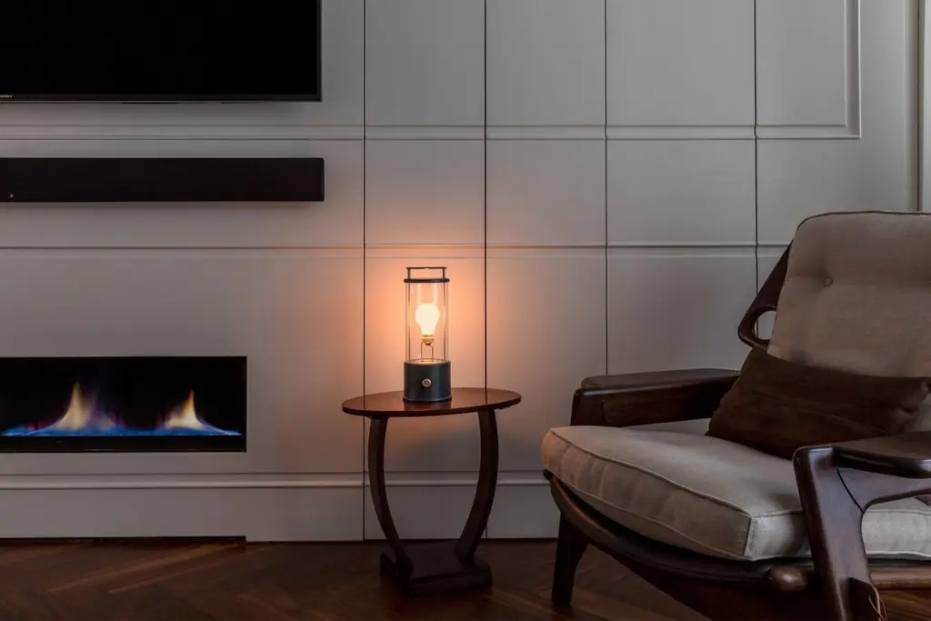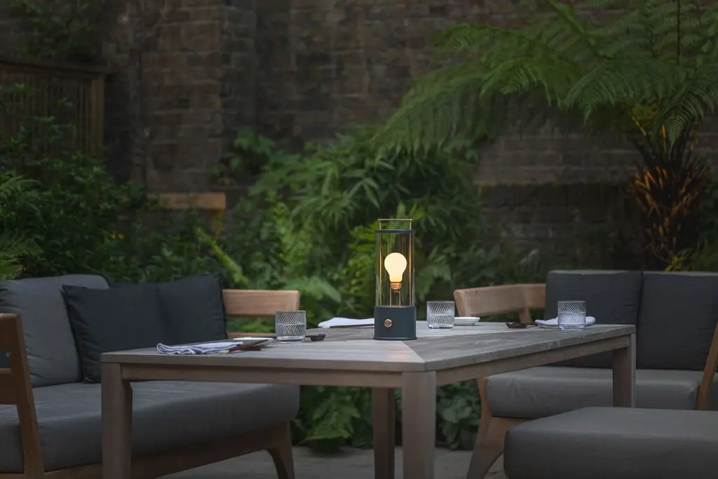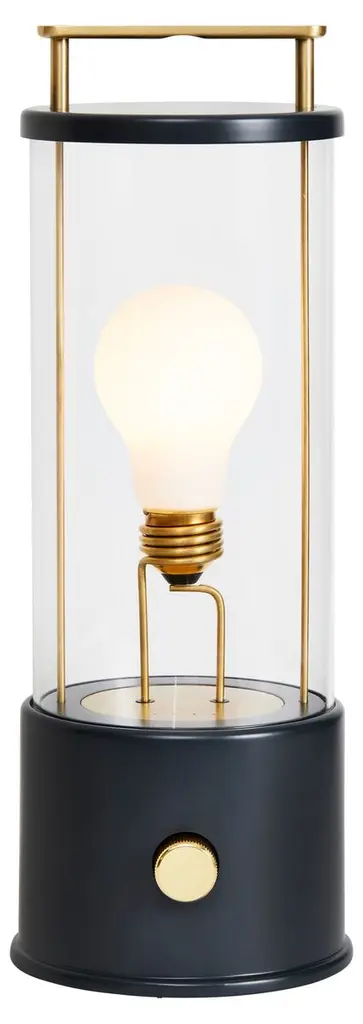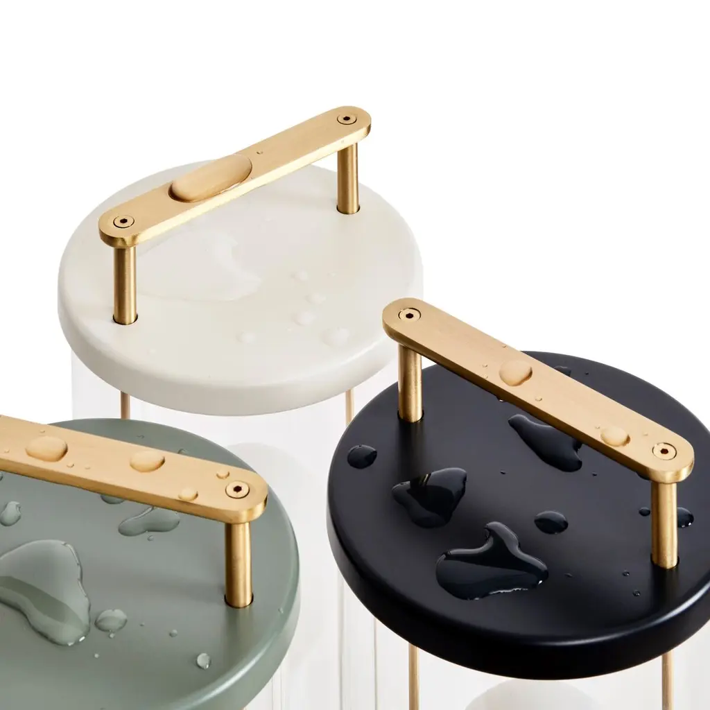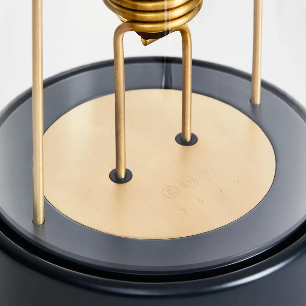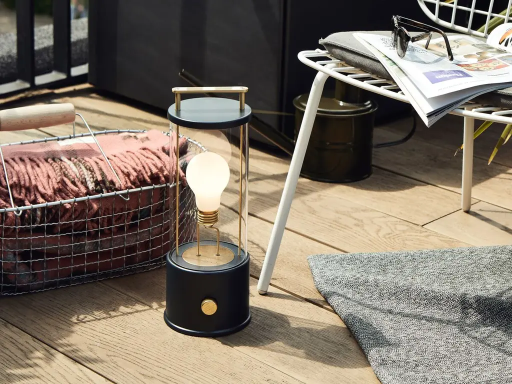 This refined lantern brings time-honored panache to any space, indoors or out. The golden hardware gleams against the base, finished in a deep blue-black shade that adds bold contrast and sophistication. Crafted from durable recycled materials, it offers a 24-hour battery life for effortless, atmospheric lighting wherever it's placed.