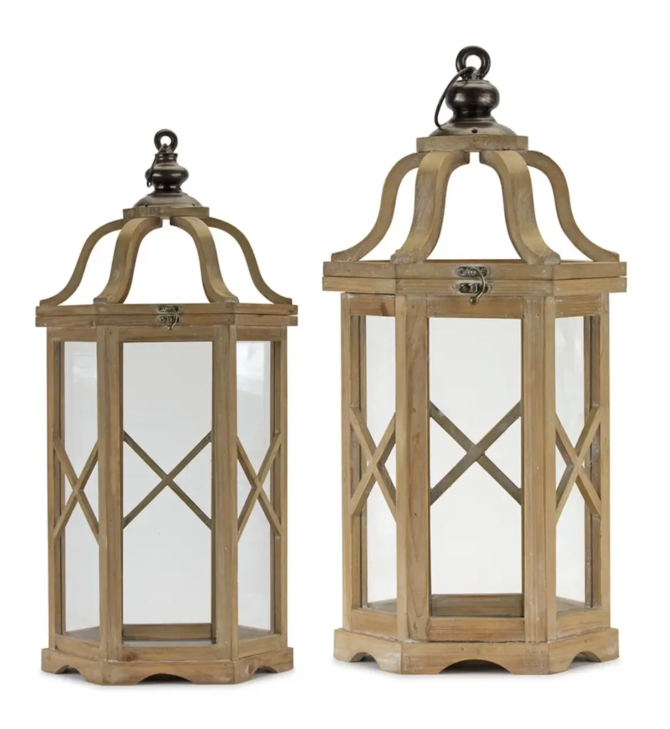 Embellish your home with this beautiful set of Wood and Metal Lanterns. Featuring two assorted sizes, the natural wooden finish paired with the rustic metal accents makes this set a perfeact addition to your modern farmhouse or country style of decor. The sturdy wooden composition is sure to last for seasons to come. Great for both every day and seasonal decor, just add a real wax or LED candle to complete the look.