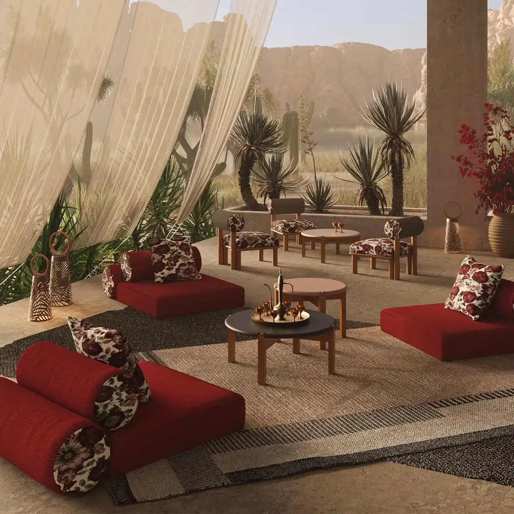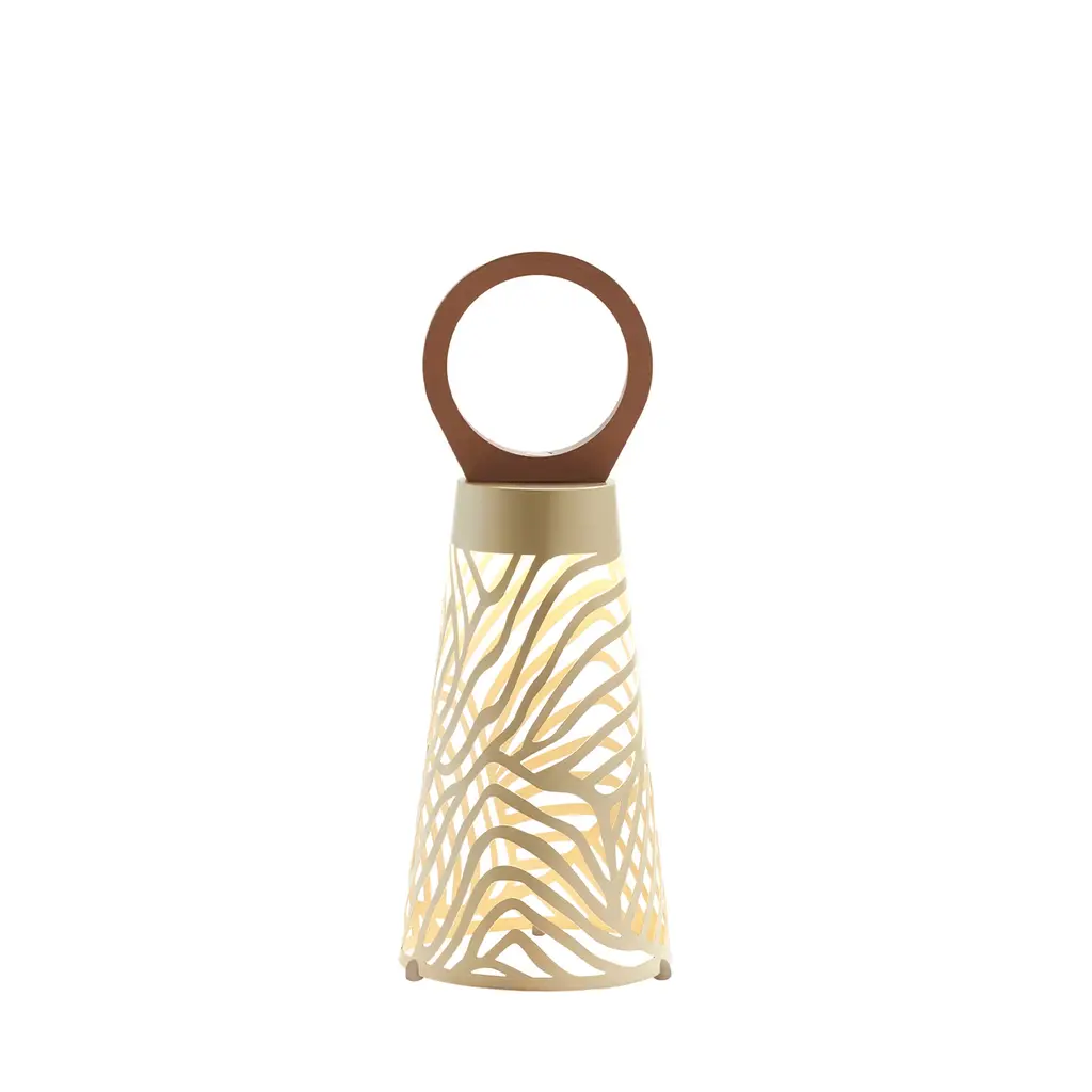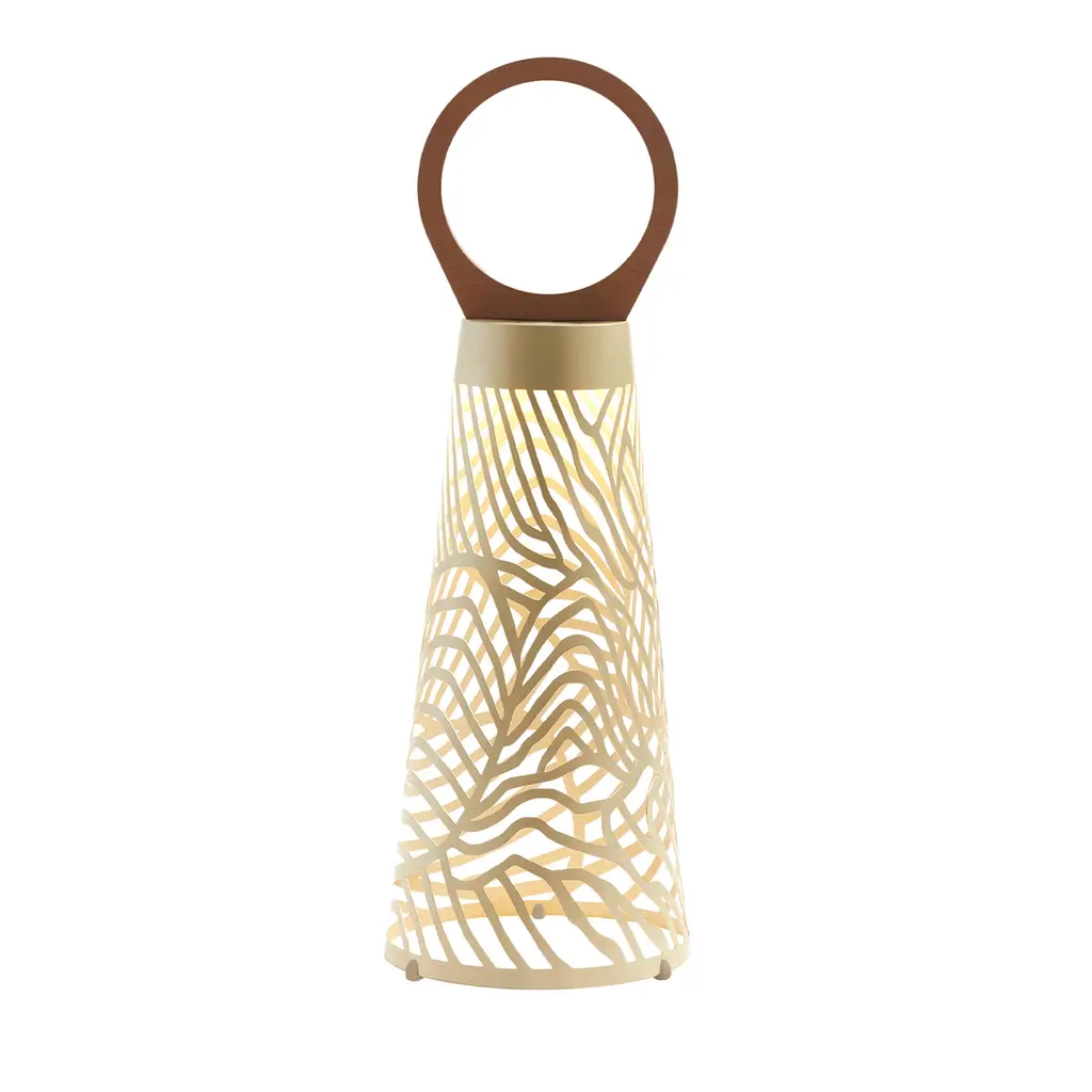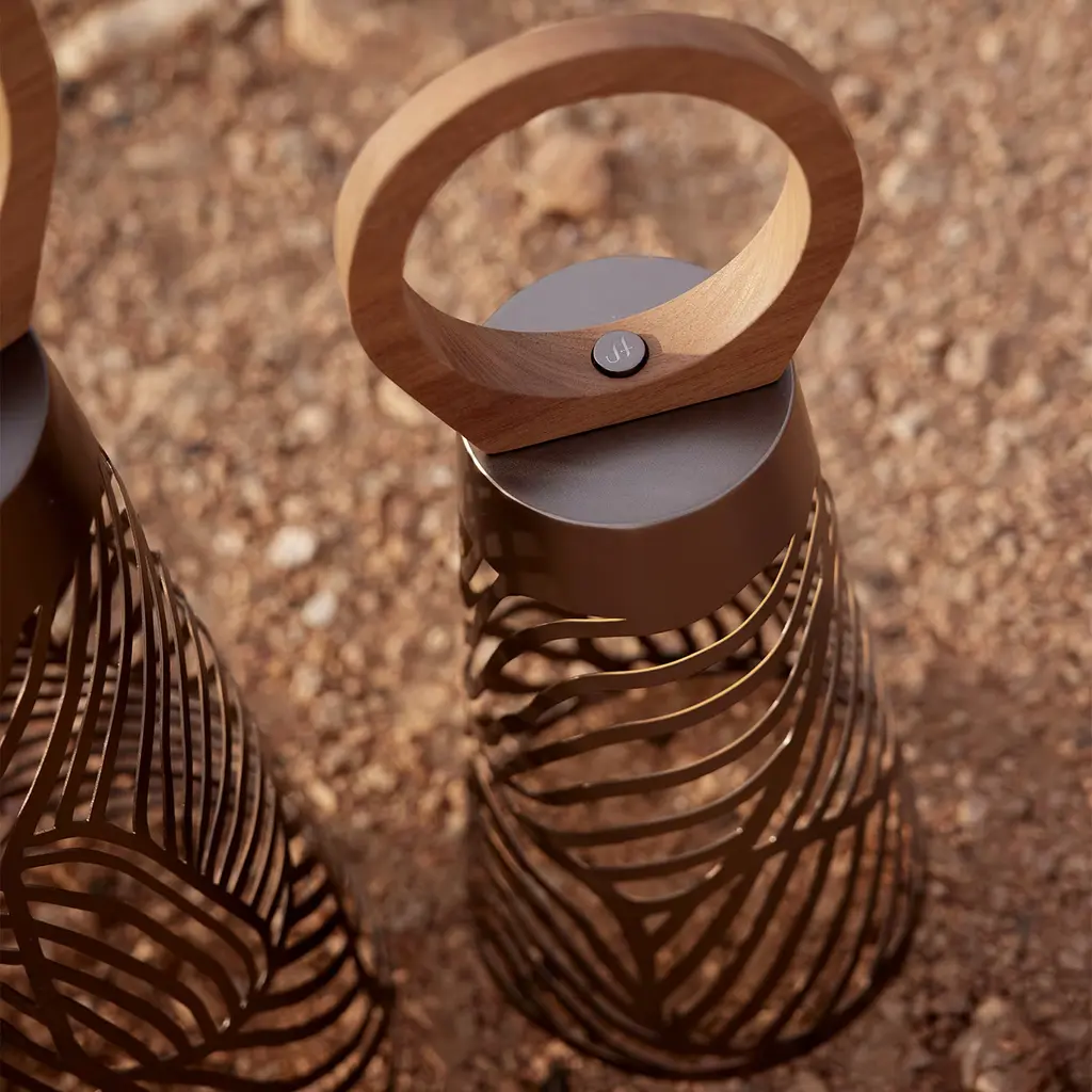 Noora, Arabic for "light", is a portable outdoor lantern designed by Lorenza Bozzoli. Its conical lampshade, varnished for outdoor use, has a modern and elegant design. The iroko wood handle is water-resistant. Noora features a rainproof LED light, 30W power, 9900mAh lithium battery lasting six hours. The LED can be easily inserted and removed from the lantern thanks to a magnetic mounting system. It's rechargeable via a supplied USB cable and controllable with a remote.