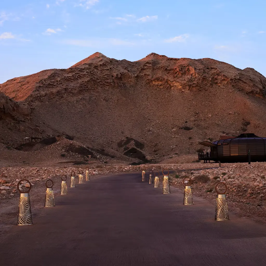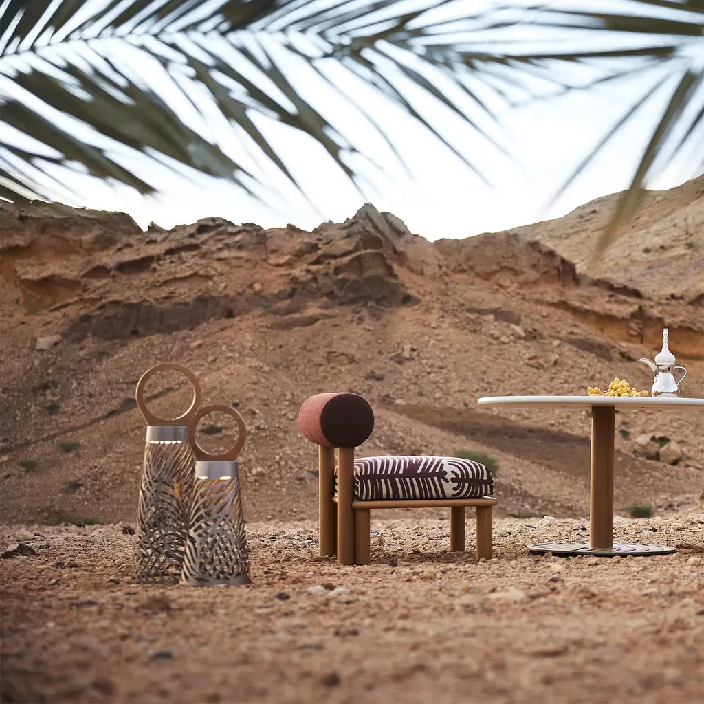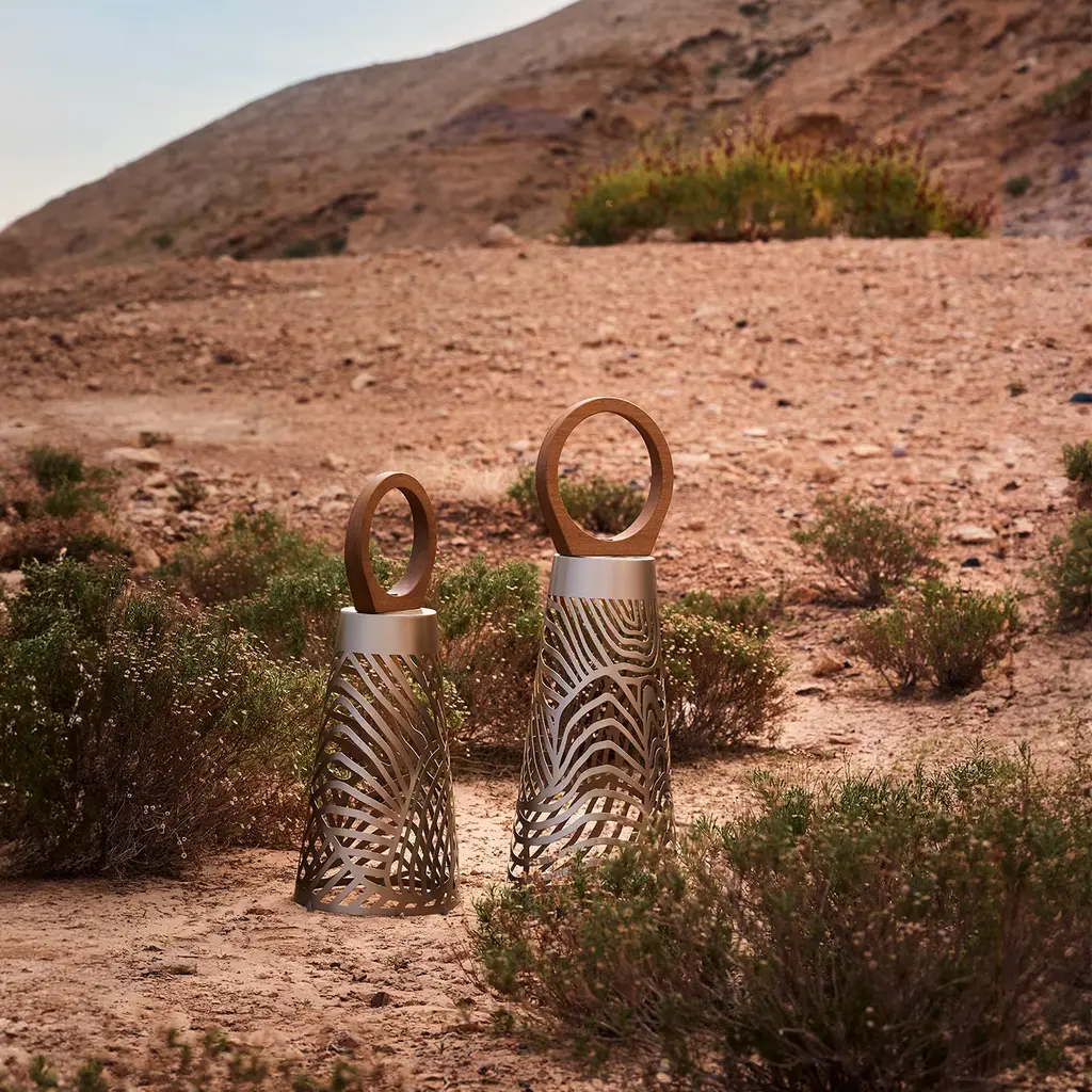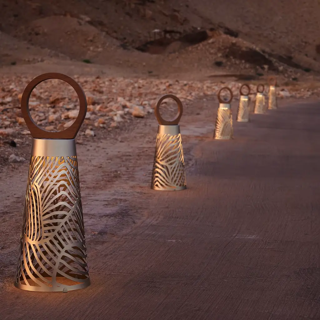 Noora, Arabic for "light", is a portable outdoor lantern designed by Lorenza Bozzoli. Its conical lampshade, varnished for outdoor use, has a modern and elegant design. The iroko wood handle is water-resistant. Noora features a rainproof LED light, 30W power, 9900mAh lithium battery lasting six hours. The LED can be easily inserted and removed from the lantern thanks to a magnetic mounting system. It's rechargeable via a supplied USB cable and controllable with a remote.