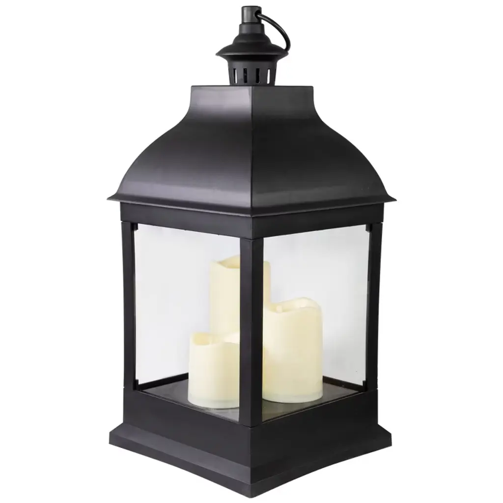 This lantern with LED candles is the perfect addition to your home decor. This lantern features a sleek black metal frame with clear glass panels, creating a sophisticated look that will complement any style of interior design. The three flameless LED candles inside the lantern provide a warm and cozy feel. Whether you're using it as a centerpiece for your dining table or as a decorative accent on your mantel, this lantern is sure to create a cozy and inviting atmosphere in your home. Features: Black candle lantern with LED candles Large clear panes for maximum light Handle for carrying and hanging Includes 3 flameless LED candles Convenient on/off switch with 6 hour timer Uses 2 "C" batteries - not included Recommended for indoor use only Dimensions: 20"H x 9.25"W x 9.25"D Material(s): plastic