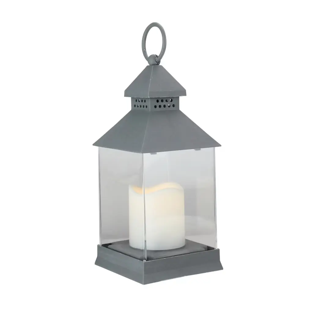 Light up your Summer with this candle lantern. The lantern is gray and features 1 bright LED flameless candle in the center. It is a perfect addition to any evening party or for a romantic ambiance with your loved one. This stylish lantern will be the ideal addition to your decor year-round. Features: Tabletop lantern The top and base is gray with clear panes Features a large hook for hanging or carrying Includes 1 white LED flameless candle in center On/off switch on bottom on lantern Uses 3 'AAA' batteries - not included Can be carried, hung from a ceiling or displayed on a sturdy table top For indoor use only Dimensions: With hook: 11"H x 4"W x 4"D Without hook: 9.5"H x 4"W x 4"D Candle: 2.75" high x 2.5" diameter Material(s): plastic