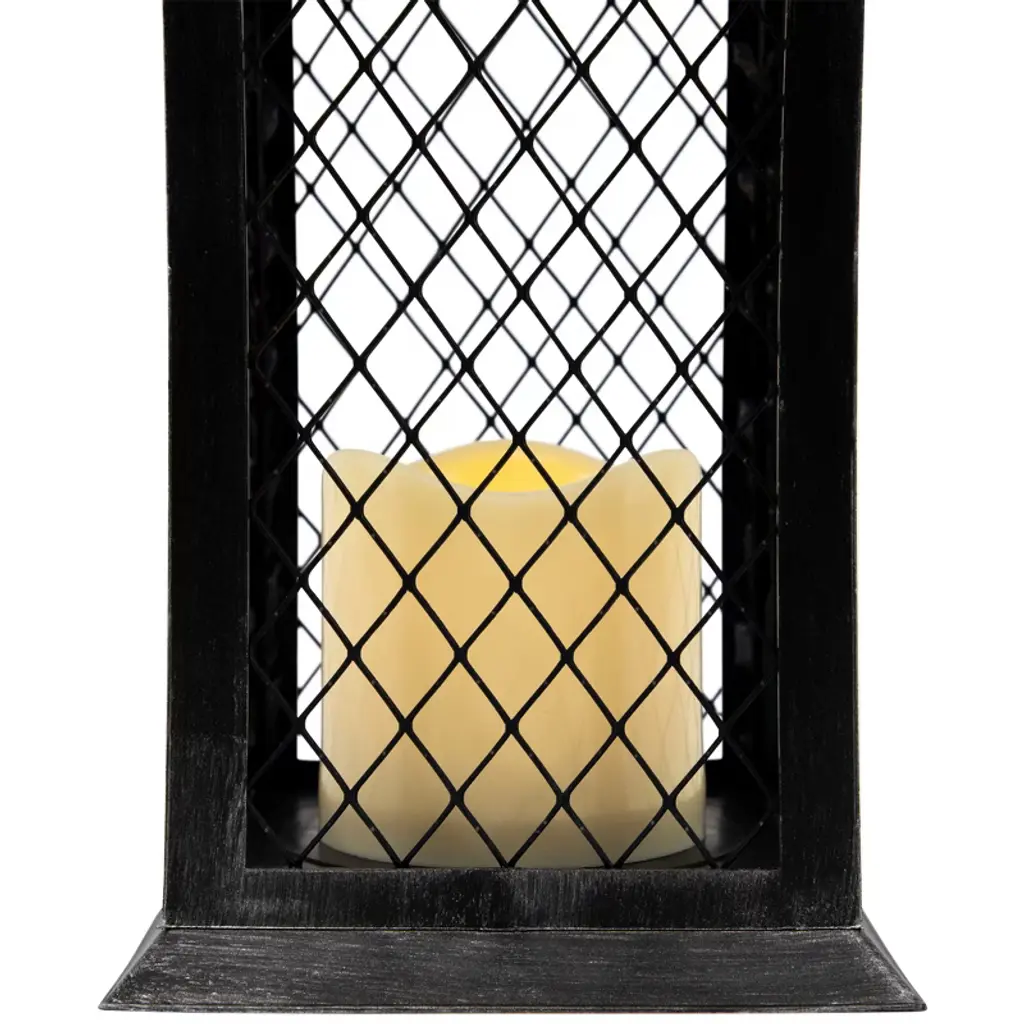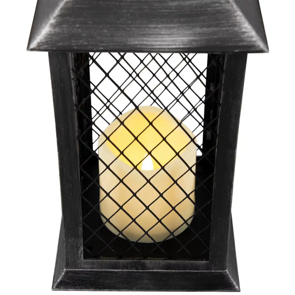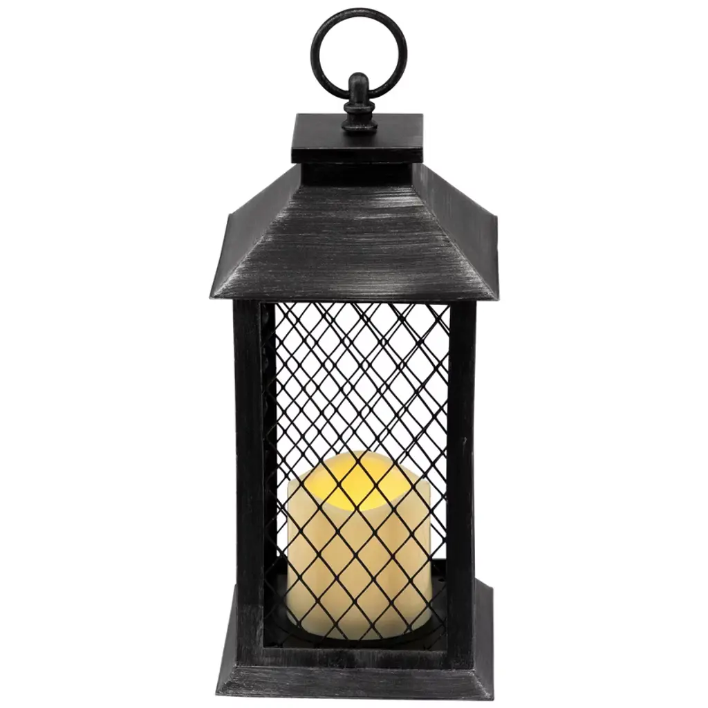 Light up your Summer with this candle lantern. Perfect addition to any evening party or for an romance ambience with your loved one. This stylish lantern will be be the ideal addition to your decor year round. Features: Features a large hook for hanging or carrying Lantern is black with silver brushed design Mesh panels give off unique shadow when candle is on Includes 1 LED flameless candle in center On/off switch on bottom on lantern Uses 3 'AAA' batteries - not included Can be carried, hung from a ceiling or displayed on a sturdy table top For indoor use only Dimensions: 11"H x 5.5"W x 5.5"D Candle: 4" high x 3" diameter Material(s): plastic