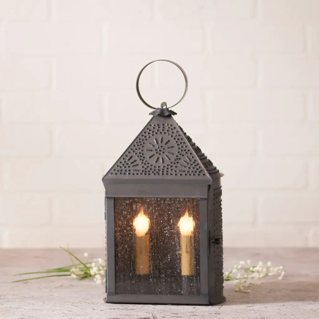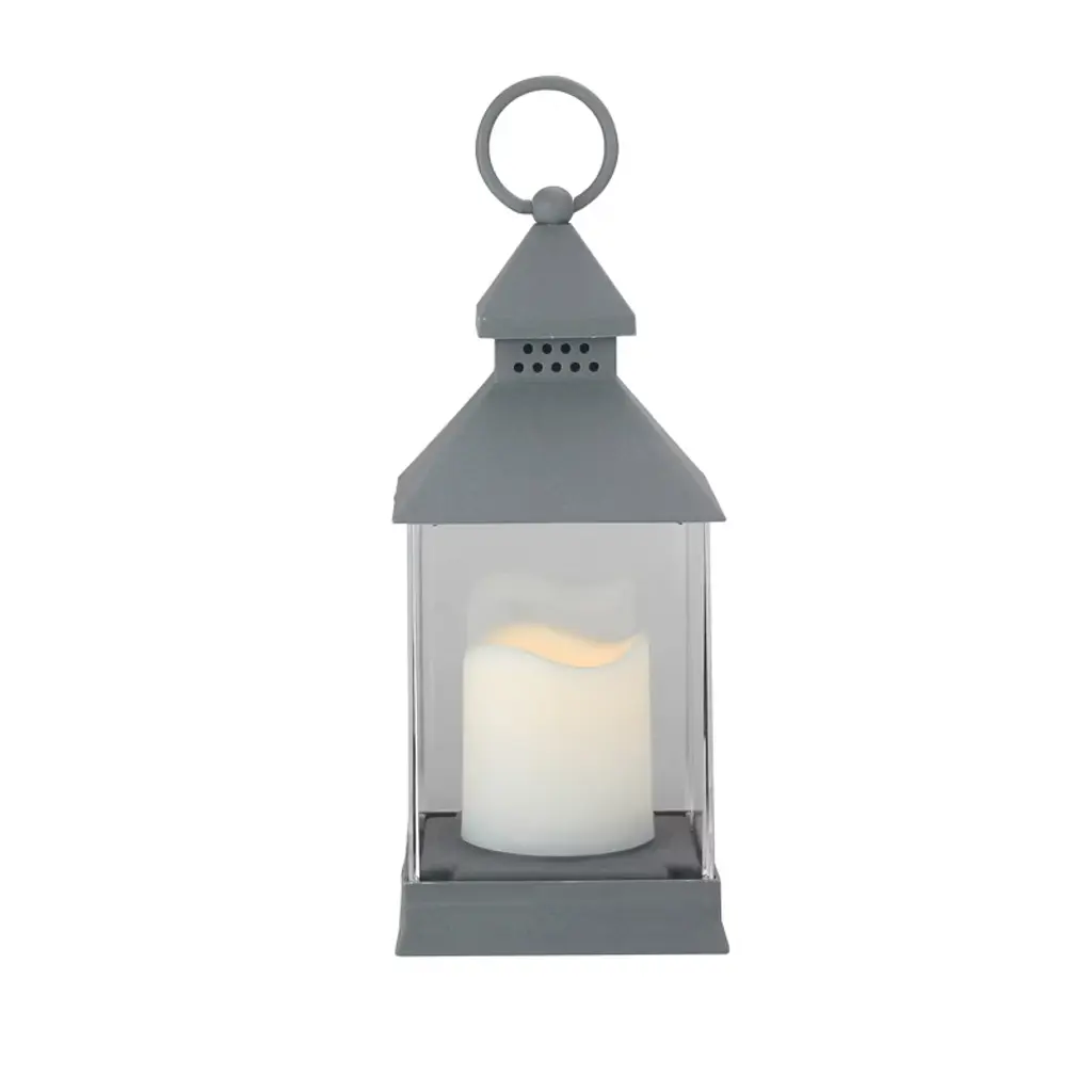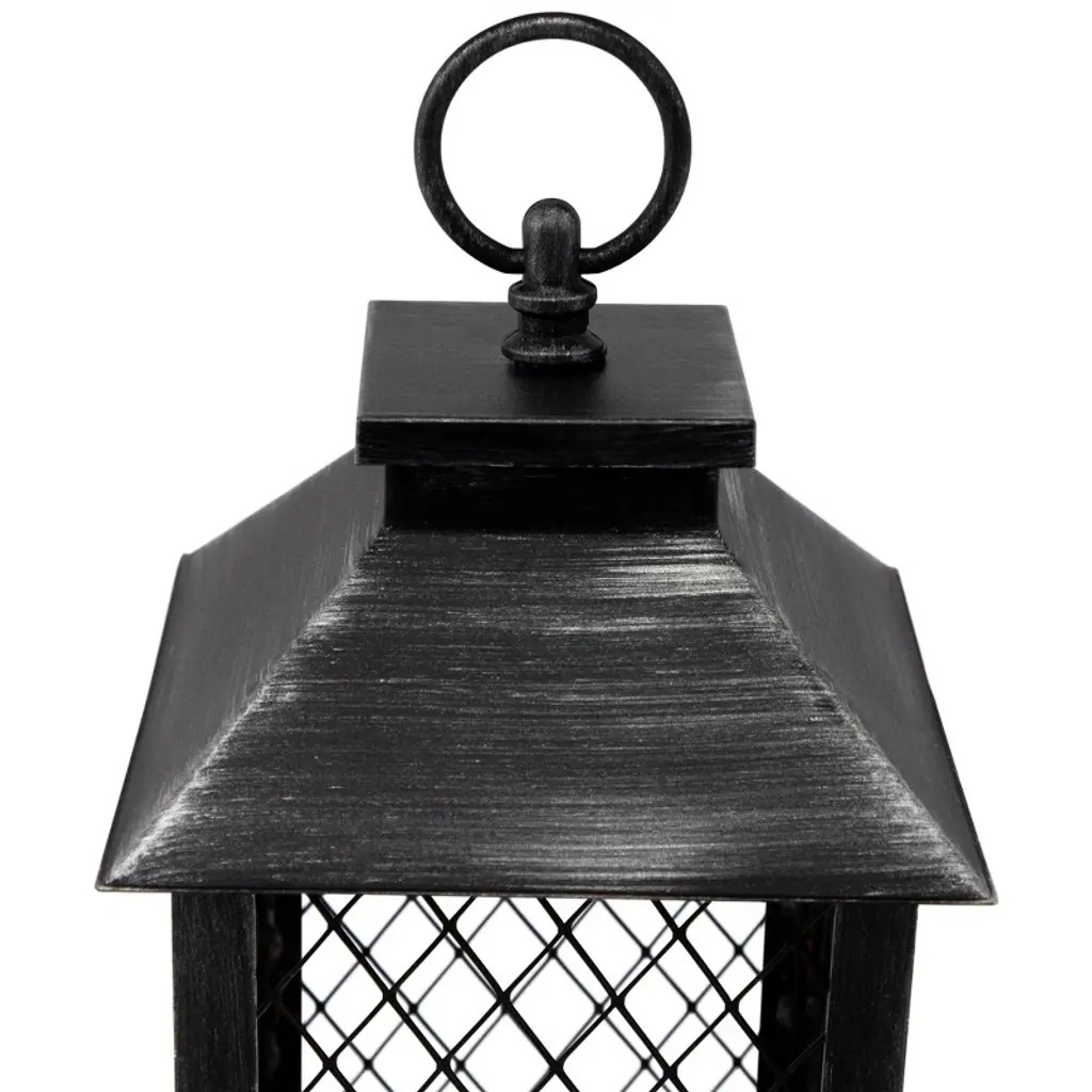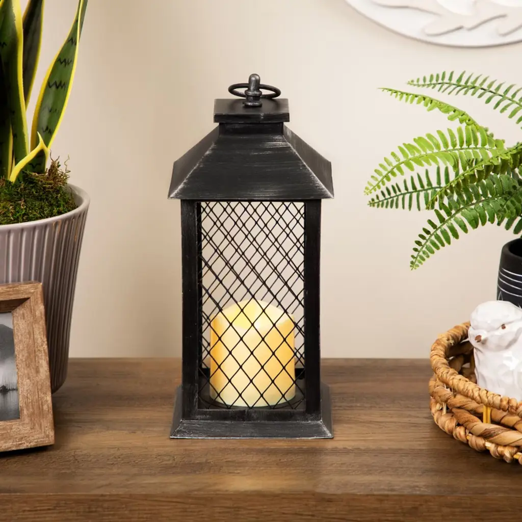 Light up your Summer with this candle lantern. Perfect addition to any evening party or for an romance ambience with your loved one. This stylish lantern will be be the ideal addition to your decor year round. Features: Features a large hook for hanging or carrying Lantern is black with silver brushed design Mesh panels give off unique shadow when candle is on Includes 1 LED flameless candle in center On/off switch on bottom on lantern Uses 3 'AAA' batteries - not included Can be carried, hung from a ceiling or displayed on a sturdy table top For indoor use only Dimensions: 11"H x 5.5"W x 5.5"D Candle: 4" high x 3" diameter Material(s): plastic