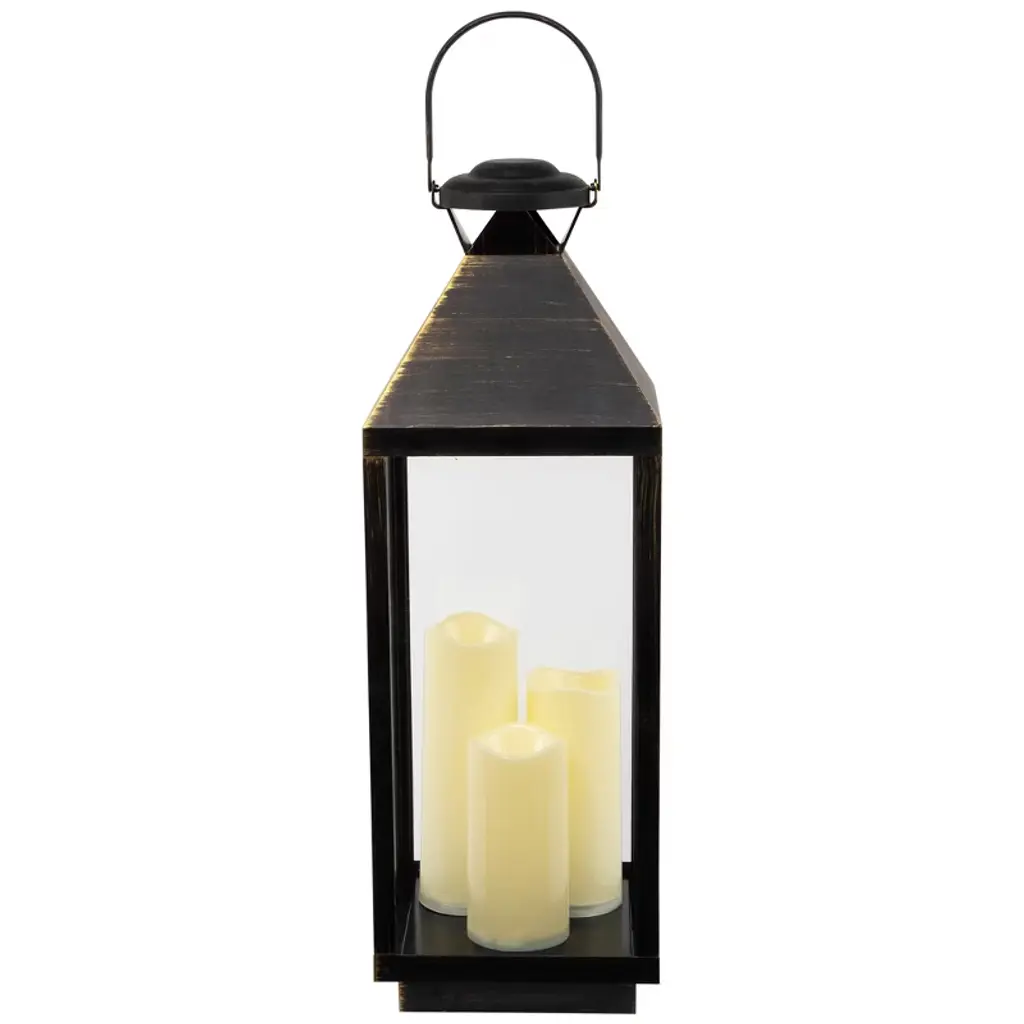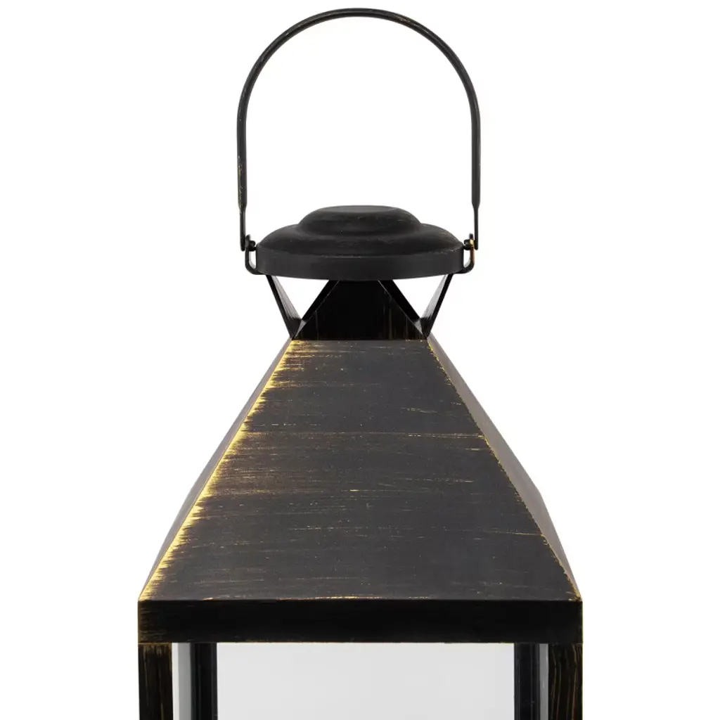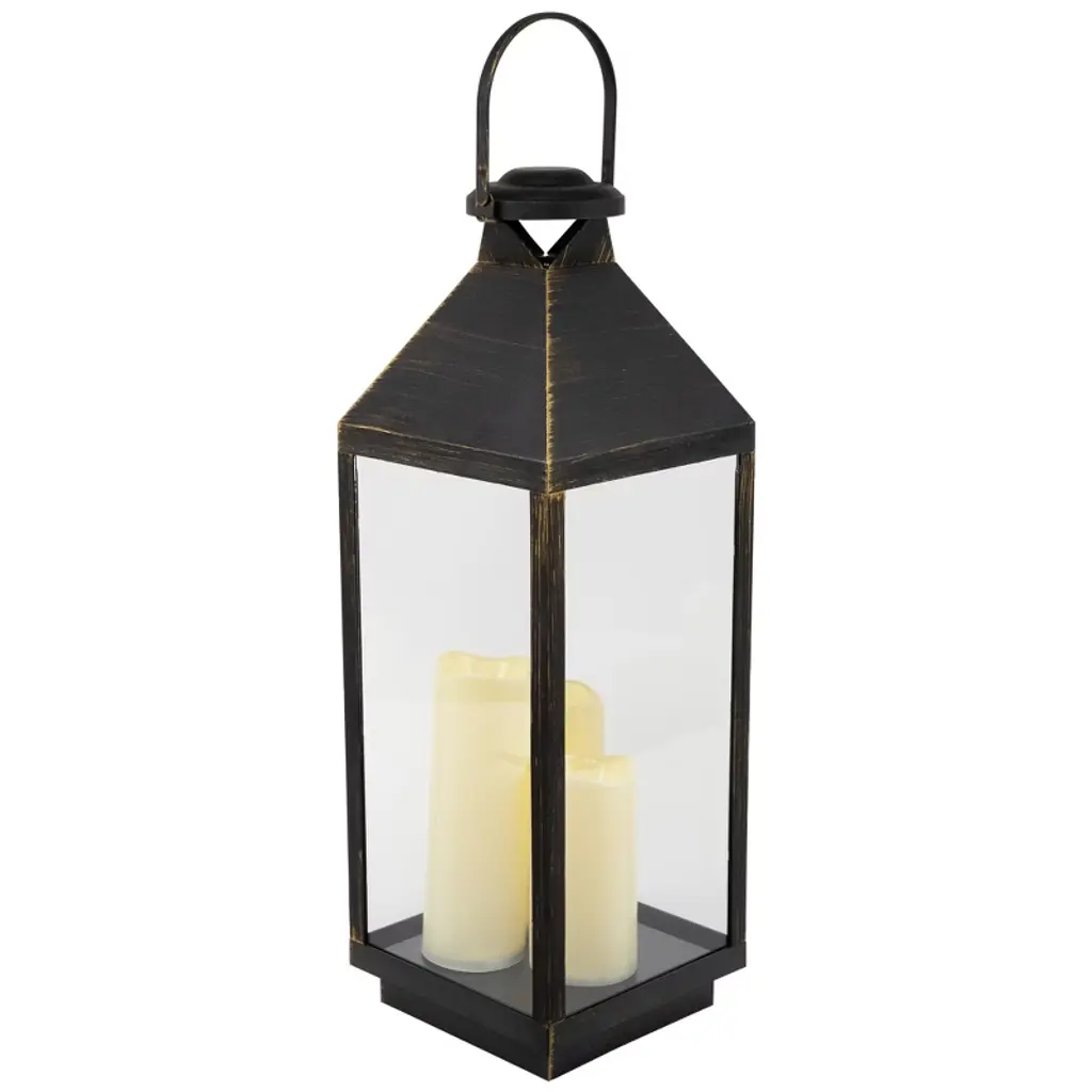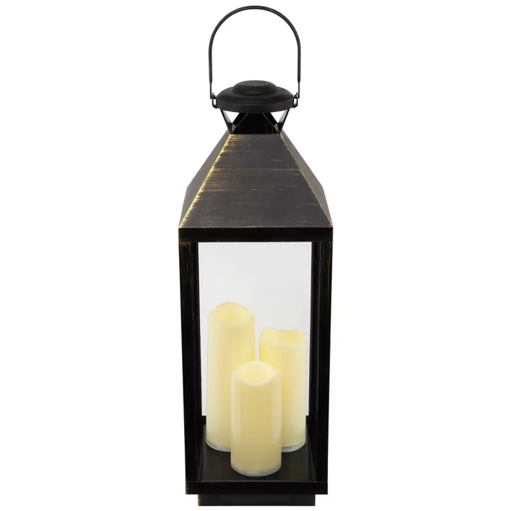 Light up your Summer with this lantern. Perfect addition to any evening party or for a romantic ambiance with your loved one. This stylish lantern will be the ideal addition to your decor all year-round. Features: Black gold brushed flameless candle lantern Handle for carrying and hanging Includes 3 flameless LED candles Large clear panes for maximum light Convenient on/off switch with 6 hour timer Uses 2 'C' batteries - not included Recommended for indoor use only Dimensions: 24"H x 8"W x 8"D Material(s): plastic