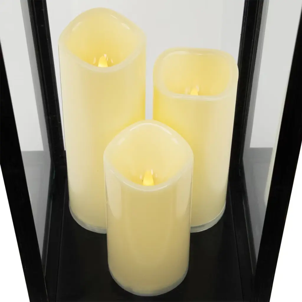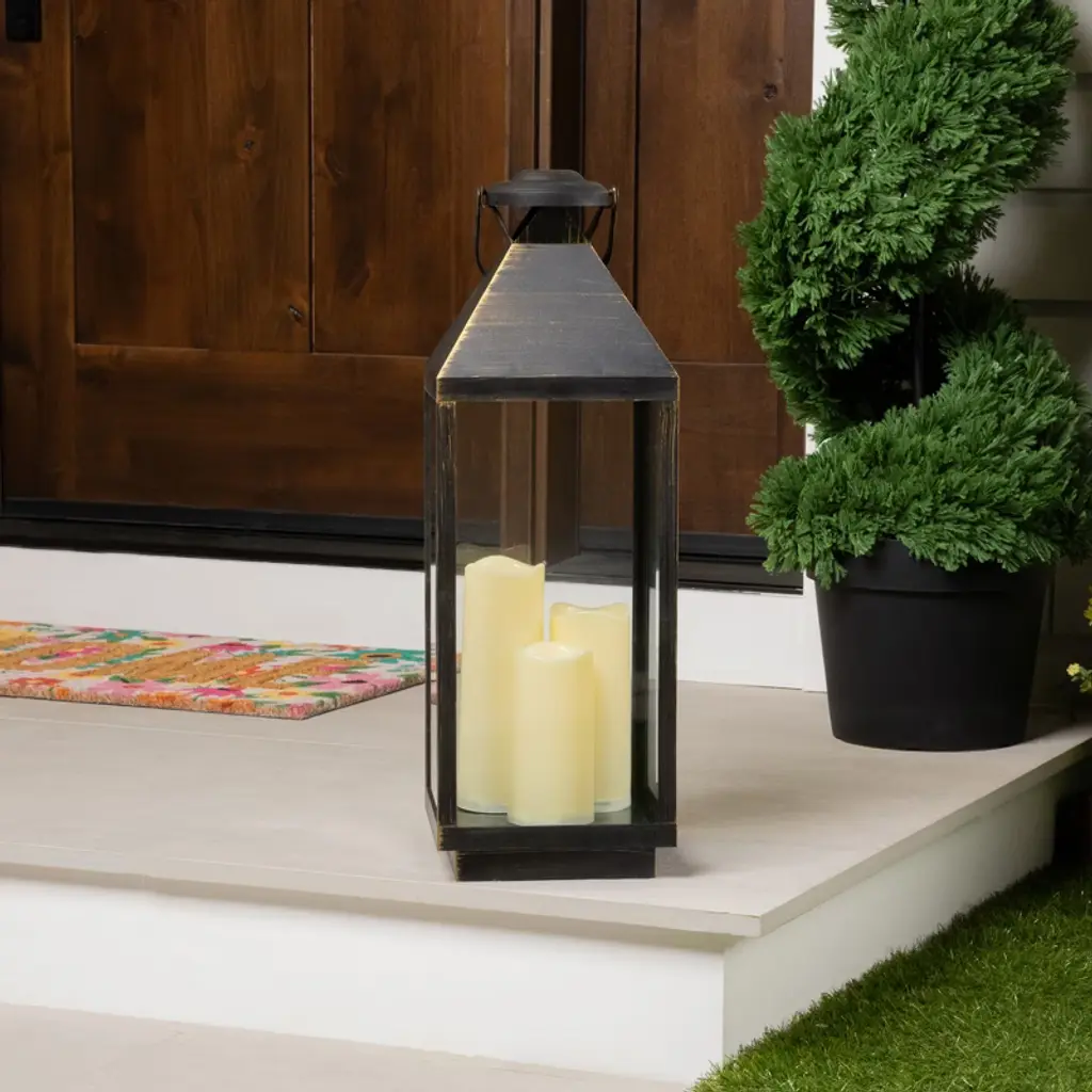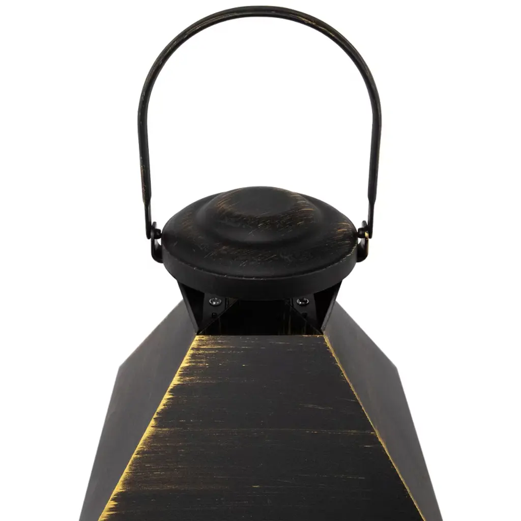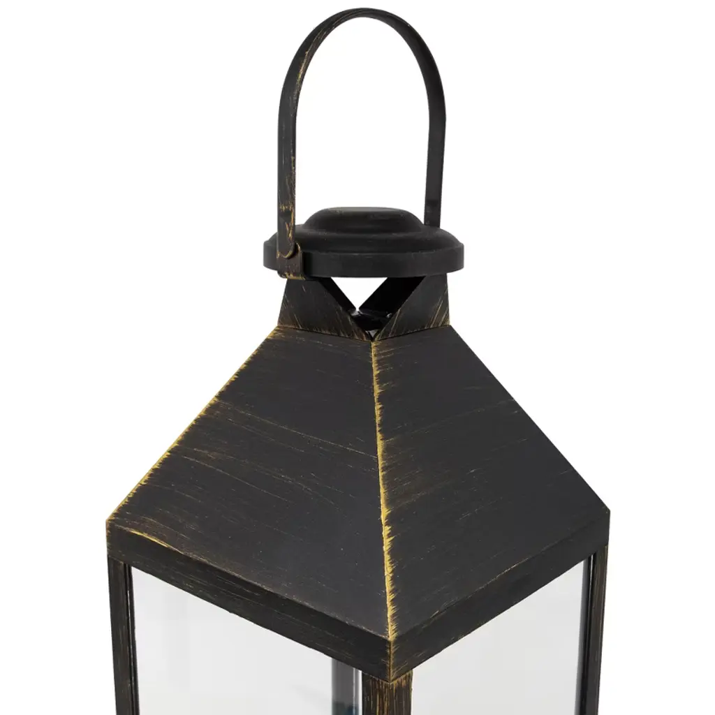 Light up your Summer with this lantern. Perfect addition to any evening party or for a romantic ambiance with your loved one. This stylish lantern will be the ideal addition to your decor all year-round. Features: Black gold brushed flameless candle lantern Handle for carrying and hanging Includes 3 flameless LED candles Large clear panes for maximum light Convenient on/off switch with 6 hour timer Uses 2 'C' batteries - not included Recommended for indoor use only Dimensions: 24"H x 8"W x 8"D Material(s): plastic