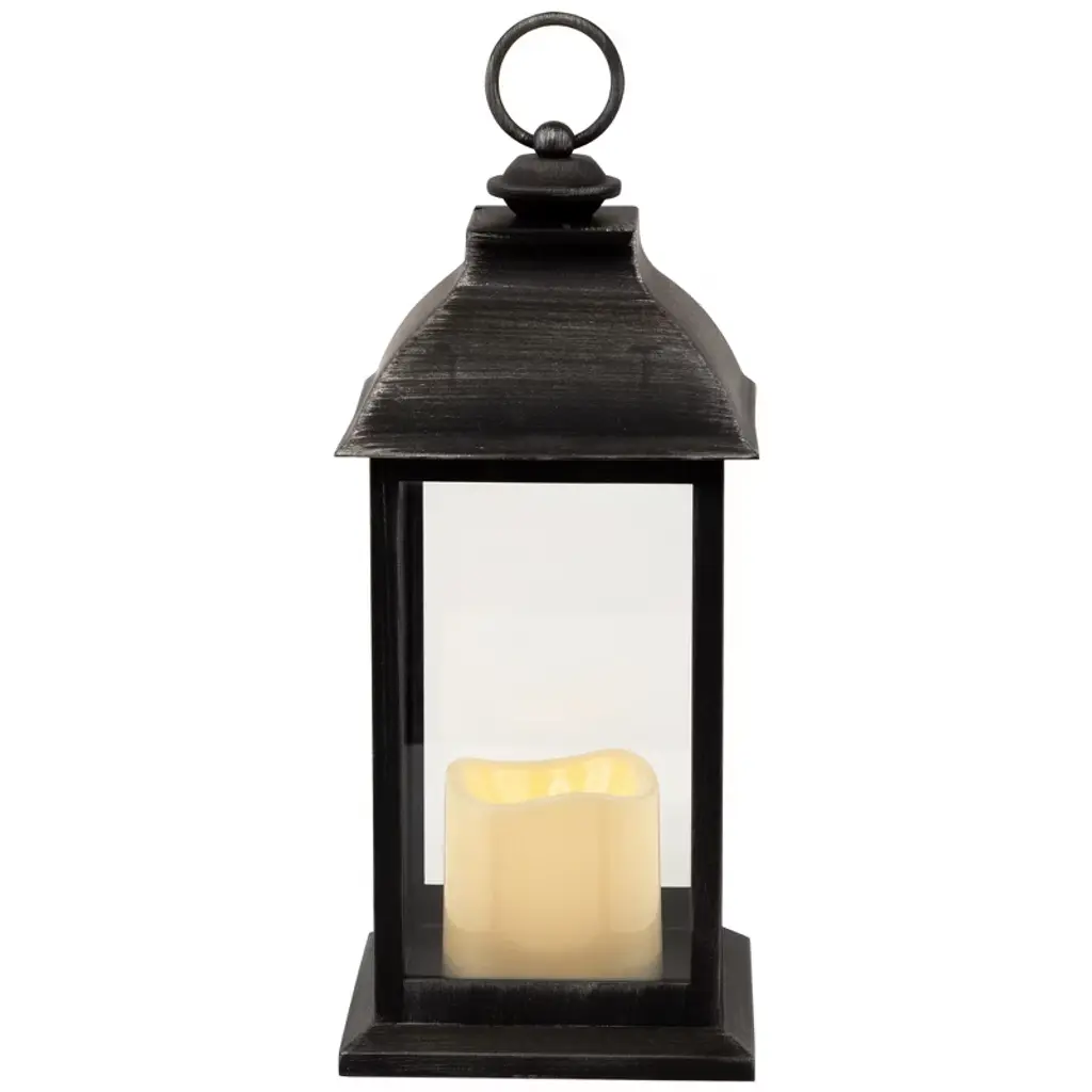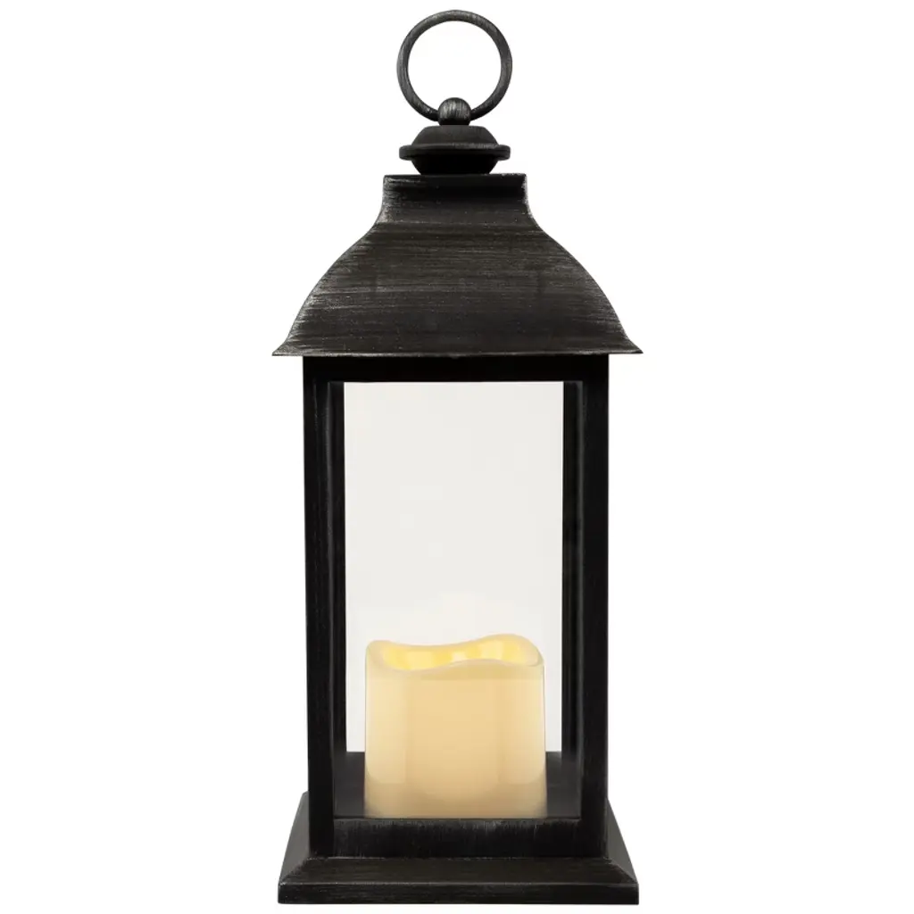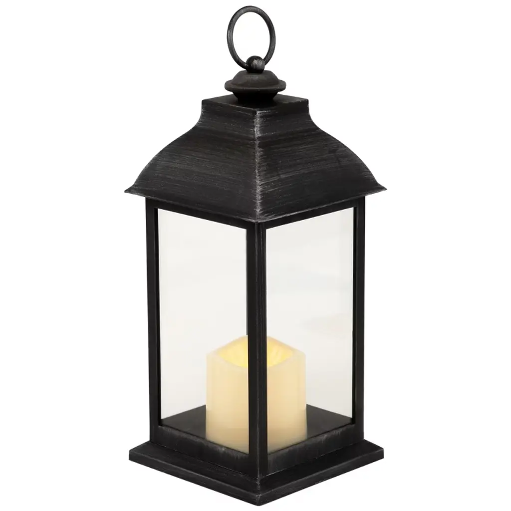 Light up your Summer with this candle lantern. The lantern is black accented with silver, features a bright LED flameless candle in the center that is a perfect addition to any evening party or for a romantic ambiance with your loved one. The flameless candle will give a warm, inviting glow of a fire without the actual danger of an open flame. Features: Tabletop lantern Lantern is black with a silver brushed design Features a large hook for hanging or carrying on top Large plastic panes make for maximum light Includes 1 LED flameless candle in center On/off switch on bottom of the lantern Uses 3 'AAA' batteries - not included Can be carried, hung from a ceiling or displayed on a sturdy table top For indoor use only Dimensions: 12.5"H x 5.25"W x 5.25"D Candle: 3" high x 3" diameter Material(s): plastic