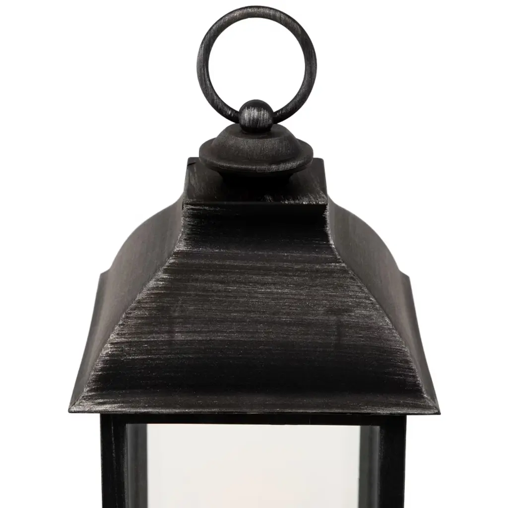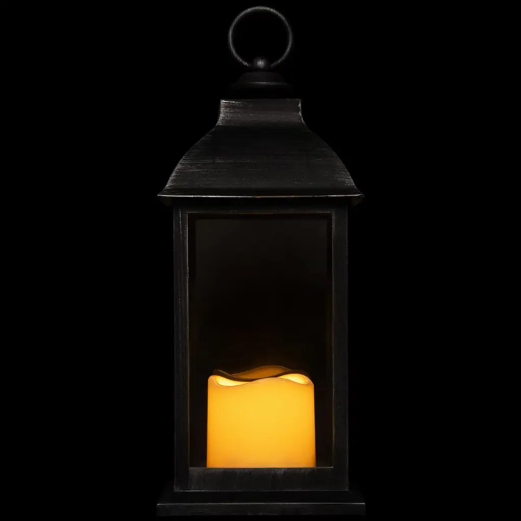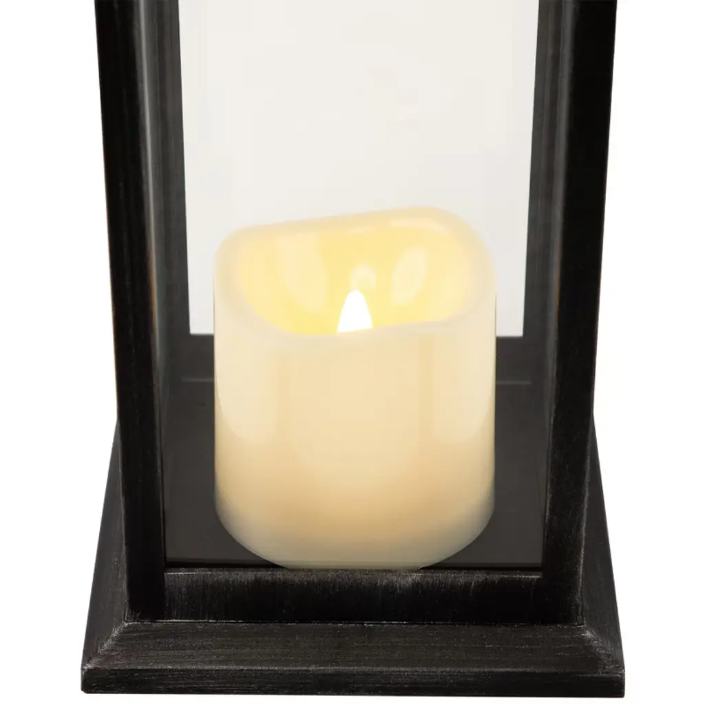 Light up your Summer with this candle lantern. The lantern is black accented with silver, features a bright LED flameless candle in the center that is a perfect addition to any evening party or for a romantic ambiance with your loved one. The flameless candle will give a warm, inviting glow of a fire without the actual danger of an open flame. Features: Tabletop lantern Lantern is black with a silver brushed design Features a large hook for hanging or carrying on top Large plastic panes make for maximum light Includes 1 LED flameless candle in center On/off switch on bottom of the lantern Uses 3 'AAA' batteries - not included Can be carried, hung from a ceiling or displayed on a sturdy table top For indoor use only Dimensions: 12.5"H x 5.25"W x 5.25"D Candle: 3" high x 3" diameter Material(s): plastic