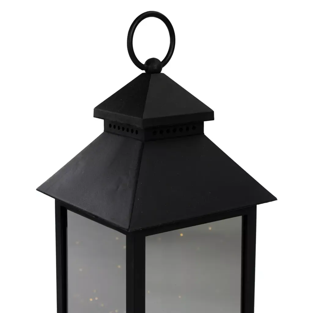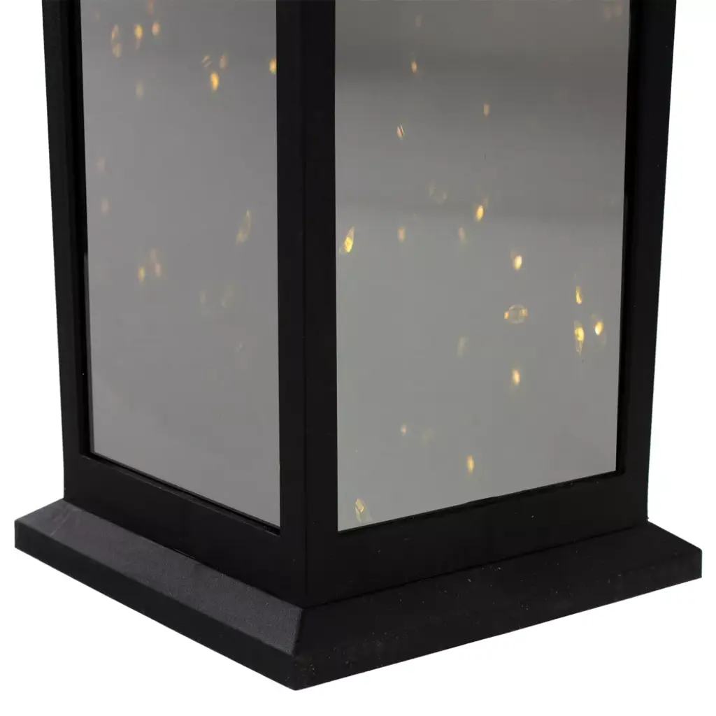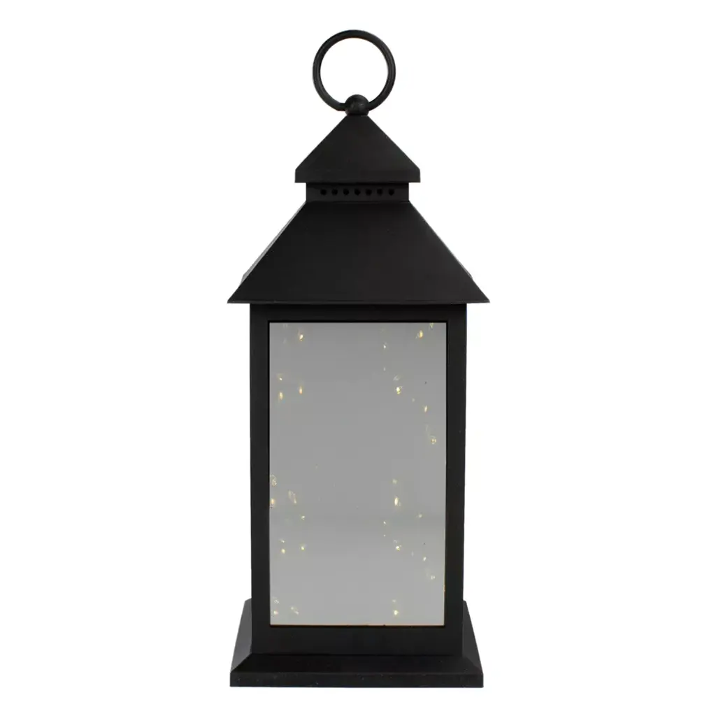Light up the night with the warm glow of this LED lantern. The classic design proves to fit with a relaxed or modern-day decor. This perfect lantern can be used as a nightlight, to light up your patio, or even to create a romantic glow for a special evening. Product Features: LED battery operated lantern 15 energy efficient LED warm white lights Provides a flickering effect light cast Features a mirror effect glass Plastic frame with handle Requires (3) "AAA" batteries- not included On/off switch located near battery pack Recommended for indoor use only Dimensions:12"H x 5.5"W x 5.5"D (14"H to top of handle) Material(s):plastic