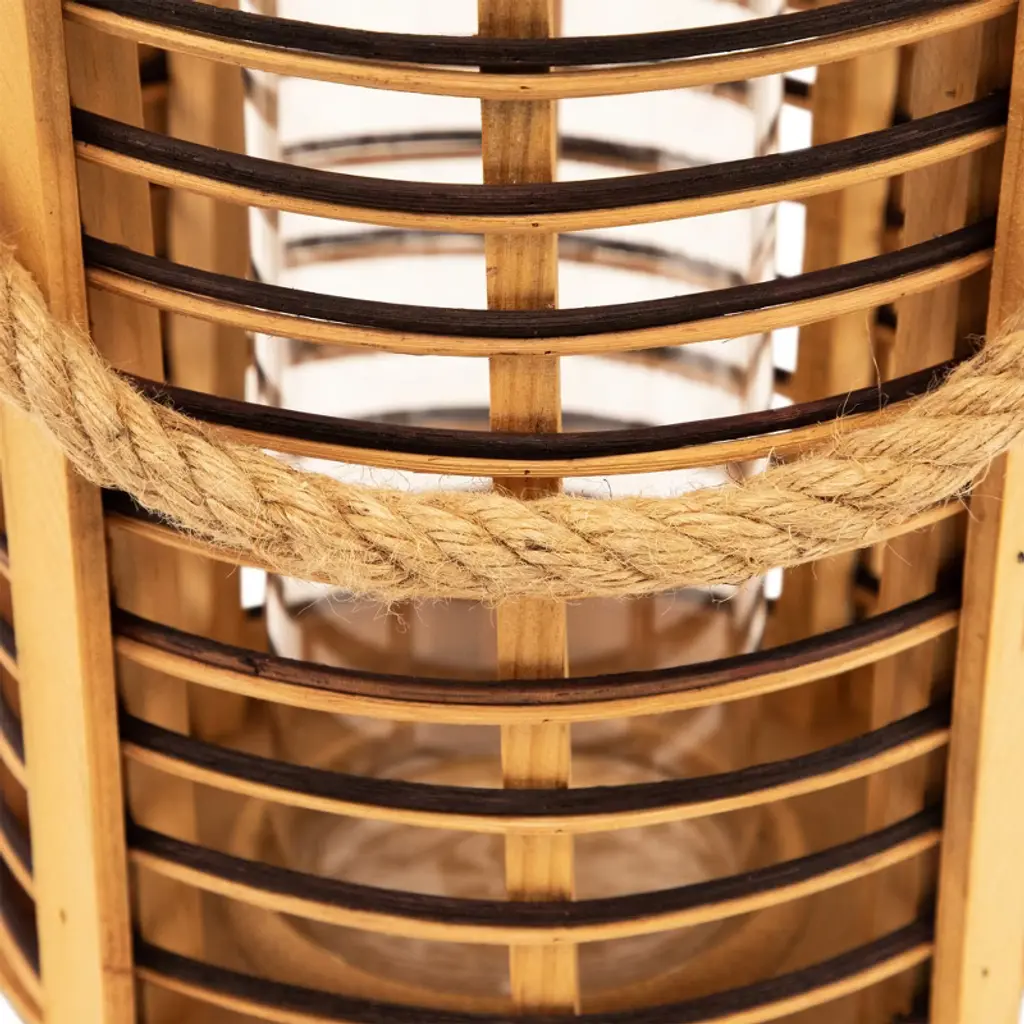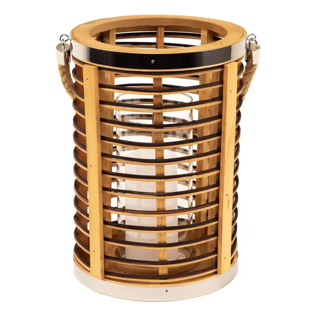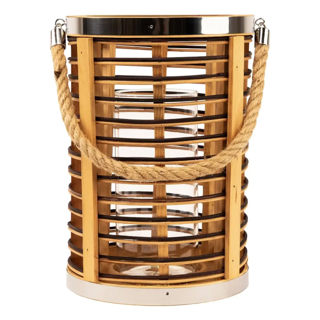 Add warmth and texture with this 11.5" rattan glass candle lantern. Designed with open-air sides and horizontal stripes of natural and dark-stained rattan, it brings a relaxed, coastal feel to any space. Metallic accents add a subtle shine, while the clear hurricane glass inside protects your candle flame. Sized to hold a pillar candle up to 3" in diameter, and finished with a sturdy jute rope handle for easy carrying or hanging indoors or out. Product Features: Natural and dark stained rattan Jute rope handle for easy hanging Fits a pillar candle up to 3" in diameter (not included) Recommended for indoor or outdoor covered use Dimensions: Overall: 11.5" high x 8" diameter Glass only: 8" high x 3.5" diameter Jute handle: 7.75" high x .5" wide Material(s): rattan/glass/metal/jute