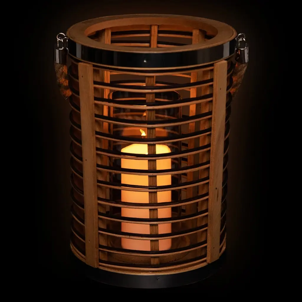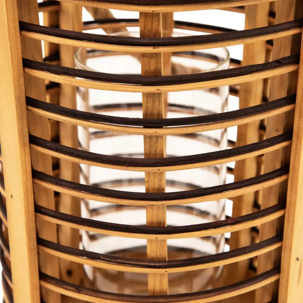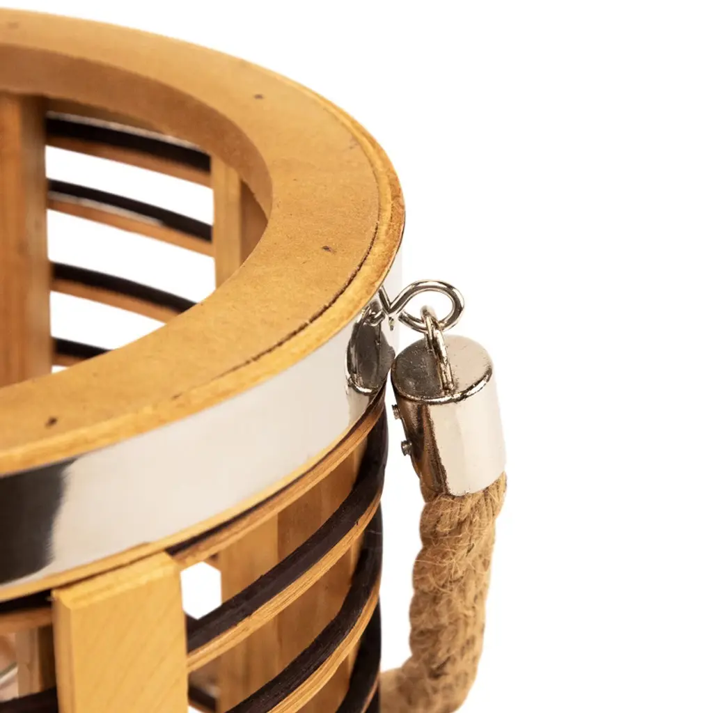 Add warmth and texture with this 11.5" rattan glass candle lantern. Designed with open-air sides and horizontal stripes of natural and dark-stained rattan, it brings a relaxed, coastal feel to any space. Metallic accents add a subtle shine, while the clear hurricane glass inside protects your candle flame. Sized to hold a pillar candle up to 3" in diameter, and finished with a sturdy jute rope handle for easy carrying or hanging indoors or out. Product Features: Natural and dark stained rattan Jute rope handle for easy hanging Fits a pillar candle up to 3" in diameter (not included) Recommended for indoor or outdoor covered use Dimensions: Overall: 11.5" high x 8" diameter Glass only: 8" high x 3.5" diameter Jute handle: 7.75" high x .5" wide Material(s): rattan/glass/metal/jute