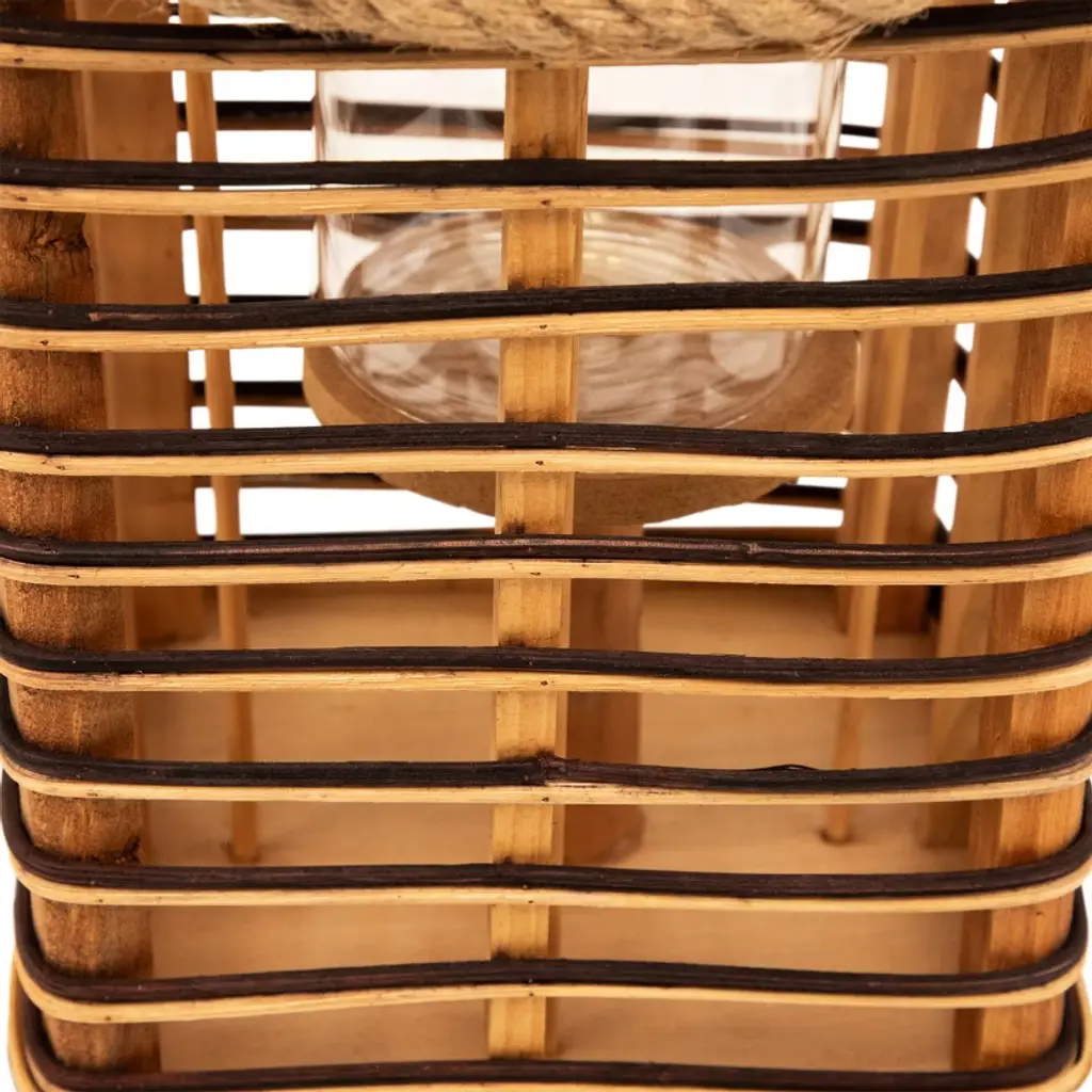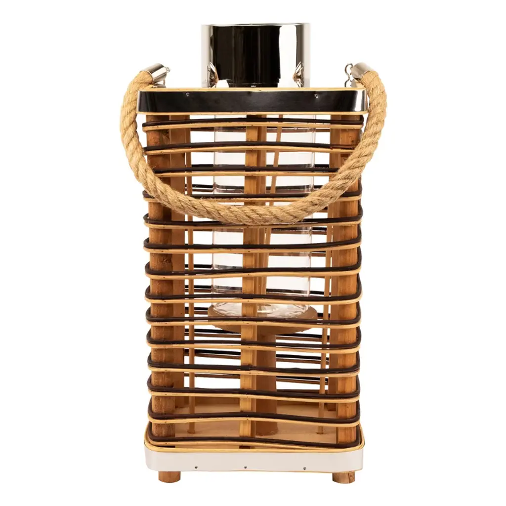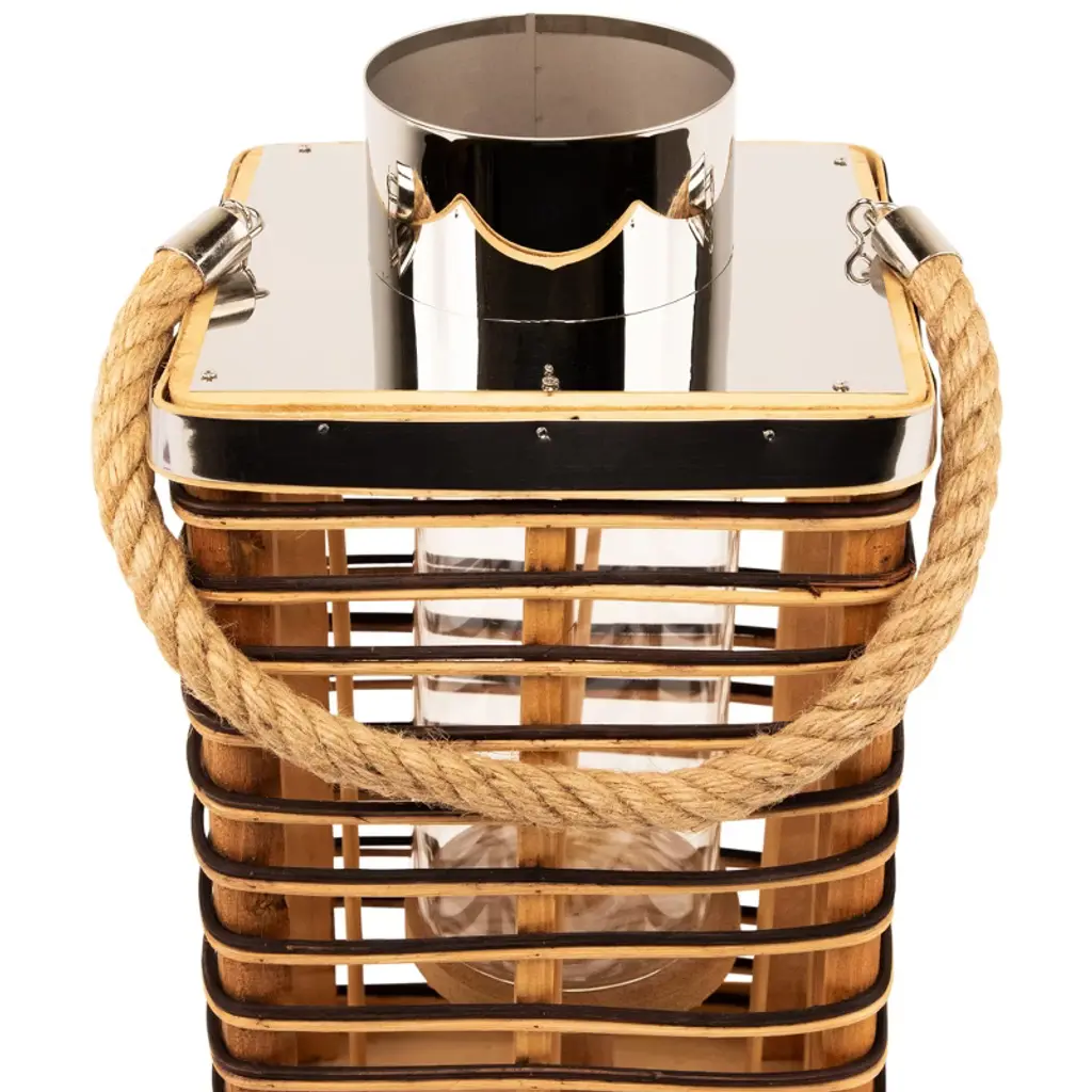 Bring warmth and texture to your space with this 15.5" rattan and glass candle lantern. The open-air design showcases horizontal bands of natural and dark-stained rattan, paired with metallic accents for a subtle contrast. A clear hurricane glass inside holds a pillar candle up to 3.25" in diameter, offering soft, steady light. The rectangular shape with rounded corners and a sturdy jute rope handle make it easy to carry or hang wherever you need a cozy glow. Product Features: Natural and dark stained rattan Jute rope handle for easy hanging Fits a pillar candle up to 3.25" in diameter (not included) Recommended for indoor or outdoor covered use Dimensions: Overall: 15.5"H x 7.25"W x 7.25"D Glass only: 7.75" high x 3.5" diameter Jute handle: 9" high x .5" wide Material(s): rattan/glass/metal/jute