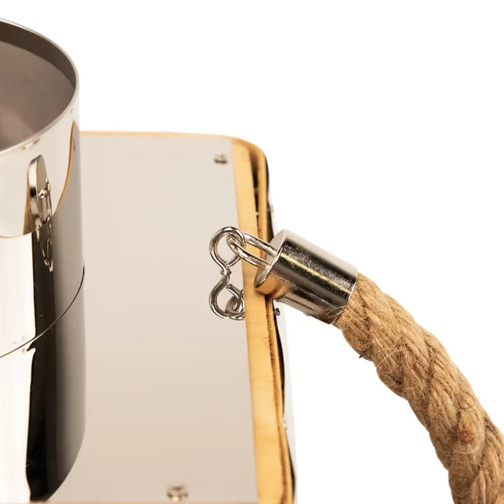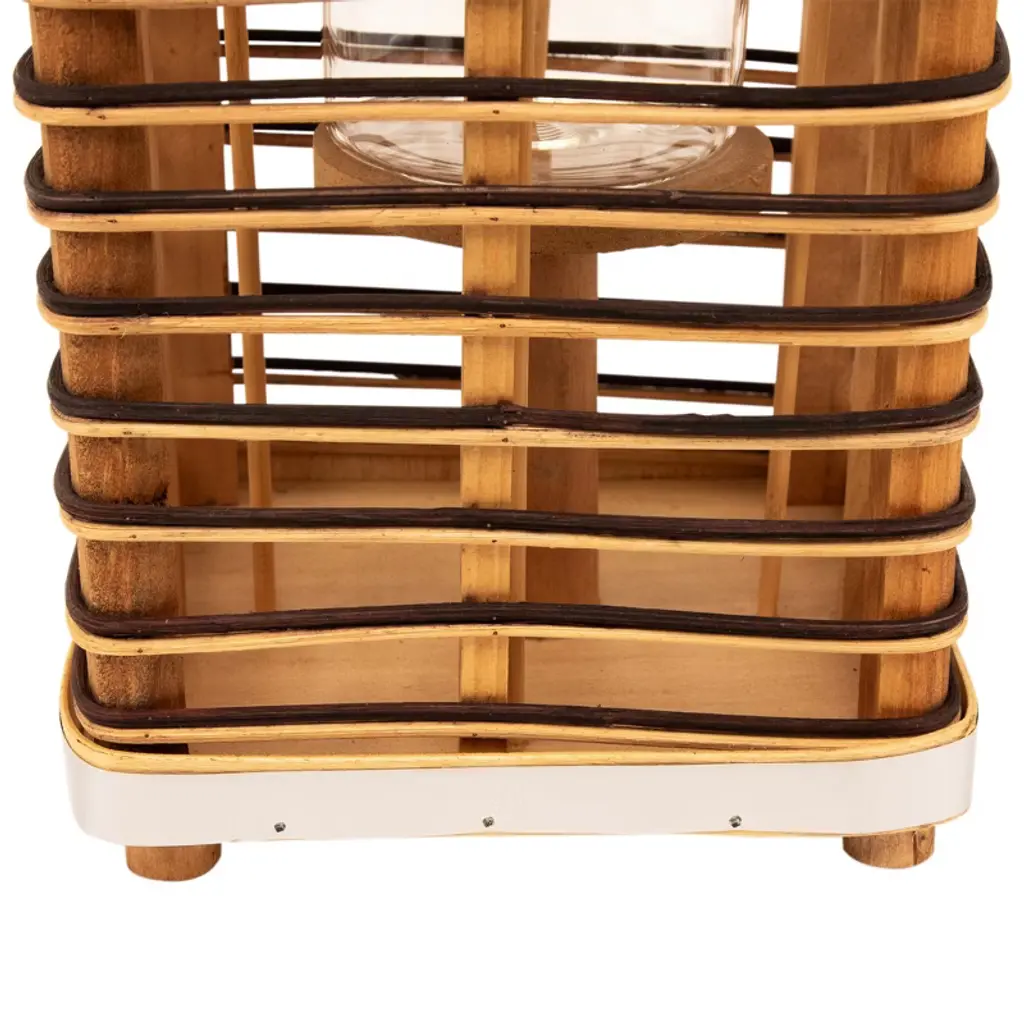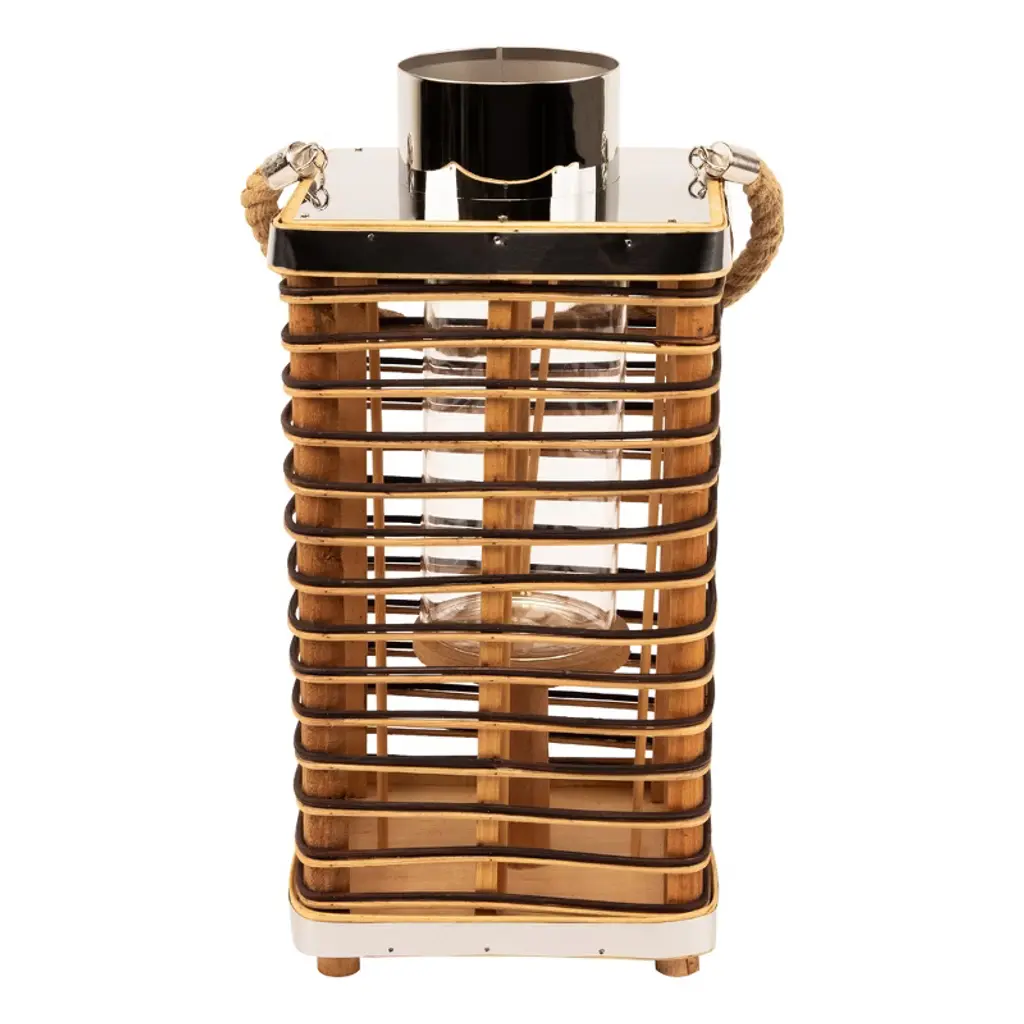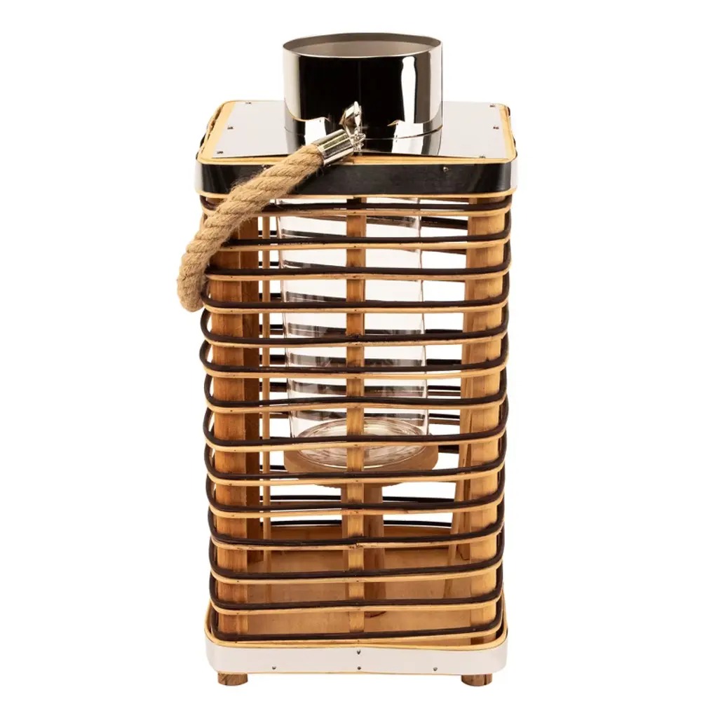 Bring warmth and texture to your space with this 15.5" rattan and glass candle lantern. The open-air design showcases horizontal bands of natural and dark-stained rattan, paired with metallic accents for a subtle contrast. A clear hurricane glass inside holds a pillar candle up to 3.25" in diameter, offering soft, steady light. The rectangular shape with rounded corners and a sturdy jute rope handle make it easy to carry or hang wherever you need a cozy glow. Product Features: Natural and dark stained rattan Jute rope handle for easy hanging Fits a pillar candle up to 3.25" in diameter (not included) Recommended for indoor or outdoor covered use Dimensions: Overall: 15.5"H x 7.25"W x 7.25"D Glass only: 7.75" high x 3.5" diameter Jute handle: 9" high x .5" wide Material(s): rattan/glass/metal/jute