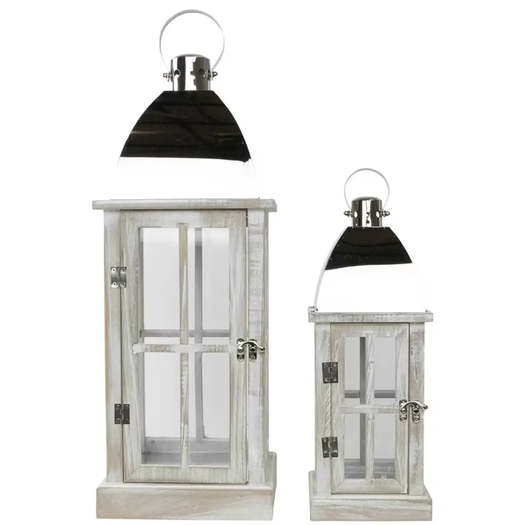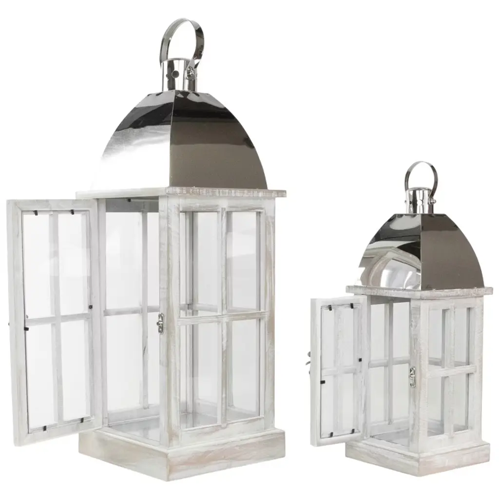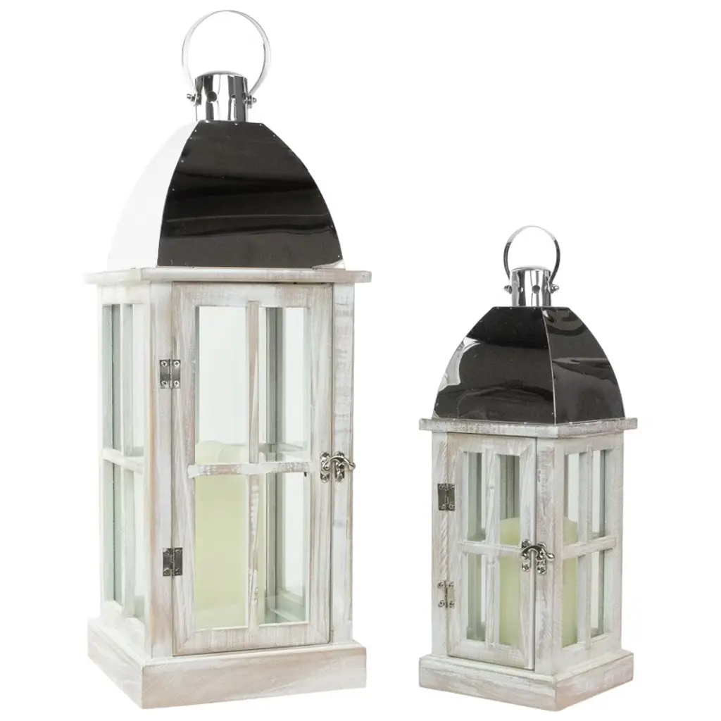 Lanterns accent any decor style from traditional to contemporary. Place a candle inside to create a cozy atmosphere. The perfect addition to bookshelves, mantle places, porches, or tables. The ring at the top can be used to hang the lantern. The distressed wood and glass are a great way to add a timeless rustic touch to your living space or a unique touch to holiday decor. Product Features: Set of 2 wooden antique white lanterns with silver tops Hinged doors for easy access Each lantern can hold (1) candle - not included Ring at the top allows you to hang the lantern Recommended for indoor use only - if using outdoors place in a covered area Dimensions: Large Lantern: 21.5"H x 8"W x 8"D Small Lantern: 15"H x 5.5"W x 5.5"D Material(s): wood/metal/glass