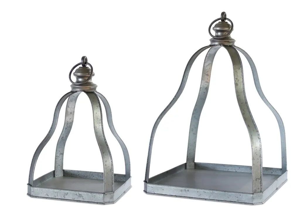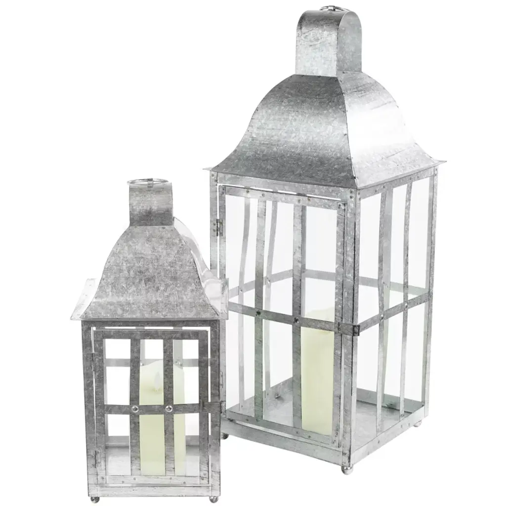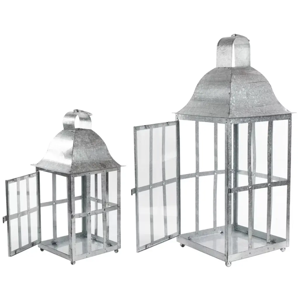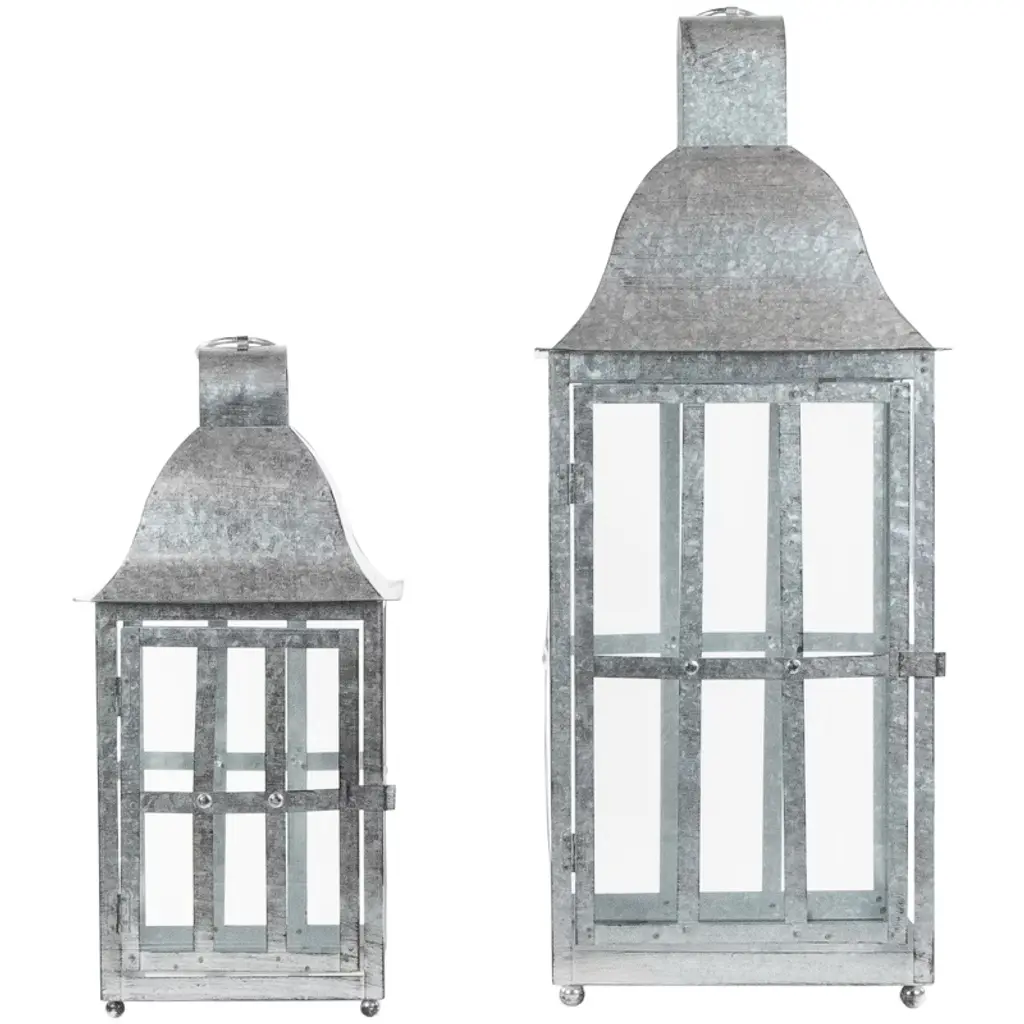Lanterns accent any decor style from traditional to contemporary. Place a candle inside to create a cozy atmosphere. The perfect addition to bookshelves, mantle places, porches, or tables. The ring at the top can be used to hang the lantern. The sleek metal and glass are a great way to add a timeless chic touch to your living space or a unique touch to holiday decor. Product Features: Set of 2 distressed galvanized metal candle lanterns Hinged doors for easy access Each lantern can hold (1) candle - not included Ring at the top allows you to hang the lantern Recommended for indoor use only - if using outdoors place in a covered area Dimensions: Large Lantern: 23.75"H x 9.75"W x 9.75"D Small Lantern: 16.25"H x 7.75"W x 7.75"D Material(s): metal/glass