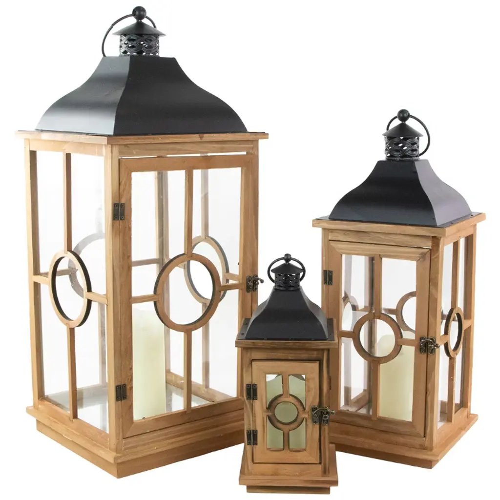 Lanterns accent any decor style from traditional to contemporary. Place a candle inside to create a cozy atmosphere. The perfect addition to bookshelves, mantle places, porches, or tables. The ring at the top can be used to hang the lantern. The wood and glass are a great way to add a timeless rustic touch to your living space or a unique touch to holiday decor. Product Features: Set of 3 natural wood candle lanterns with black metal tops Hinged doors for easy access Each lantern can hold (1) candle - not included Ring at the top allows you to hang the lantern Recommended for indoor use only - if using outdoors place in a covered area Dimensions: Large Lantern: 26.5"H x 11.25"W x 11.25"D Medium Lantern: 20.5"H x 8.25"W x 8.25"D Small Lantern: 13"H x 5.75"W x 5.75"D Material(s): wood/metal/glass