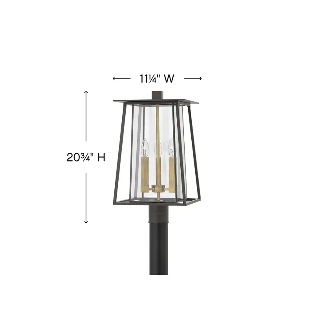 Tarawa has roots in the American West with its large scale, strong angular lines and no-nonsense style. The sturdy aluminum and brass construction features finish of bold buckeye bronze and heritage brass. A welded outer form frames an inner clear, bound glass shade.
