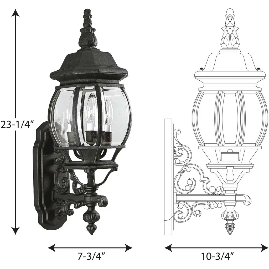 Detailed finials, end caps and scroll work in a durable power coat finish, featuring clear beveled glass panels and cast aluminum frames. Three-light wall lantern.