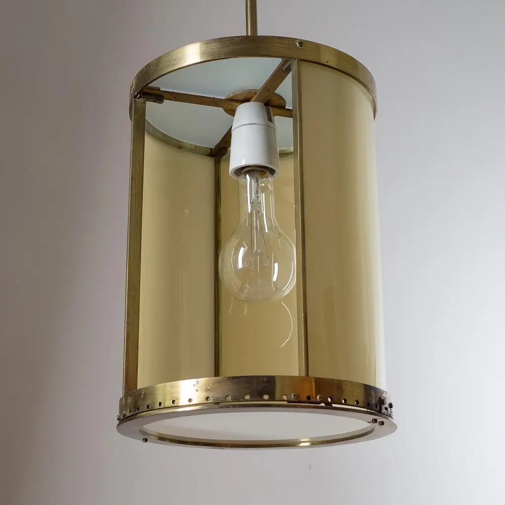 Rare oversize drum lantern from the 1930s. Minimalist brass-plated steel structure with sand-colored curved glass. Bottom glass has a white casing, top glass segments are frosted. One ceramic E40 socket (for industrial strength bulbs).