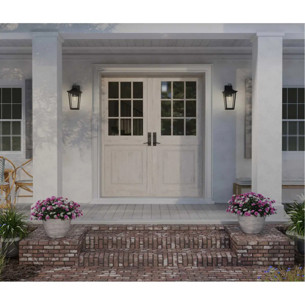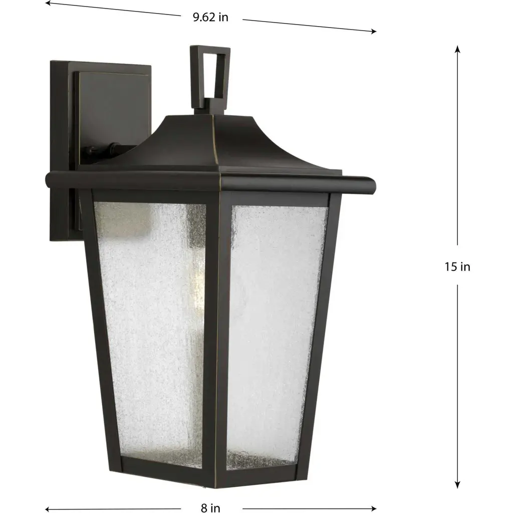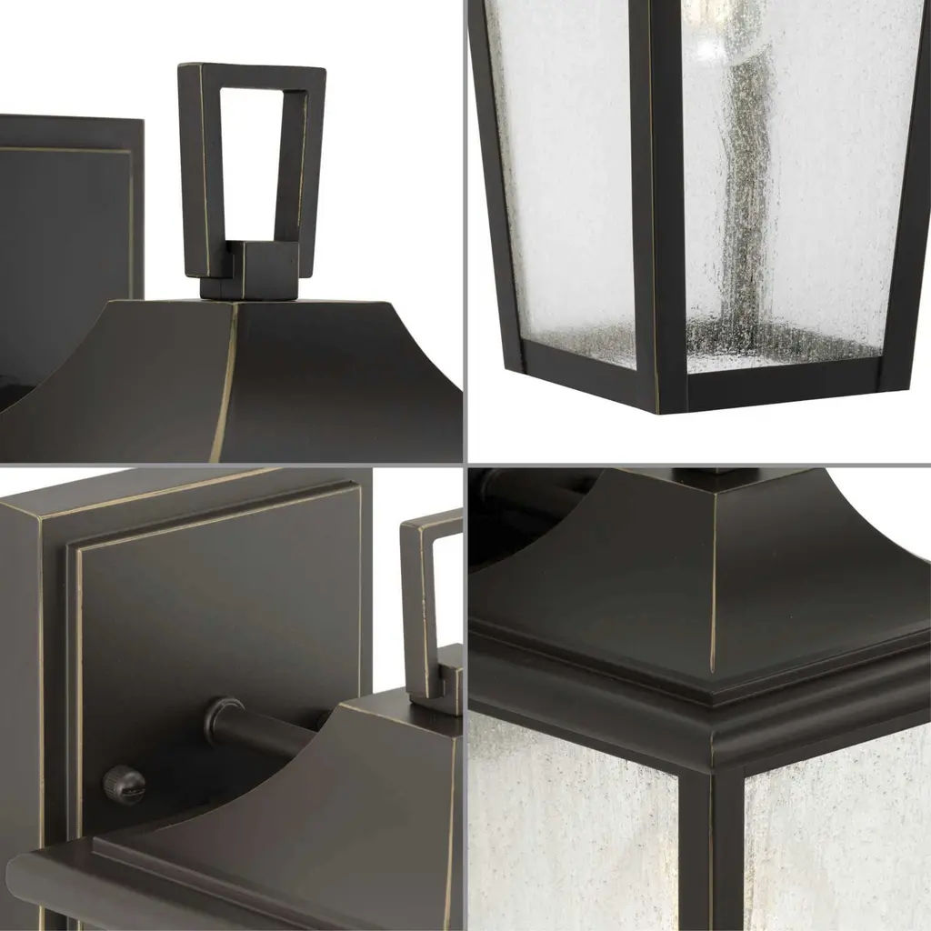 Feature a clean, tapered form reminiscent of traditional coach lanterns with a traditional outdoor wall lantern light from the Padgett Collection. The angular finial coated in a handsome antique bronze finish adds a contemporary flair to the classic design. Clear seeded glass adds a touch of extra visual texture Perfect for both indoor and outdoor applications.