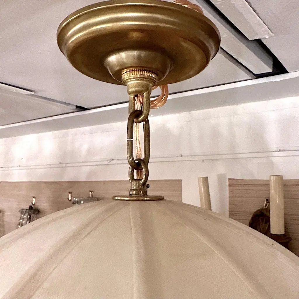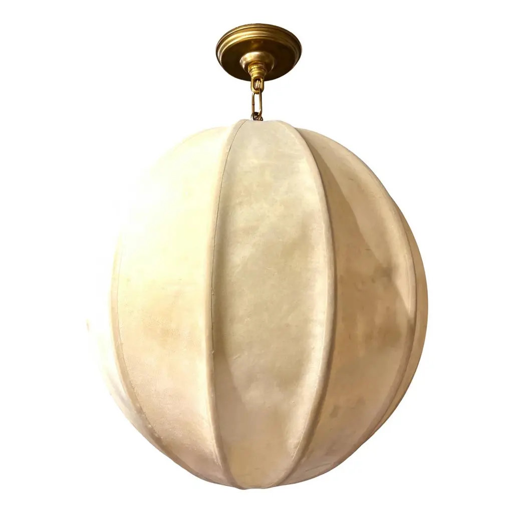 Pair of circa 1960's Italian hand-stitched parchment lanterns with a single interior light. Sold individually.Measurements:Height of body: 19"Width: 18"Current drop: 25"