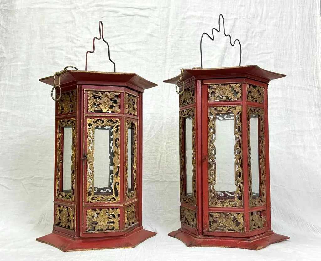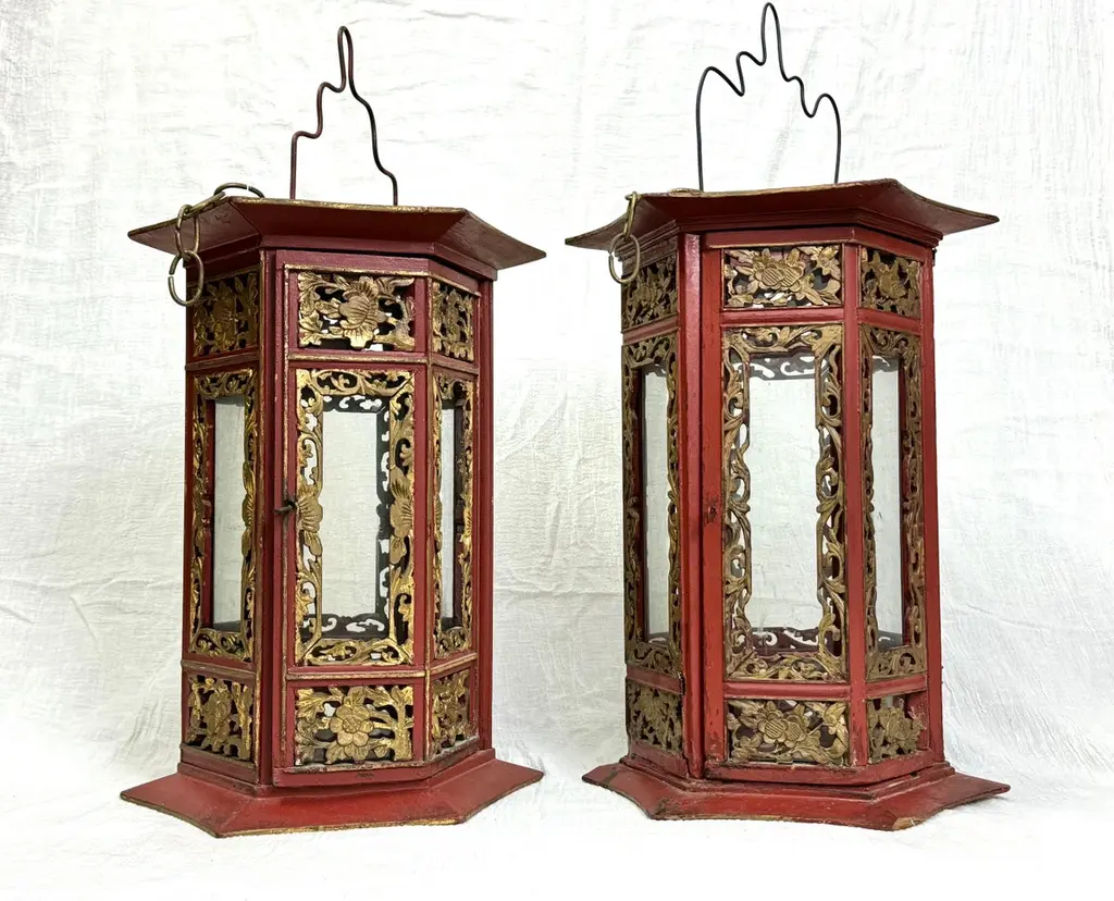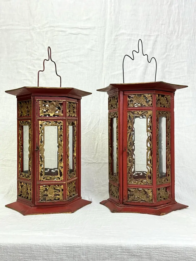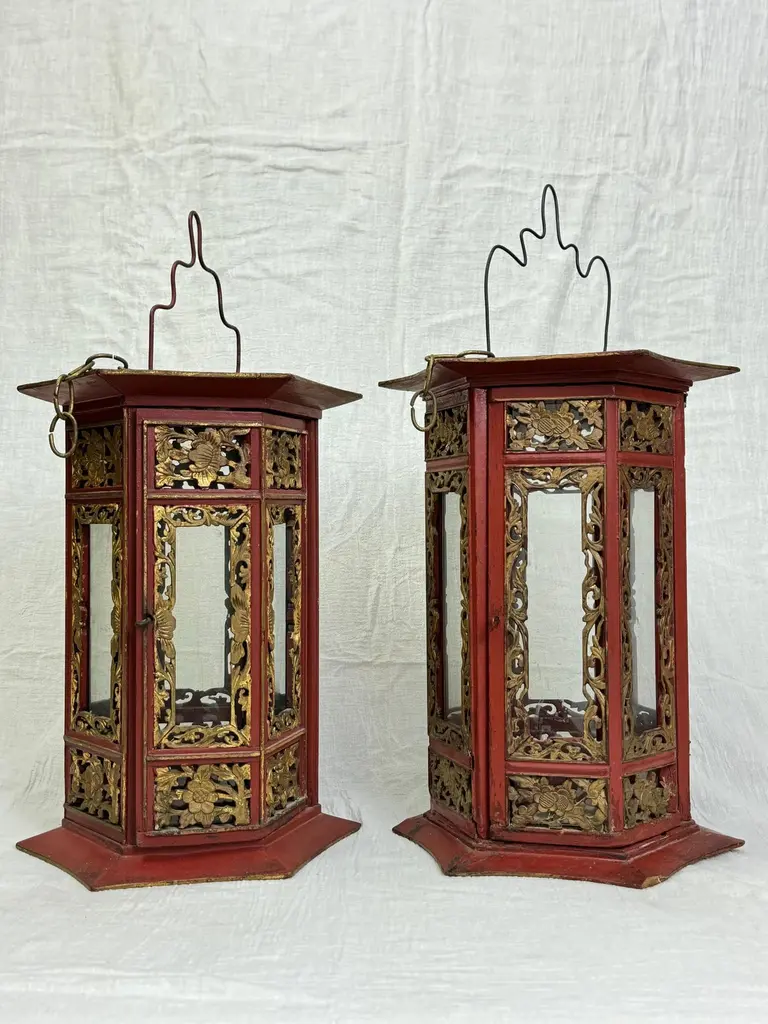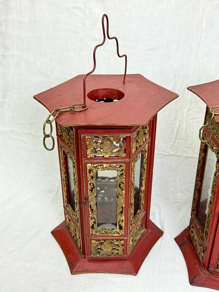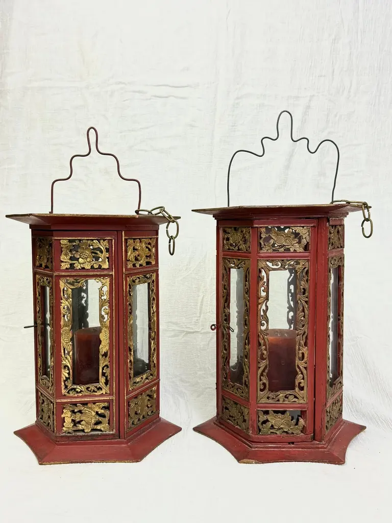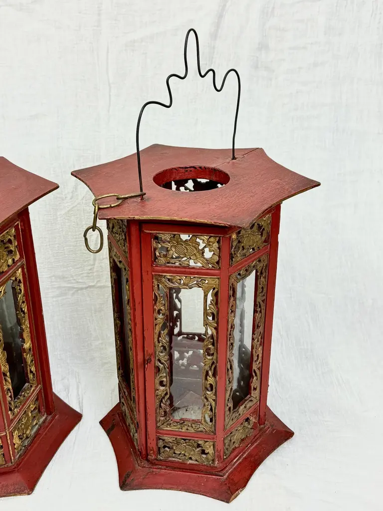 Pair of Asian Hand Carved Wooden Lanterns. Nice decorative pair in a rich cinnabar color. This pair is not identical but very similar. Heavily carved gilt wood with amazing detail. Hinged glass doors open to insert a large candle. Iron handles to carry in or outdoors. Price is for the pair, a set of 2. please message for an accurate parcel quote as 1stdibs prices are wrong.