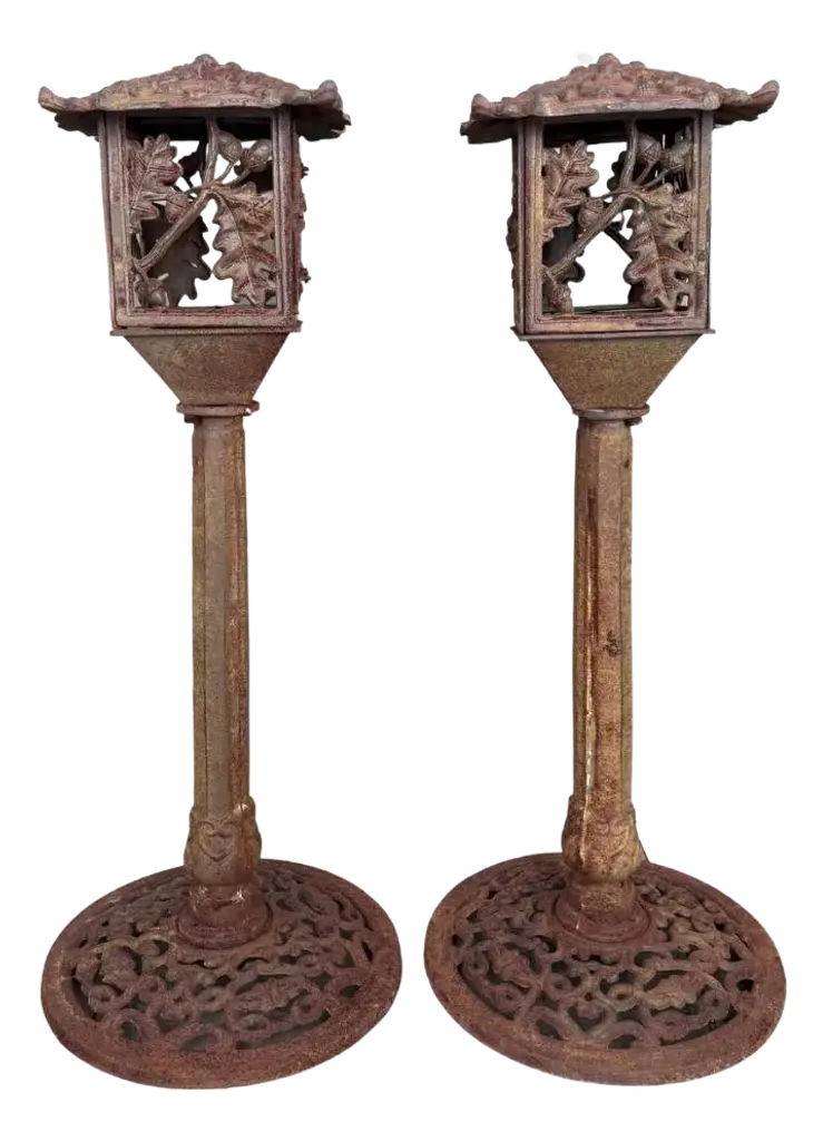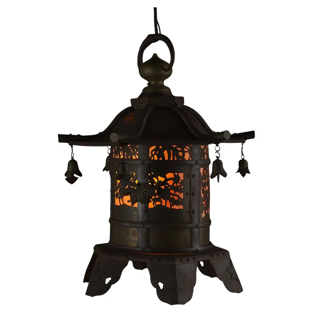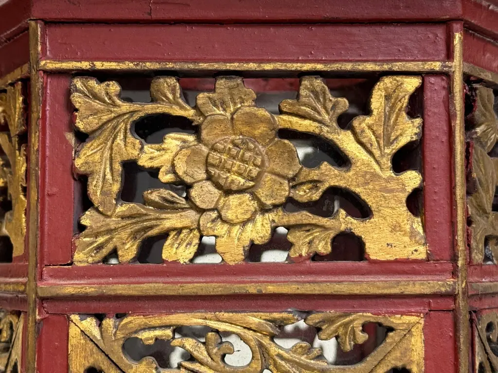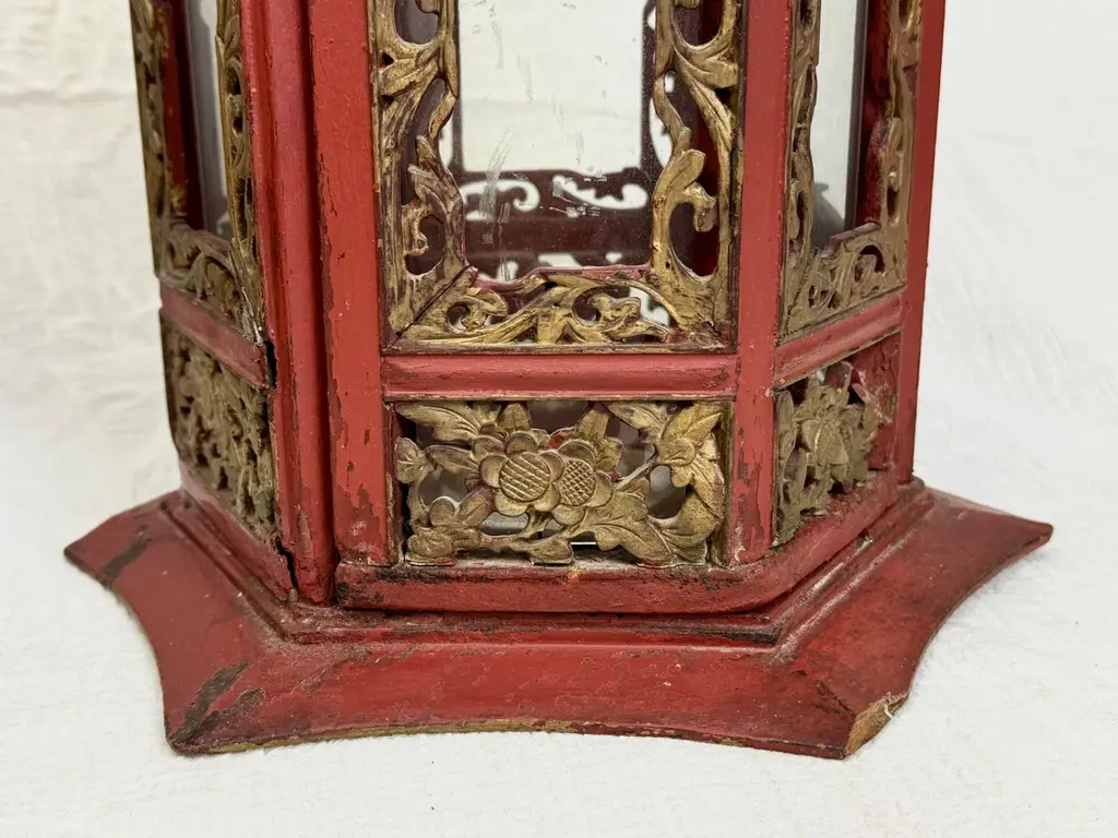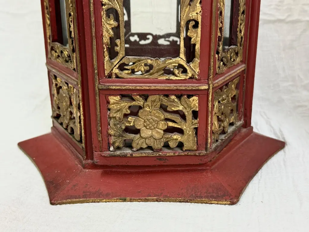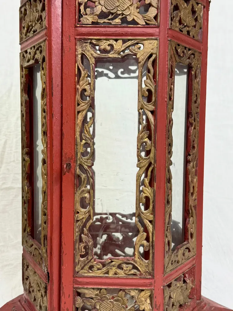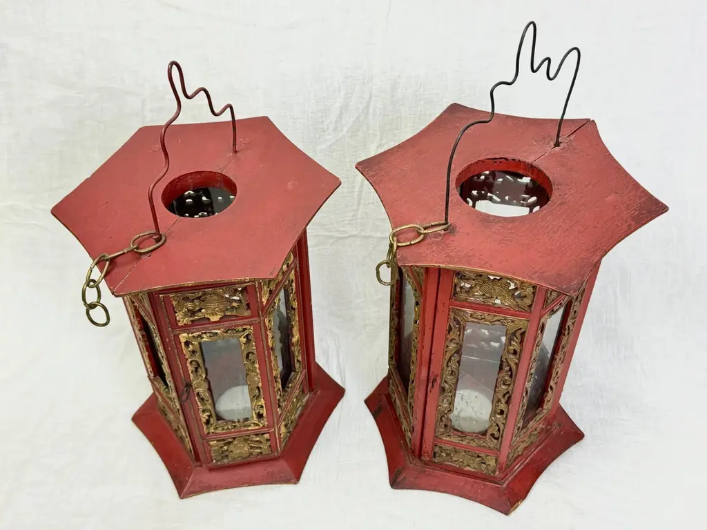 Pair of Asian Hand Carved Wooden Lanterns. Nice decorative pair in a rich cinnabar color. This pair is not identical but very similar. Heavily carved gilt wood with amazing detail. Hinged glass doors open to insert a large candle. Iron handles to carry in or outdoors. Price is for the pair, a set of 2. please message for an accurate parcel quote as 1stdibs prices are wrong.