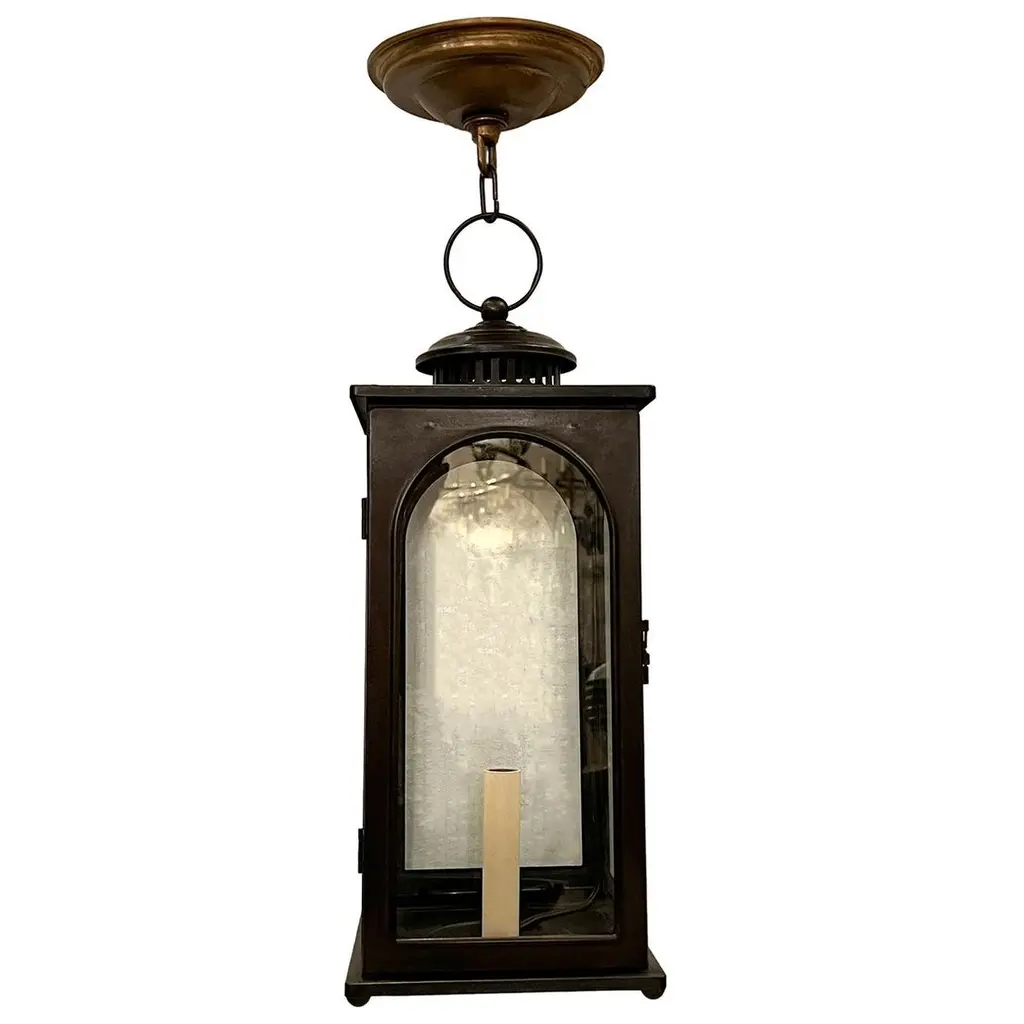 Pair of 1950’s patinated bronze lanterns with interior light.Sold individually.Measurements:Current drop: 22?Length/width: 7? square.