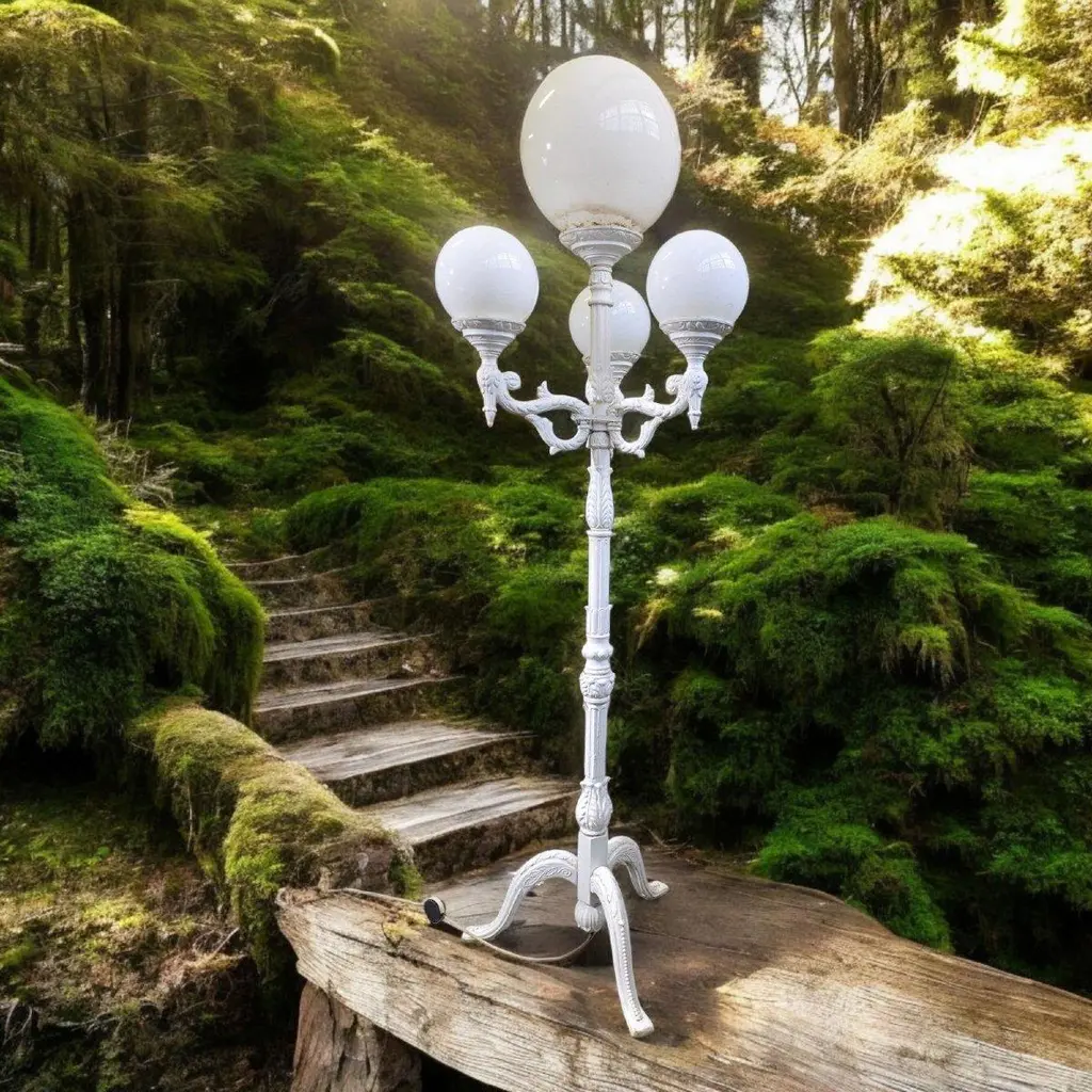 Pair of Large Garden Lanterns – 1970sEra: 1970sMaterial: Painted MetalColor: WhiteDimensions: 180 x 50 x 50 cm (each)A superb pair of vintage white painted metal garden lanterns, made in the 1970s. Their elegant and classic design adds a decorative and functional touch to gardens, patios, or property entrances.Both pieces are electrically powered and ready to install. The sturdy metal structure is ideal for outdoor use, with geometric details that evoke a mid-century retro style.Condition: Very good, with slight signs of age that reinforce its authenticity.