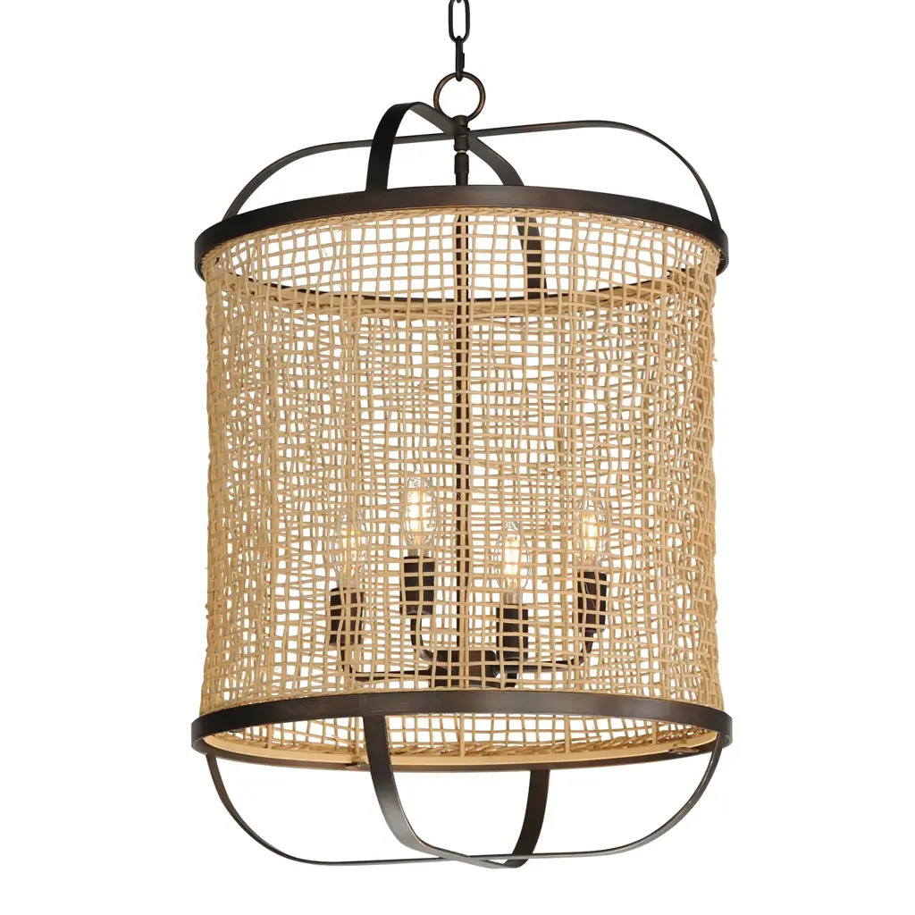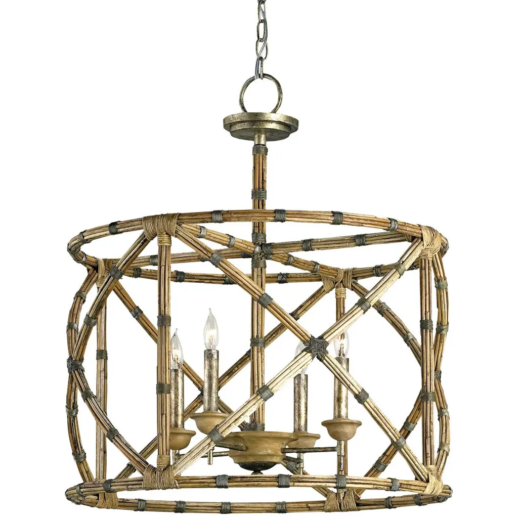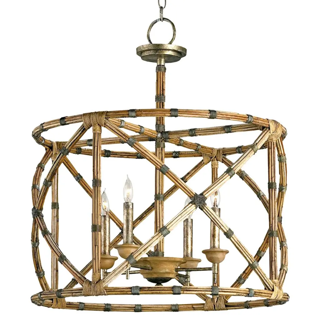The Currey & Company Palm Beach Lantern appeals with a simple form and the deft use of natural materials. Its overall shape is an open, airy drum, with a strong wrought iron frame surrounded by arurog reeds and further accented by warm bamboo. The wrought iron left exposed is finished in a shimmering golden Pyrite Bronze.