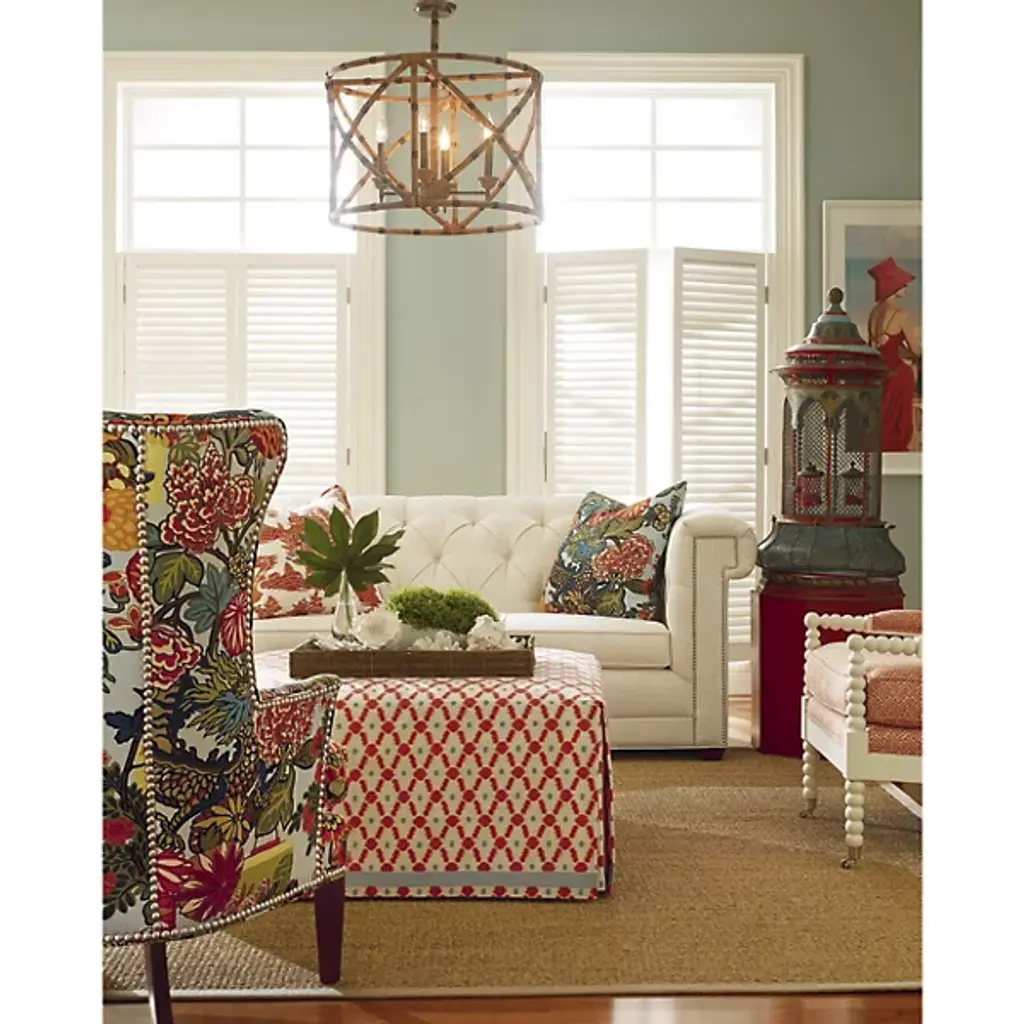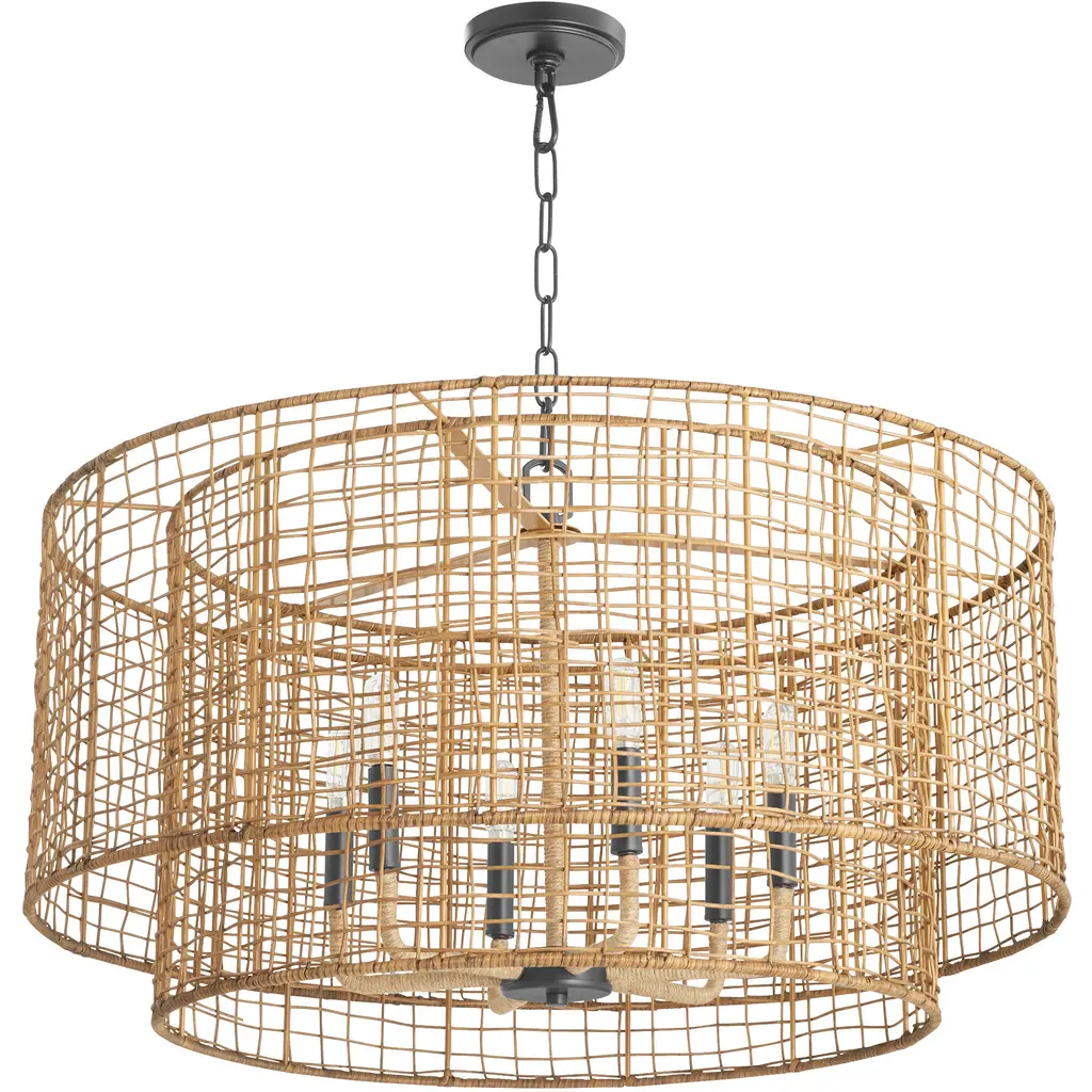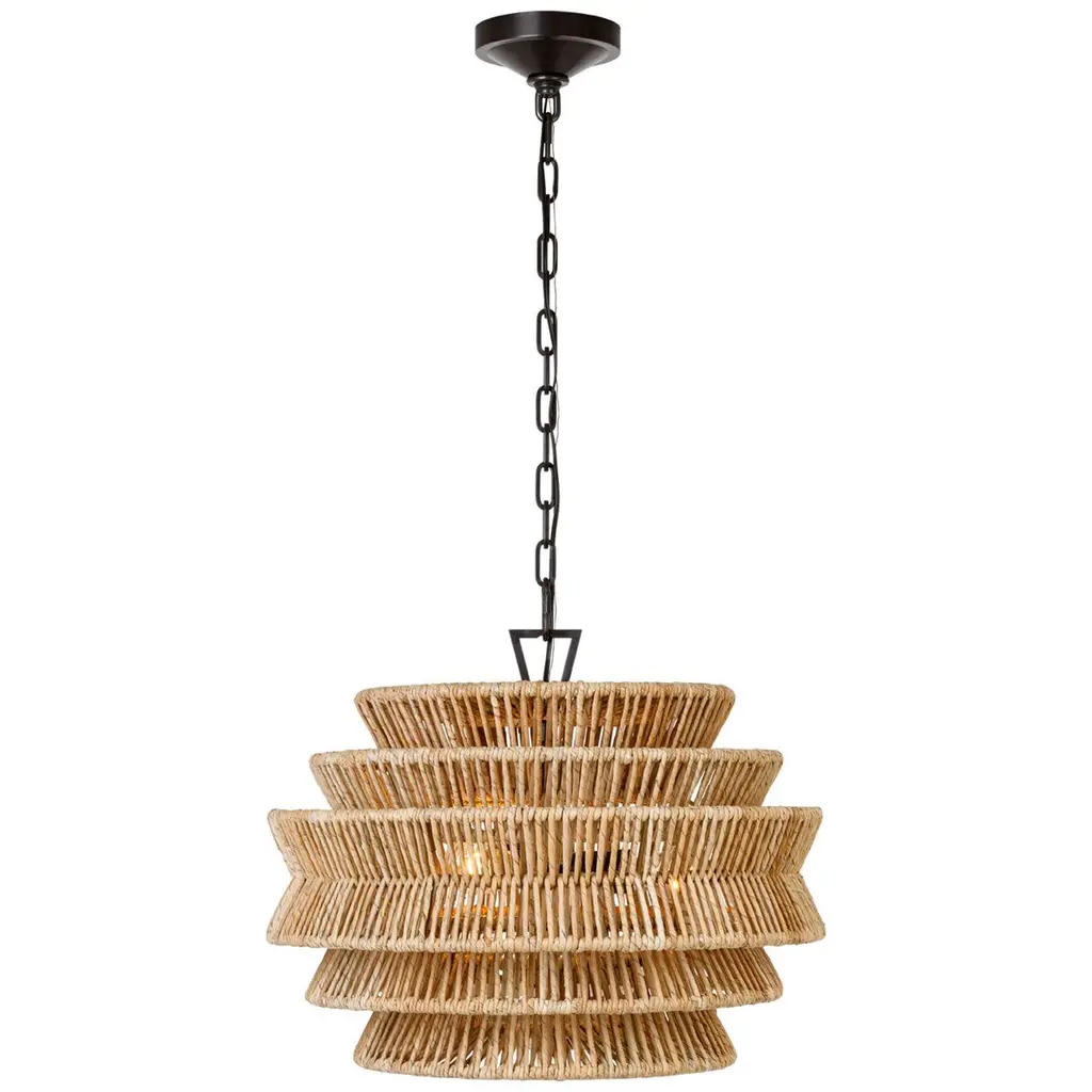 The Currey & Company Palm Beach Lantern appeals with a simple form and the deft use of natural materials. Its overall shape is an open, airy drum, with a strong wrought iron frame surrounded by arurog reeds and further accented by warm bamboo. The wrought iron left exposed is finished in a shimmering golden Pyrite Bronze.