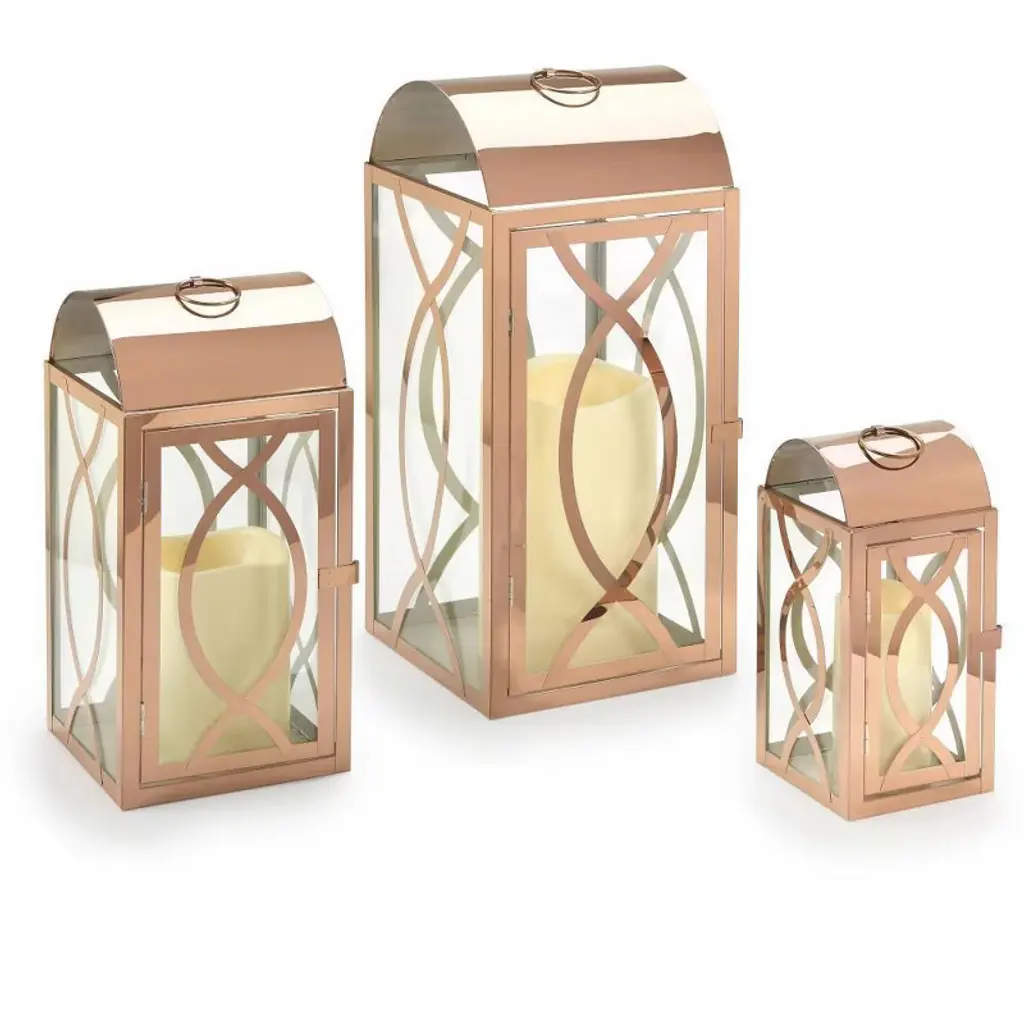The Rogan Lantern Set features a sleek and shiny rose gold finish. Metal construction and glass tempered window panes foster durability and safety for use both indoors and outdoors. Lanterns feature easy-to-open doors for styling and candle customization. LED candles sold separately. Product Dimensions: Large lantern measures 9" L x 9" W x 20.5" H Medium Lantern measures 7" L x 7" W x 15" H Small Lantern measures 5" L x 5" W x 11" H