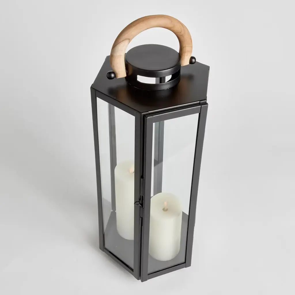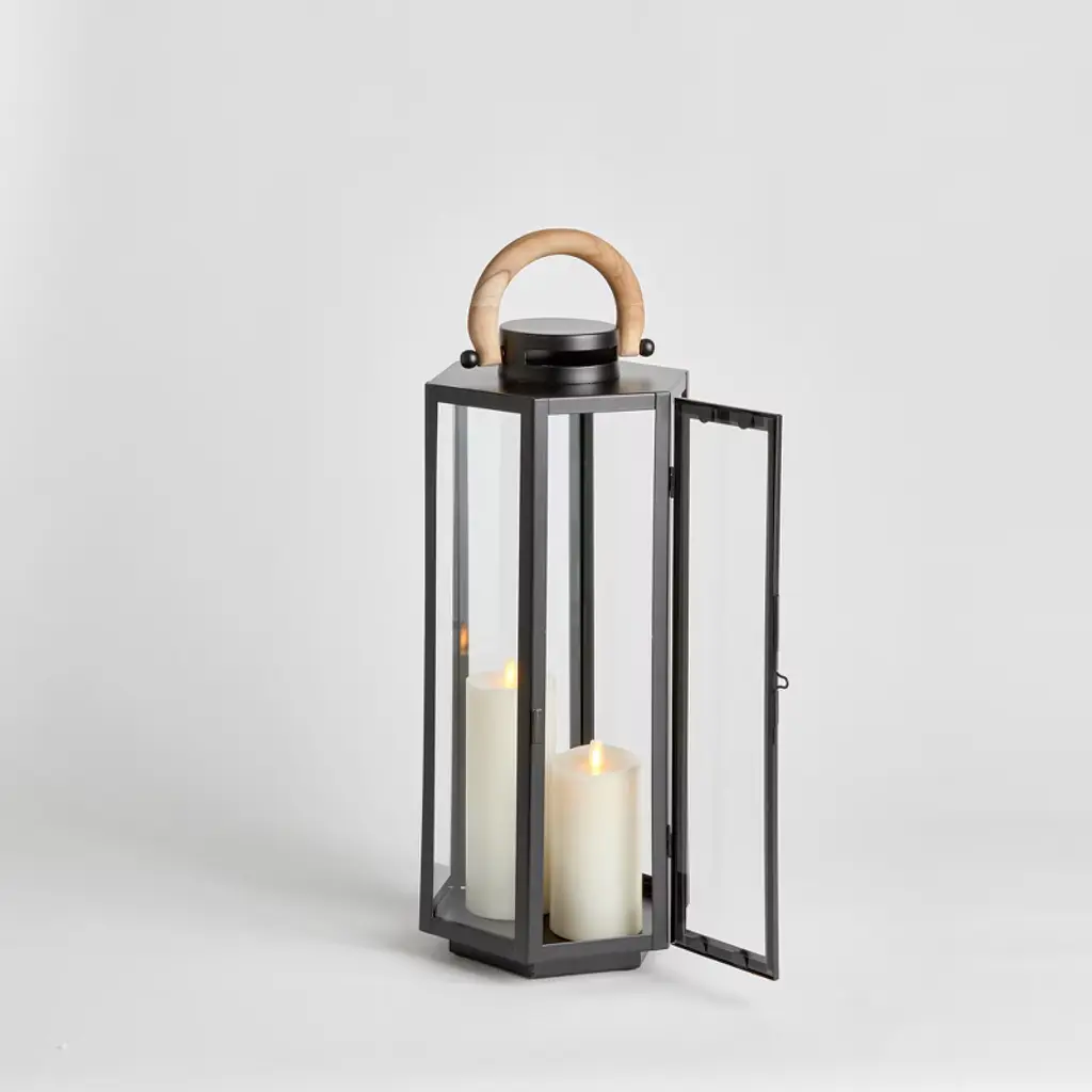 This matte black six panel lantern is made of iron and features a natural teak handle. Impressive in scale, it is a handsome outdoor accent by the pool, or at the front entry.