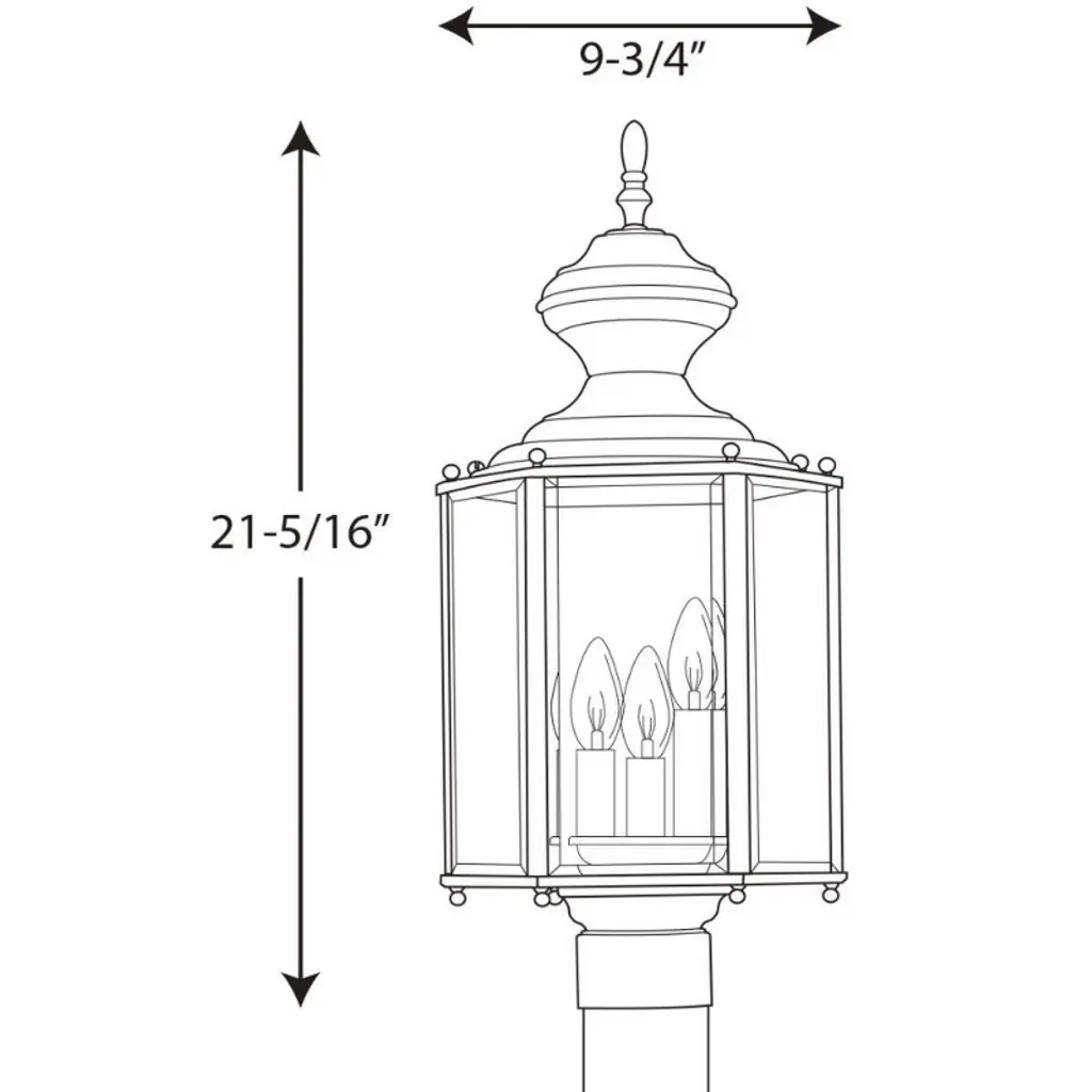 Introducing the Progress Lighting Air Pro Collection Post Lantern. Crafted from solid brass with a Matte Black BrassGuard finish, this traditional hexagonal style lantern exudes timeless elegance. The clear beveled glass panels allow for a warm, inviting glow. Measuring 9.75" in width and 21.31" in height, this wet-rated lantern is designed to fit on a 3" post. With a Lamping Type of Incandescent and a wattage of 60 Watts, it accommodates 3 bulbs. The included shade measures 4.5 x 9.5 inches, adding to its classic appeal. Illuminate your outdoor space with this stunning and durable post lantern from Progress Lighting.