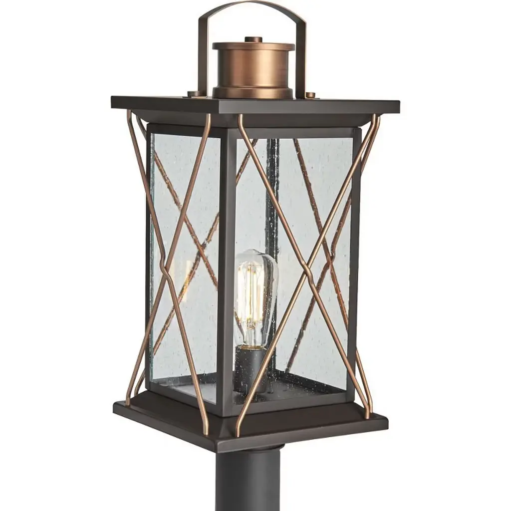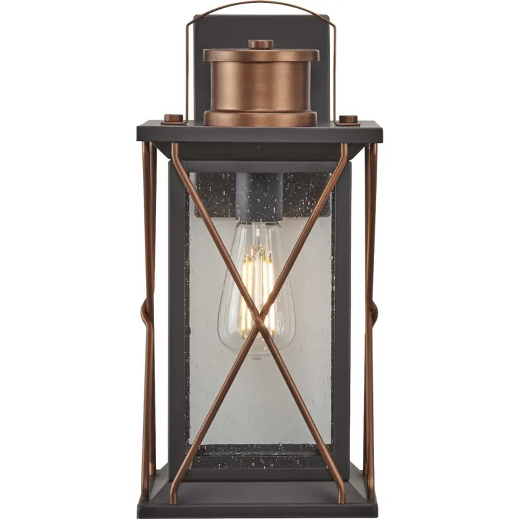 Introducing the Barlowe Collection from Progress Lighting, featuring the small wall lantern crafted from durable steel with an antique bronze finish. The lantern measures 7.5" in width, 16" in height, and 7.5" in length, with a depth of 8.5". It has a height from the outlet box of 3.5" and a backplate width of 4.5" and length of 5.5". This incandescent lantern requires one 100-watt bulb and is wet rated for outdoor use. The rustic X-brace design and clear seeded glass panes exude farmhouse charm, while the antique bronze finish with white accents adds warmth and character. Assembly is required, and the shade dimensions are 5" x 9.5". Transform your home into a warm and cozy dream with this friendly farmhouse-style lantern, perfect for illuminating and enhancing your outdoor space.