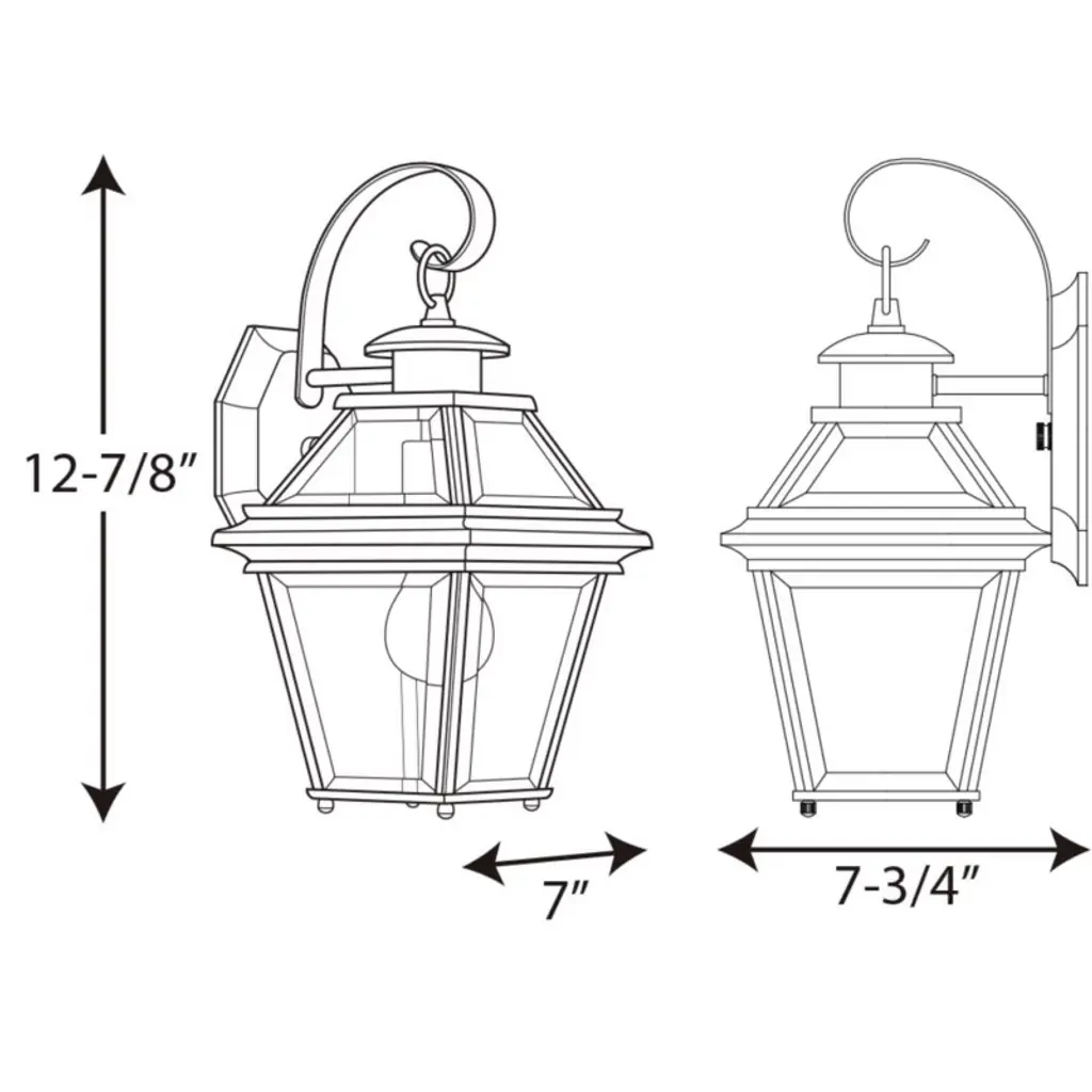 Introducing the Progress Lighting Burlington Collection one-light wall lantern. Crafted from durable steel with a weather-resistant aluminum construction, this lantern is designed to withstand the elements. The Antique Bronze finish adds a touch of elegance, while the clear beveled glass complements the design. With a width of 7" and a height of 12.88", this wet-rated lantern is suitable for outdoor use. The open bottom design allows for easy bulb replacement without removing the glass shade. With a backplate width of 4.75" and a length of 5.5", this lantern is both practical and stylish. The incandescent bulb with a wattage of 100 watts provides ample illumination. Elevate your outdoor space with the timeless charm of the Burlington wall lantern.